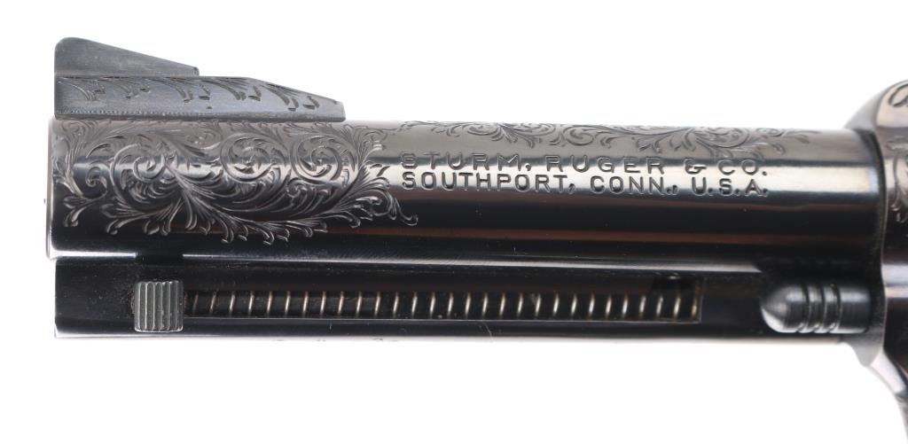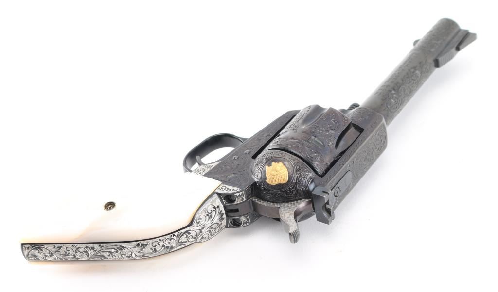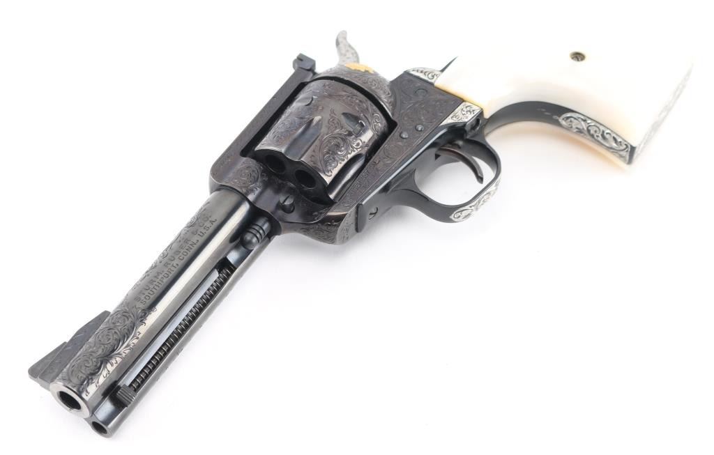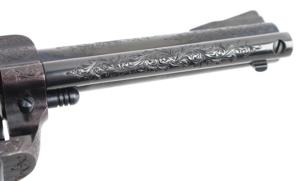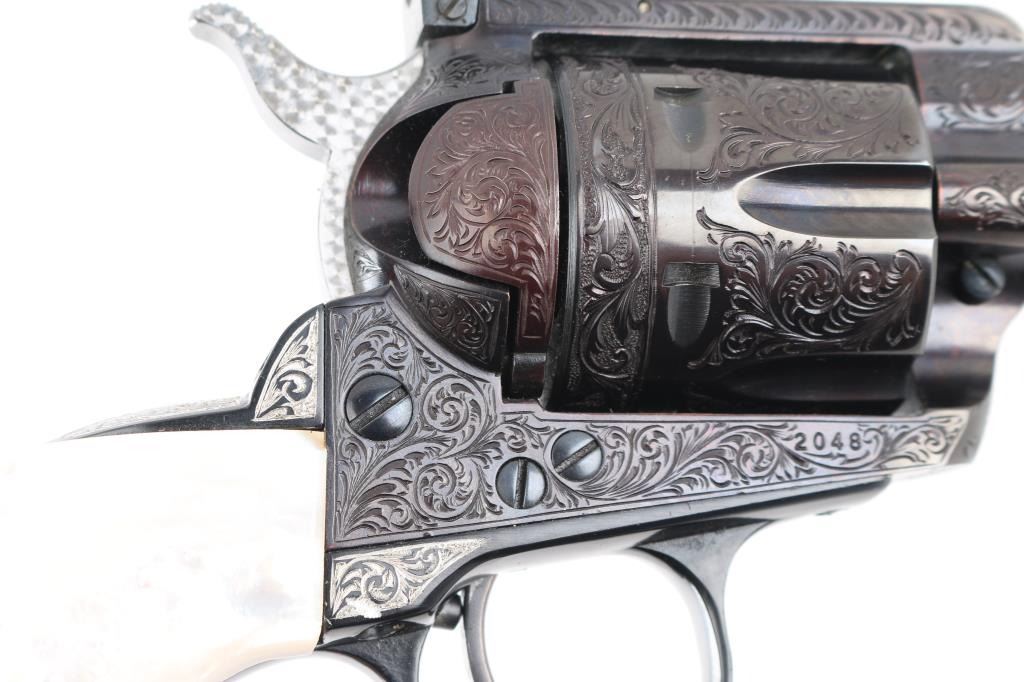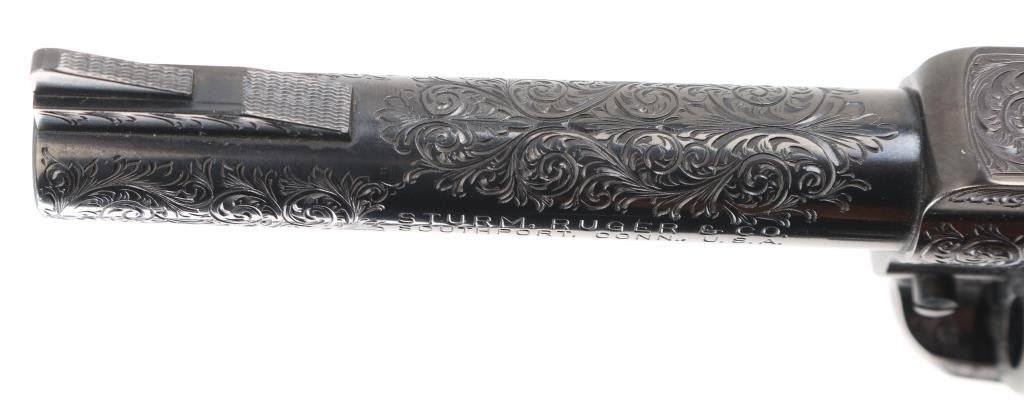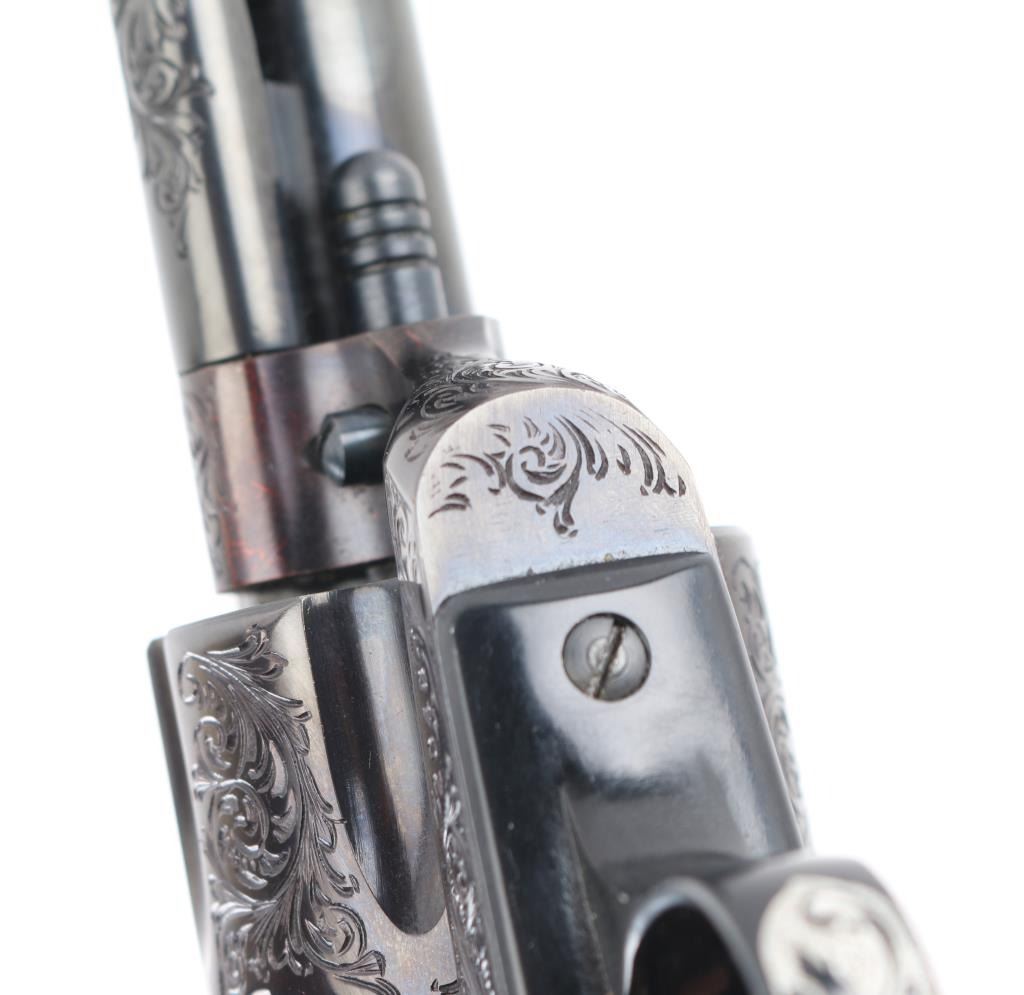 Old Model Flattop American made six shot revolver chambered for .357 ammunition. It has a 4.75" barrel, Manufactured 1956 2nd year production, blued refinish,fluted cylinder, raised front sight, adjustable rear sight, smooth trigger, jeweled hammer with serrated spur, and mother of pearl grips . This gun has been finely and fully engraved with floral scroll, and an embossed gold indian head on the recoil sheild. Revolver retains nearly all of its reblud finish showing very little wear. The loading gate has turned to plum and the grip strap engraving has been left in the white. Action is sound with very good lock up and bore is excellent and the mother of pearl grips are fine with a small lost to the top right panel, Condition is NRA Excellent as refinished *Modern Firearm*