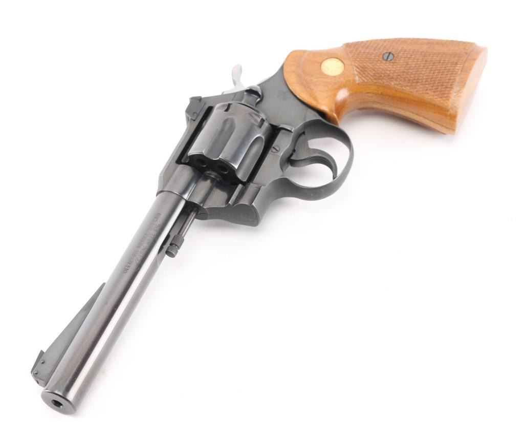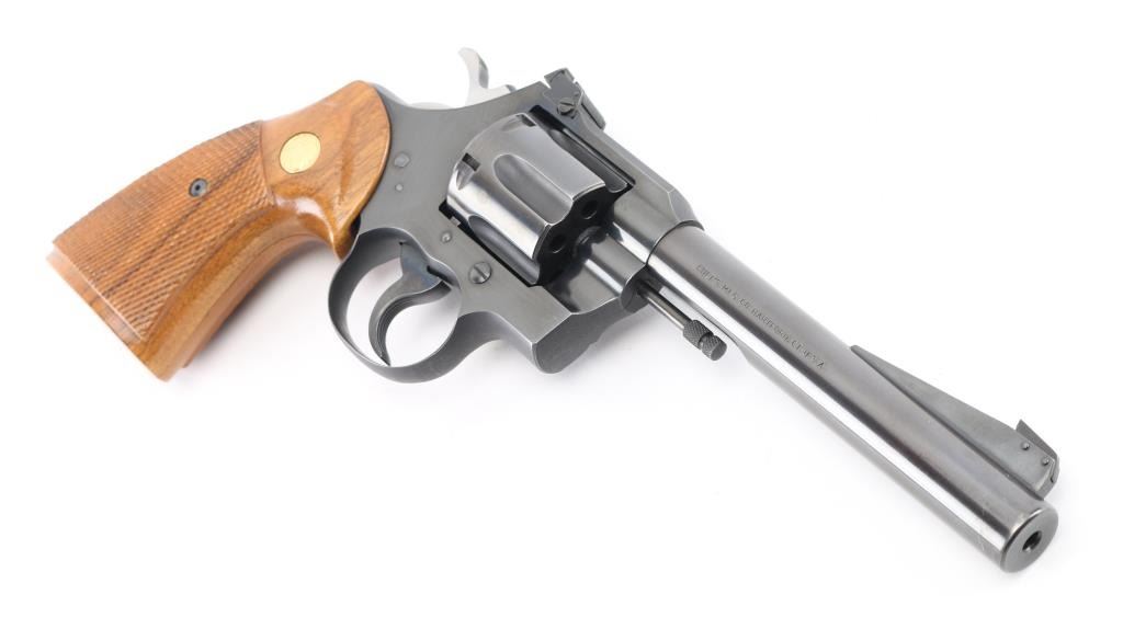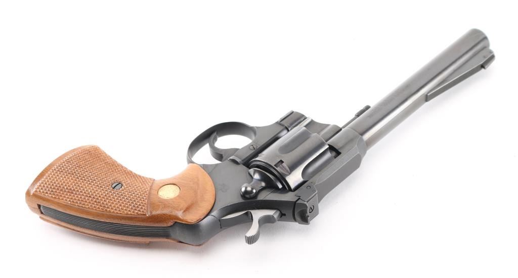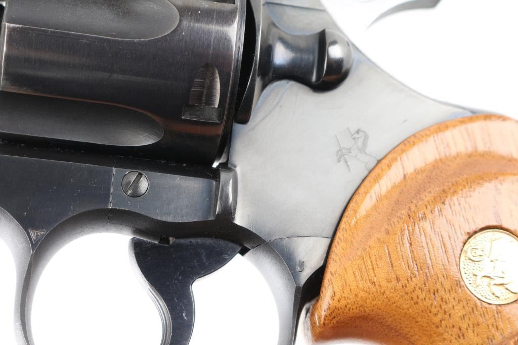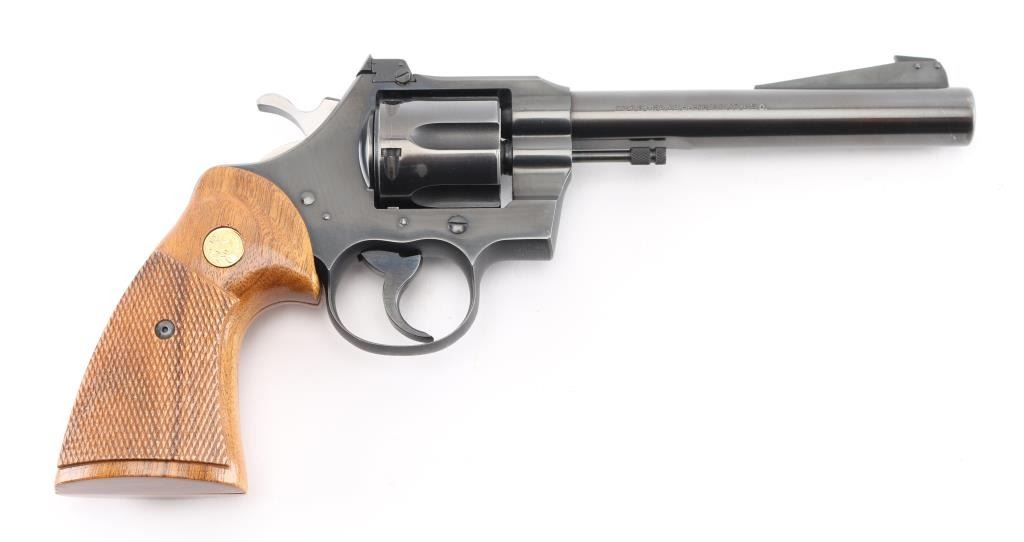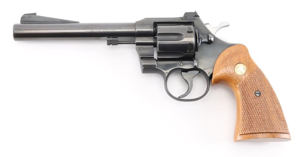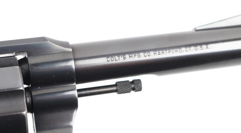 American made revolver, manufactured circa 1951, SA/DA, polished black barrel, matte black frame, swing out cylinder, six shot, approximately 6" barrel, bore and cylinders are bright, blade front sight mounted on a serrated ramp, adjustable open notch rear sight, serrated hammer spur and trigger, checkered wood grips with gold-tone Colt logos, action is crisp, approximately 98% of finish remains, rub marks on barrel around the crown, the crown appears unmarked, light scratches on frame. **NRA Excellent** Modern Firearm C&R Eligible