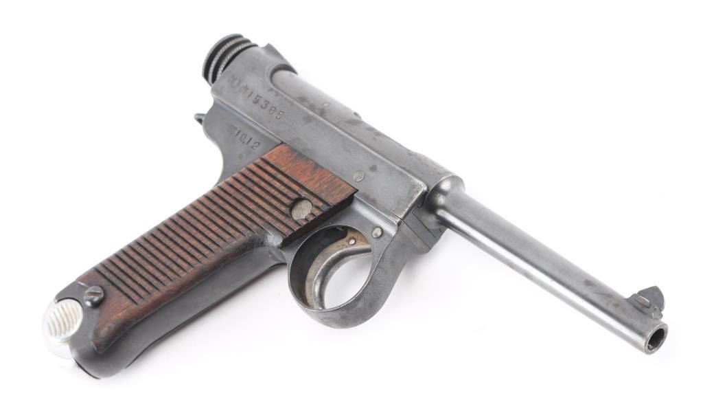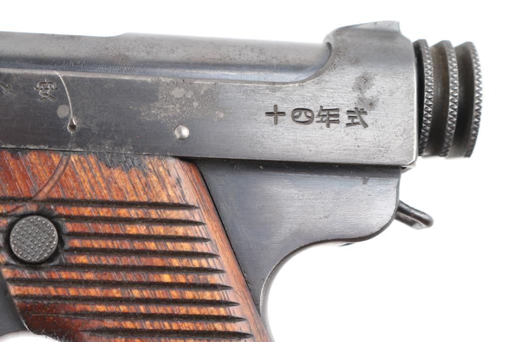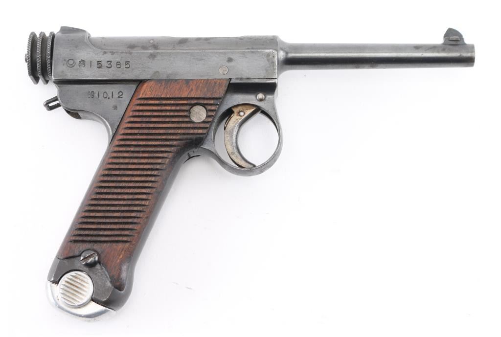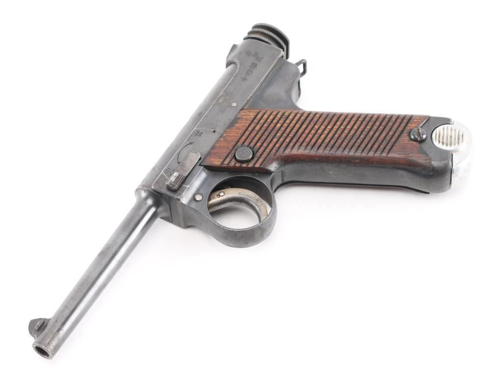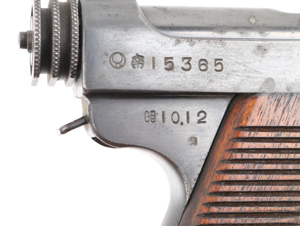 'Original Series' WWII era Japanese military striker fired semi-automatic service pistol chambered in 8mm Nambu. Dated 10.12 (December 1935) Features a blued finish, 4.6" barrel, dovetailed inverted 'v' front sight, fixed square notch rear sight, rounded trigger, small trigger guard, knurled grooved cocking piece, manual safety on the left side of the frame, magazine disconnect safety, push button magazine release, 8 round magazine with aluminum base plug, steel frame with lanyard loop on the rear and grooved wood grips Matching serial number on trigger. No import marks observed. Bore is good condition. Retains 85% finish showing edge losses, bright drag line on the frame from the safety lever, scattered areas of light pin-prick pitting. Grooved grips are very good condition with scratches. Markings are clear and readable. Magazine is very good condition, numbered "614". Condition is NRA Good. C&R Firearm.