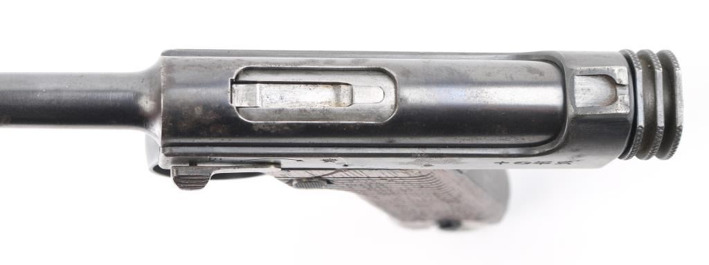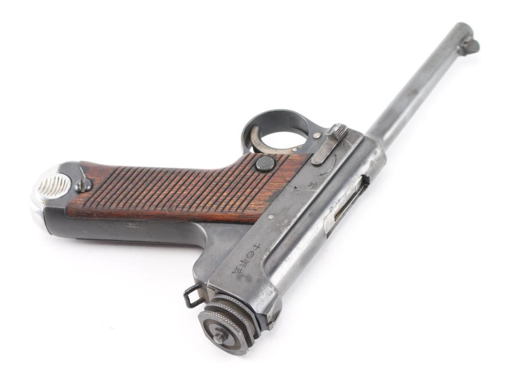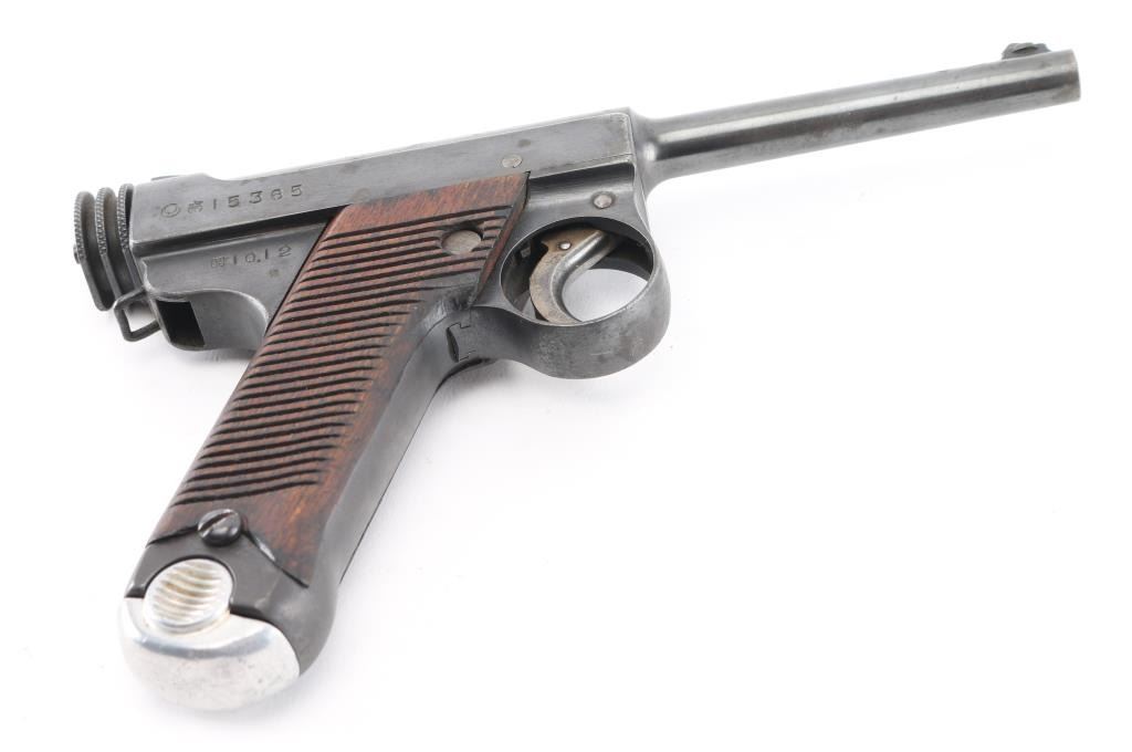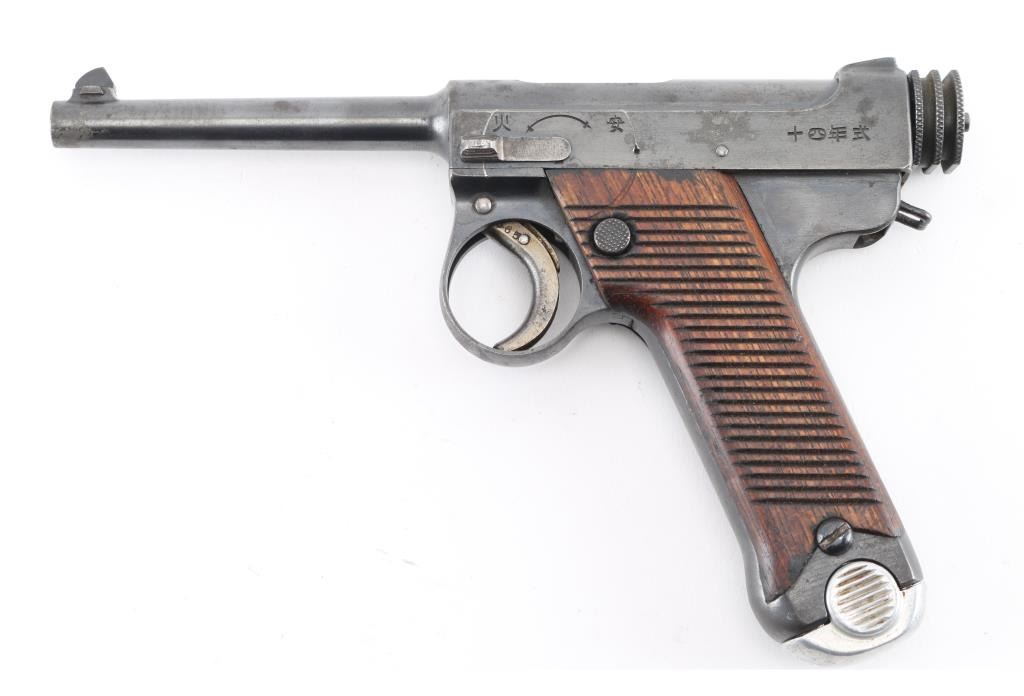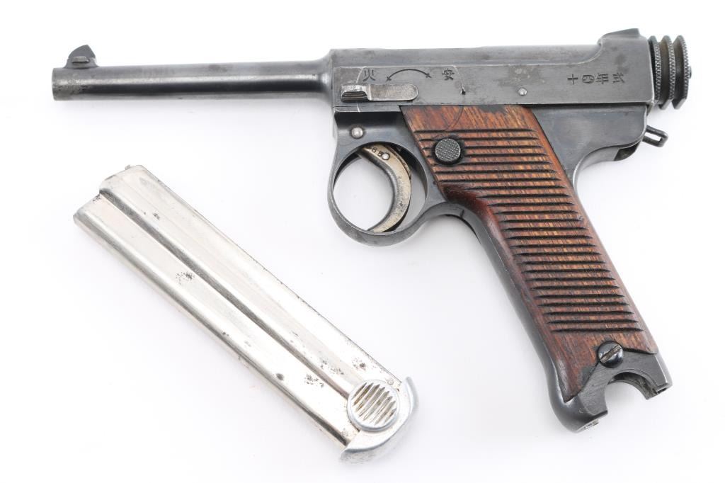 'Original Series' WWII era Japanese military striker fired semi-automatic service pistol chambered in 8mm Nambu. Dated 10.12 (December 1935) Features a blued finish, 4.6" barrel, dovetailed inverted 'v' front sight, fixed square notch rear sight, rounded trigger, small trigger guard, knurled grooved cocking piece, manual safety on the left side of the frame, magazine disconnect safety, push button magazine release, 8 round magazine with aluminum base plug, steel frame with lanyard loop on the rear and grooved wood grips Matching serial number on trigger. No import marks observed. Bore is good condition. Retains 85% finish showing edge losses, bright drag line on the frame from the safety lever, scattered areas of light pin-prick pitting. Grooved grips are very good condition with scratches. Markings are clear and readable. Magazine is very good condition, numbered "614". Condition is NRA Good. C&R Firearm.