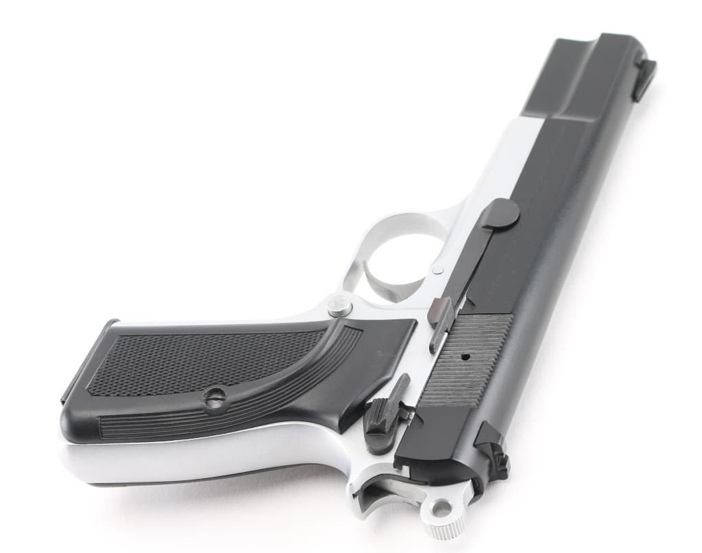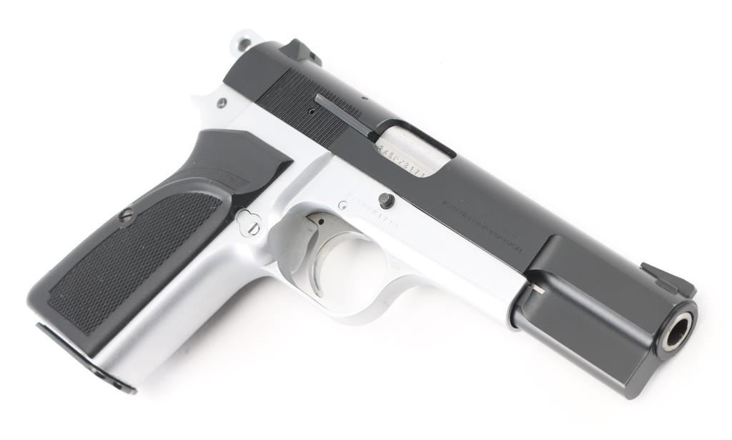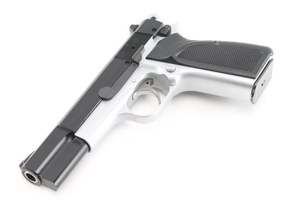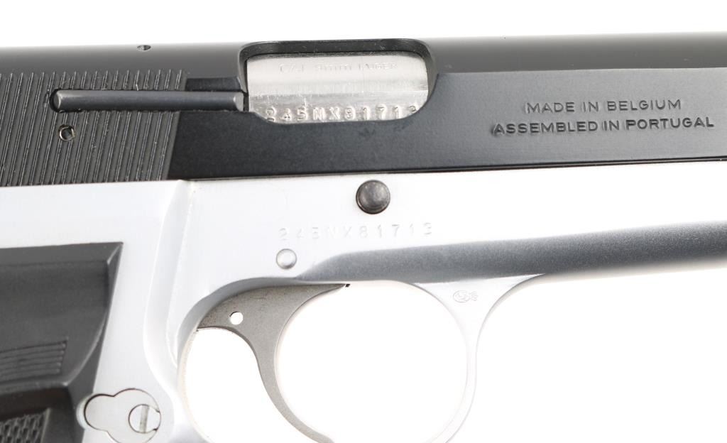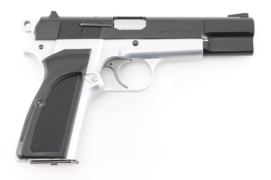 Manufactured in Belgium and assembled in Portugal circa 1993. This is a semi-auto pistol chambered for 9mm ammunition. It has a black steel slide and satin finish frame, 5" barrel, black grips, dovetailed three dot sights, smooth trigger and serrated round hammer spur. Comes with one magazine. Retains nearly all of its original finish with only minor wear observed. Bore looks good. Grips are good. Condition is NRA Excellent. *Modern Firearm*