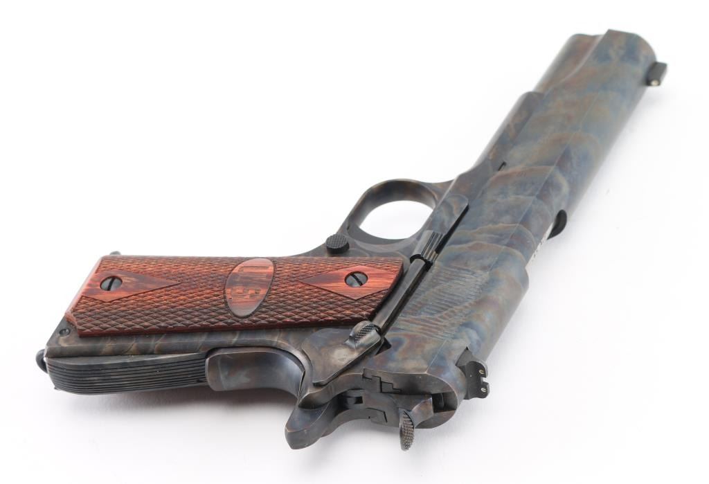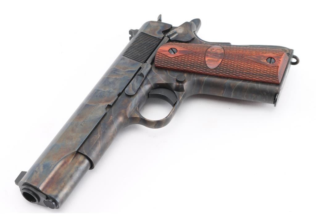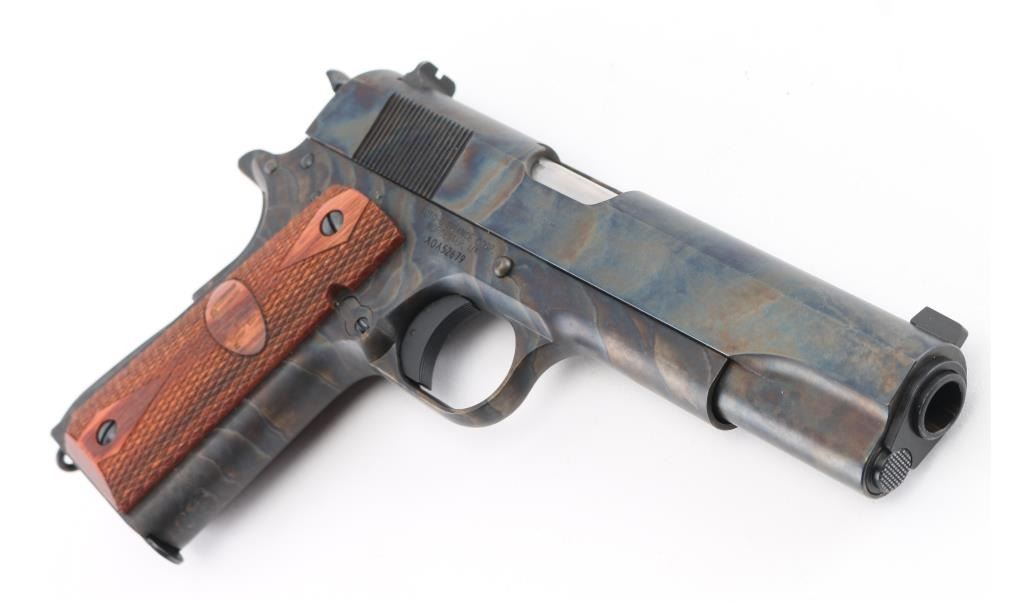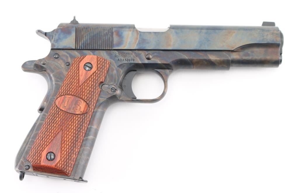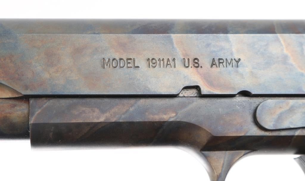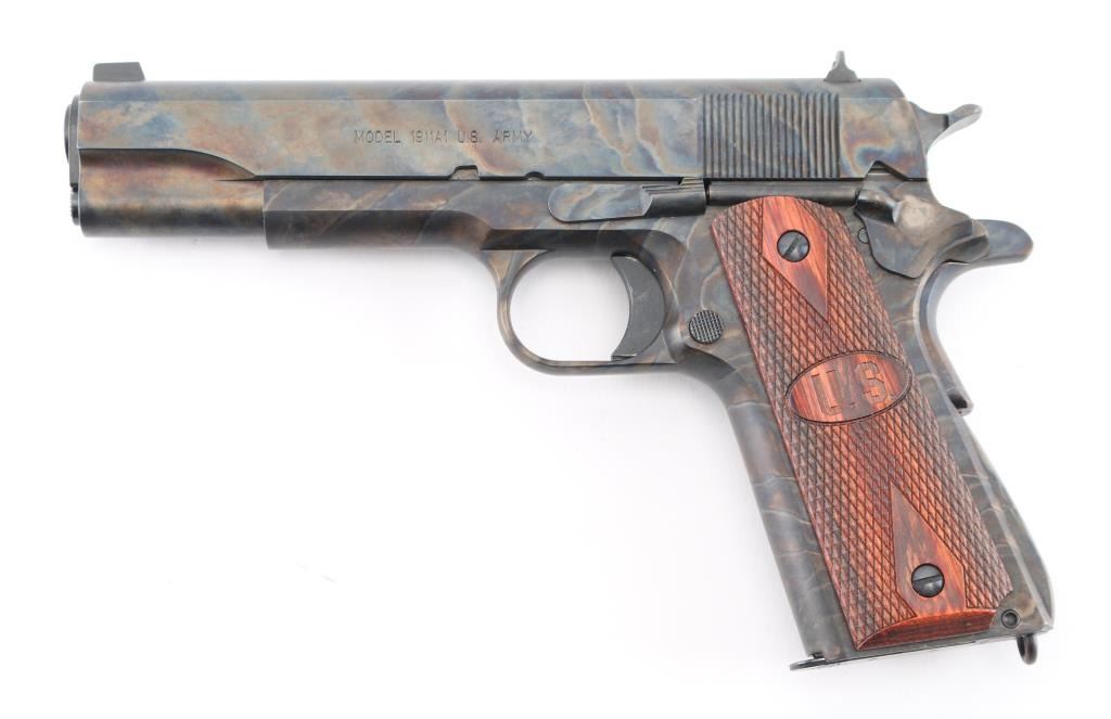 Semi-auto 1991 style pistol chambered for .45 ACP ammunition. It has a color case hardened slide and frame, checkered, double diamond grips embossed with U.S. It has a 5" barrel, three dot sights, fixed front, dovetailed rear, serrated trigger, knurled hammer spur, thumb safety and grip safety. Pistol exhibits little to no wear. Grips are good. Bore looks good. Comes with original factory cardboard box, one magazine and owners manual. Condition is near NRA Perfect *Modern Firearm*