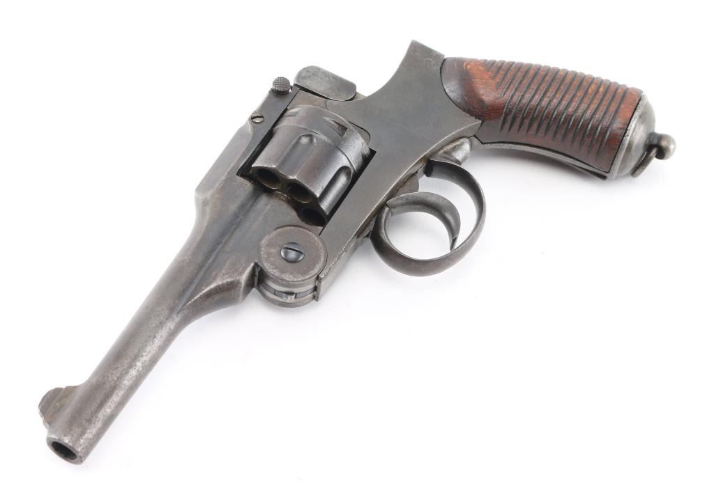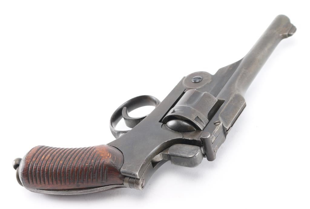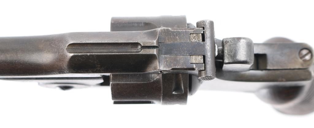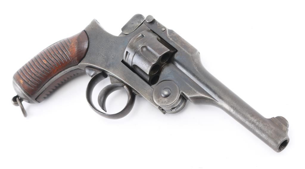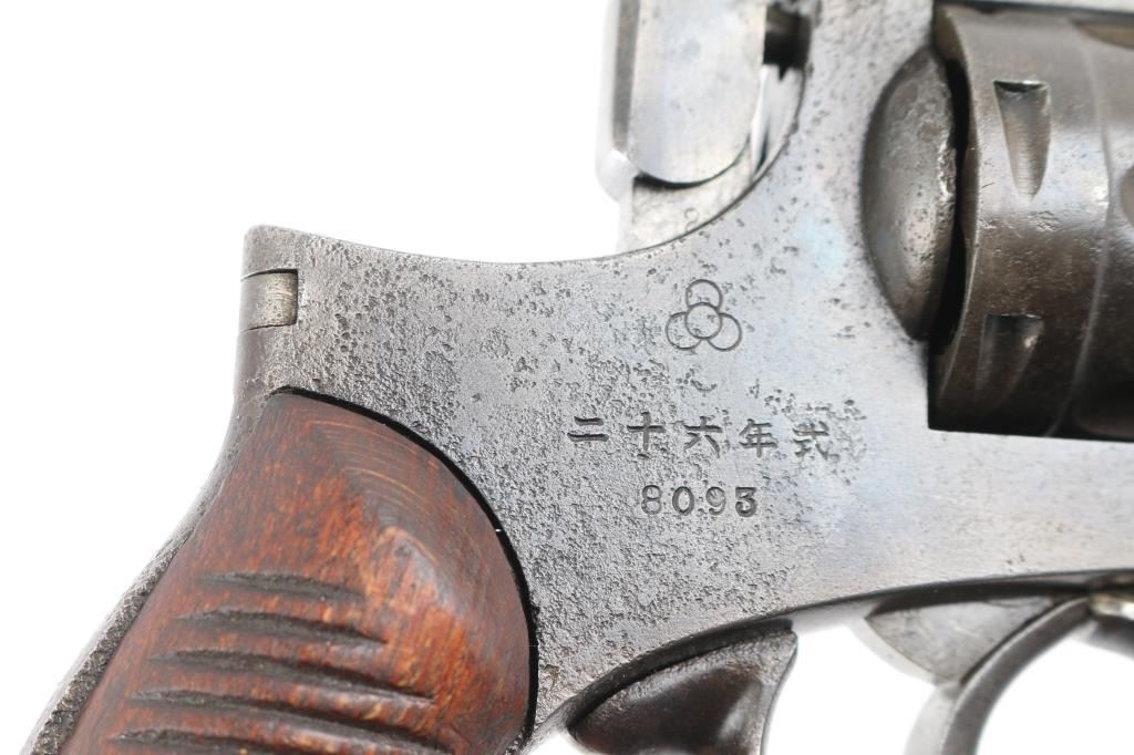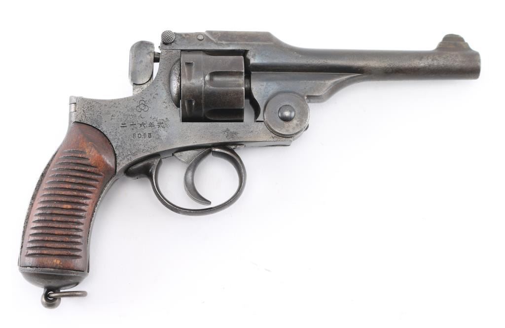 Double action only 6 shot revolver used by the Japanese military from 1893 to 1945.Produced 1893-1925. Blued finish, grooved wood grip panels, 4.75" barrel. Break-top, lanyard ring, chambered in 9x22mm. Produced by the Koishikawa arsenal, Tokyo. The bore is pitted, rifling present cylinders are good. High polish blue fading to smooth gray, about 60%, with finish loss mostly to the barrel. Scattered areas of light pitting throughout. Action is crisp/tight. Grips are very good. NRA Condition-Good. C&R Firearm.