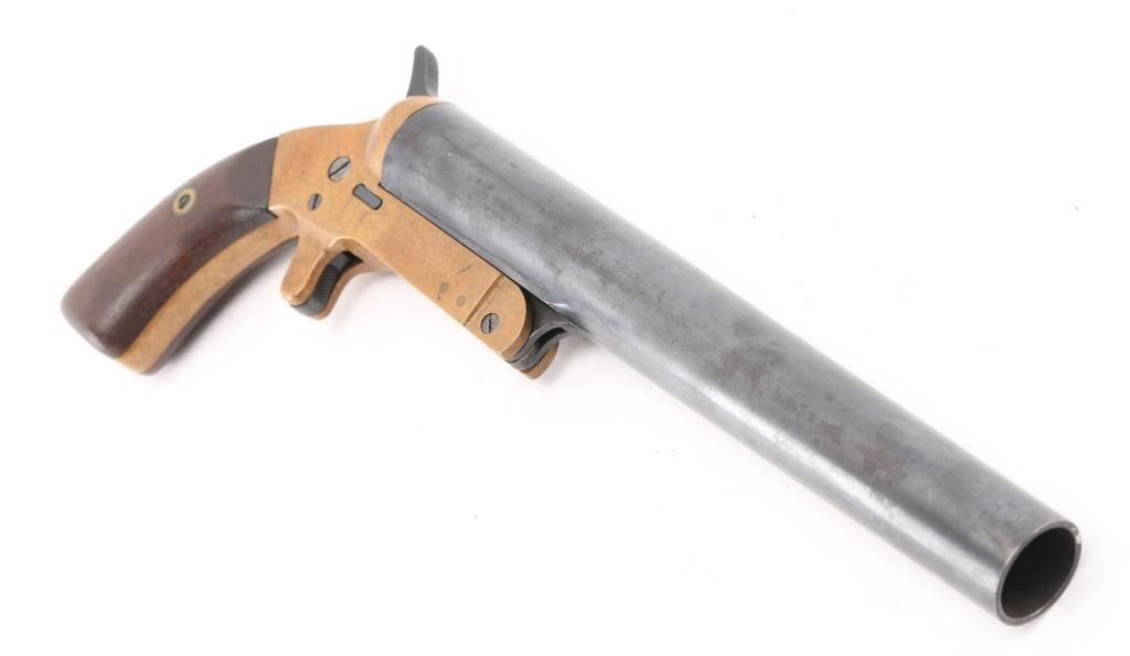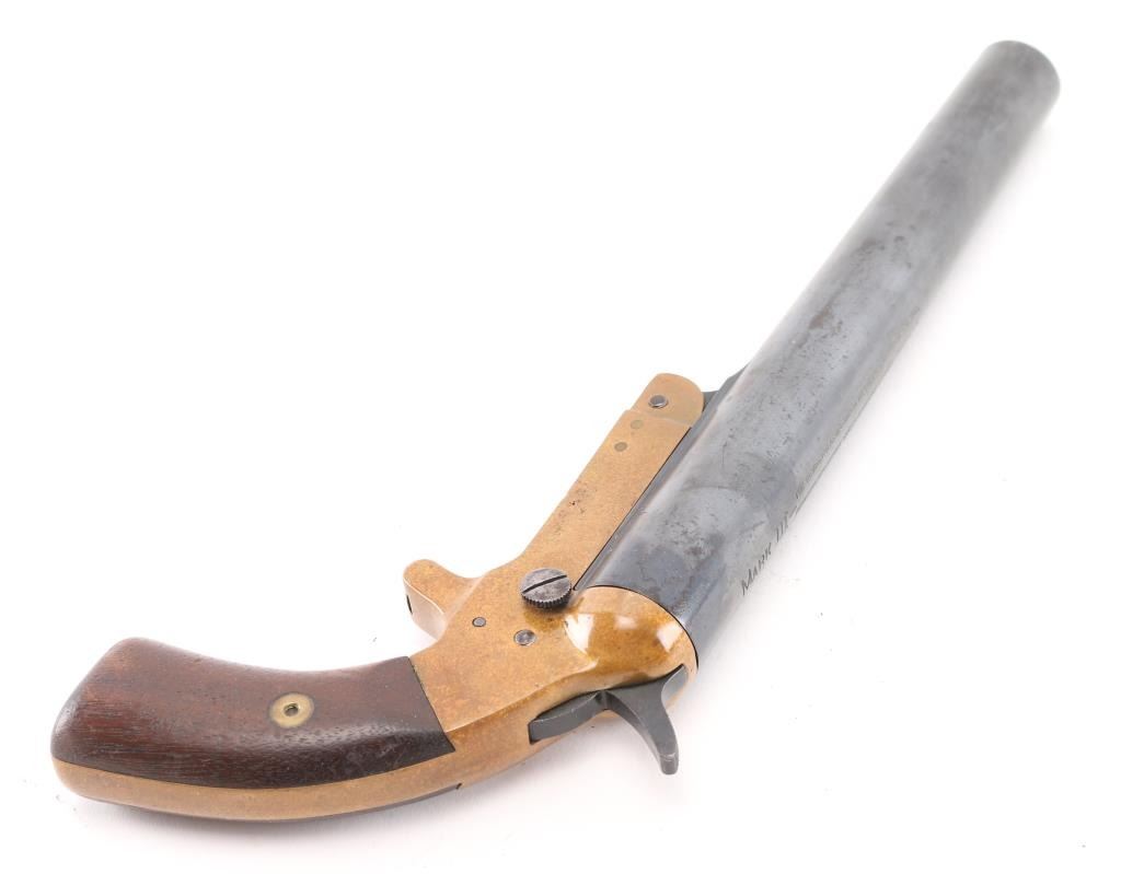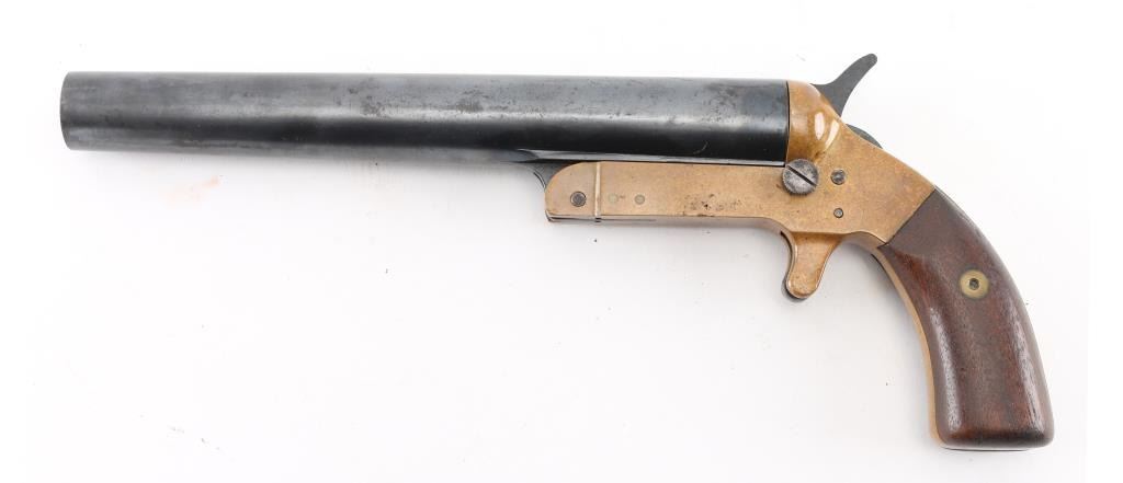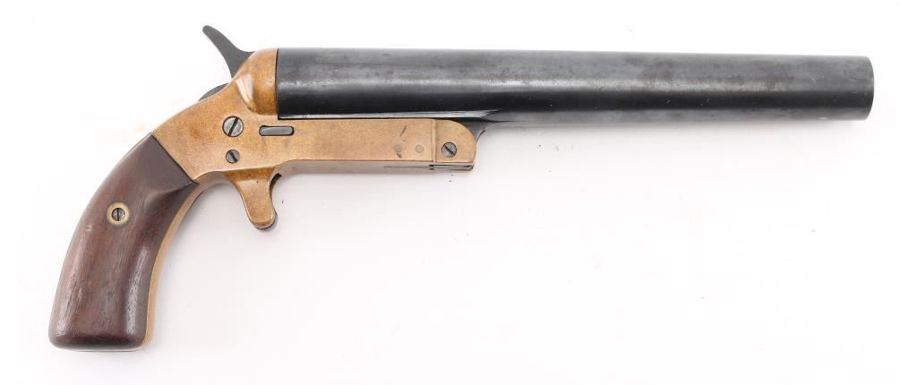 This pistol is manually operated, hammer-fired, single-shot signal pistol with a hinged barrel. It was loaded by breaking down the barrel in a shotgun fashion from a pintle hinge located under the front end of the barrel. The flare pistol has no mounted sights on it. The pistol is made of a 9" long, tapered, dull iron smooth-bore barrel and a bright brass frame with a two-piece plain walnut pistol grip. The pistol has a large screw on the left side of the frame, which acts as a barrel release latch. The pistol has a squared-off butt and is fired by a spur-type trigger, with no trigger guard. There is non-slip checkering located on the thumb pull-back on the hammer and on the spur trigger. In good condition.