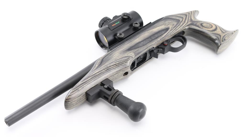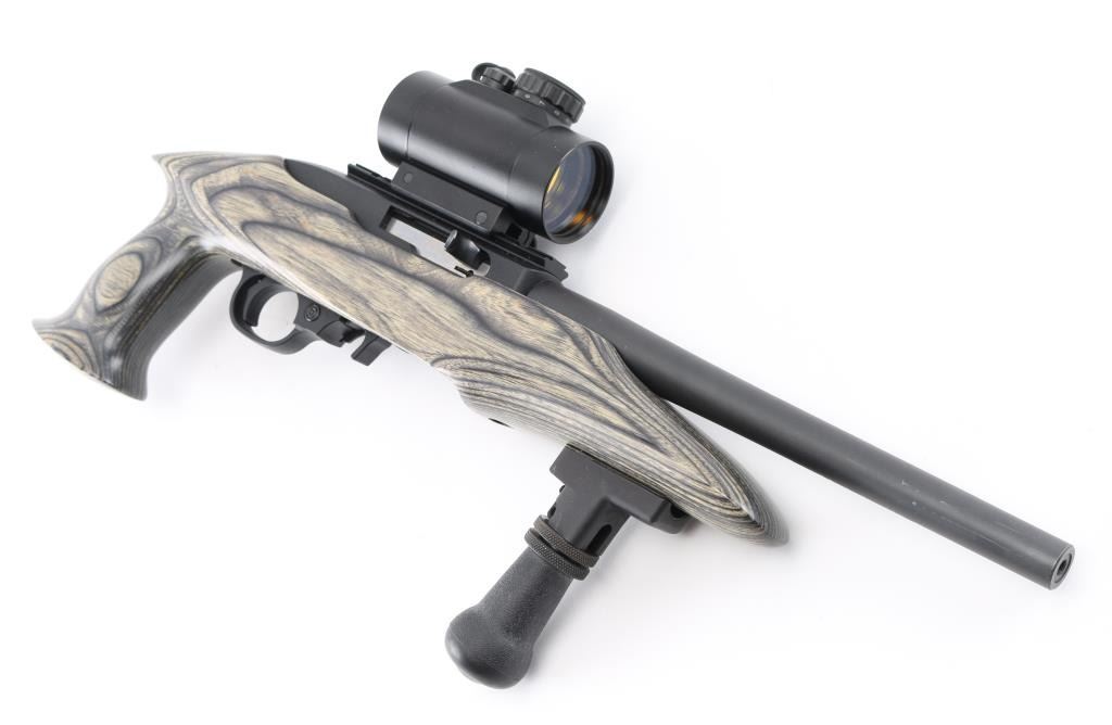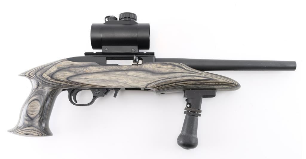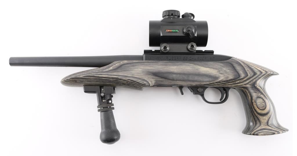 Semiautomatic pistol features 10" barrel, scope rail on receiver top, accepts detachable magazines, manual safety, laminated wood stock with pistol grip, and vertical fore grip. Mounted with a TruGlo 30mm Red Dot sight, clear optics. Matte barrel, and matte black textured receiver. Overall condition is excellent, bore is excellent/bright . Includes (1) 10-rd magazine. Condition is NRA excellent-Like New. Modern Firearm.