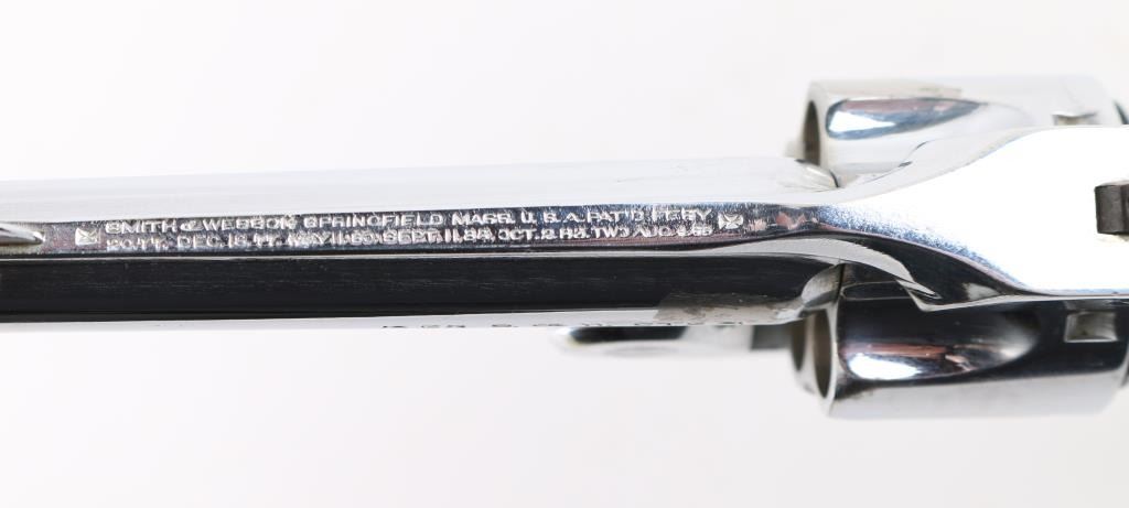SN: 141778. The "Lemon Squeezer" Manufactured 1902-1909. Double action only. 5-shot, 3" round, ribbed barrel, nickel finish, checkered hard rubber grips with S&W monograms. T-shaped barrel latch with Knurling on each side. Top break action. Grip safety. Bore is good, with some small areas of light pitting. Action is smooth, barrel locks up tight, Serial number matched on heel. barrel latch, and cylinder. Grips are excellent, nickel finish is about 85% with flaking loss on the cylinder, and left barrel, scratches. Hard to tell, but possibly an old refinish. NRA Condition-Good. C&R Firearm.