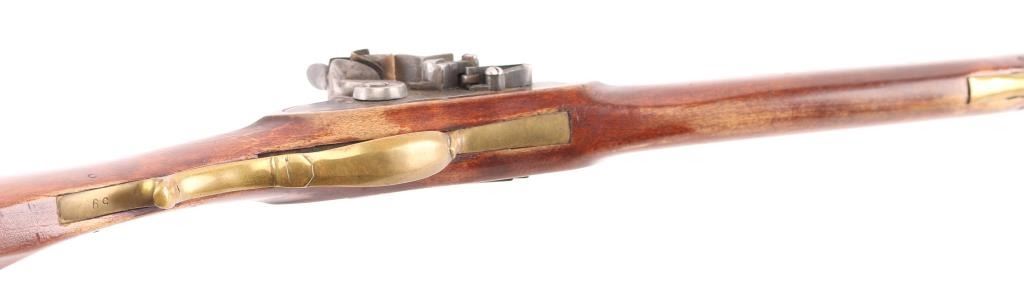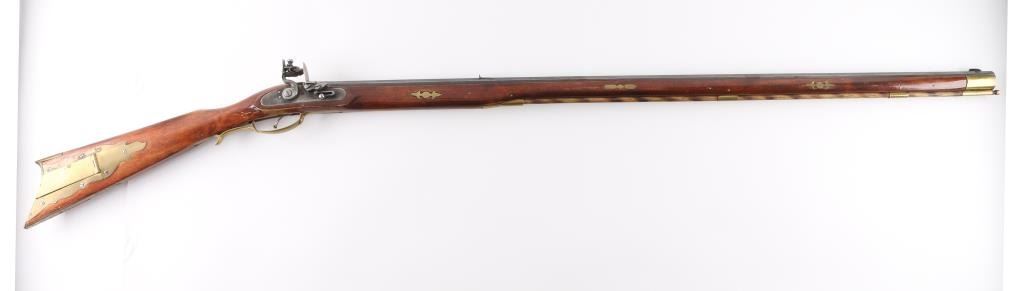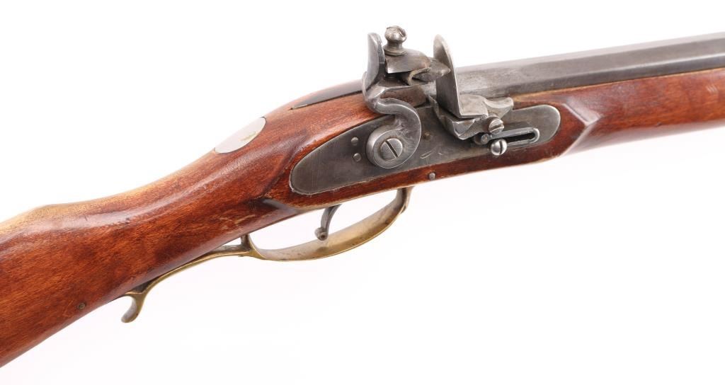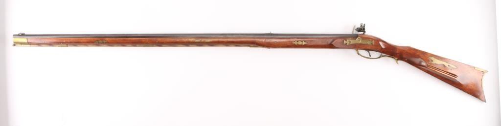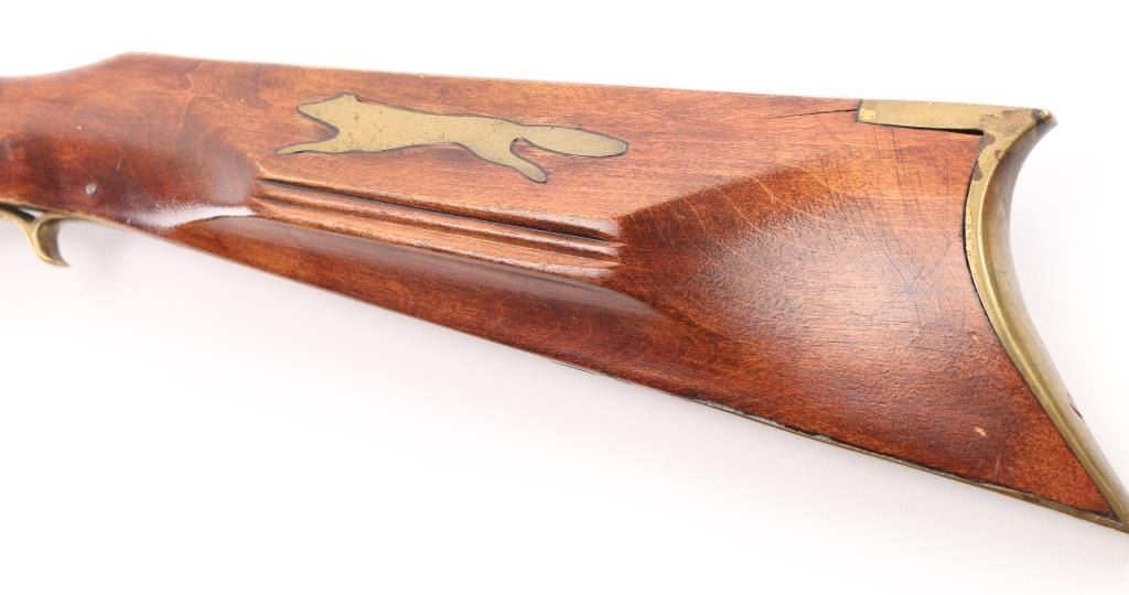 Newer made copy. Full stocked flintlock rifle, .54 cal, for black powder or substitute only. Features blued finish, brass fittings, 40" octagon barrel, blade front & notch rear sights in dovetails, brass tipped wood ramrod, patch box, crescent buttplate, right handed cheek piece. brass inlay of running fox in left butt stock, fox etched on lock plate. Bore is very good condition with strong rifling. Action works well, wood is very good with some handling loss, blue is about 70%. Condition is NRA Very Good+. Antique Firearm.