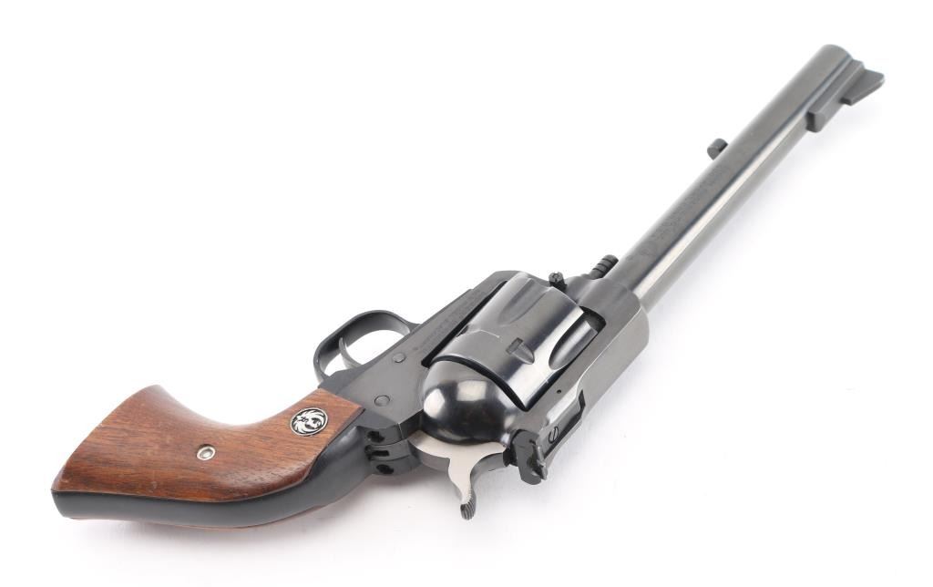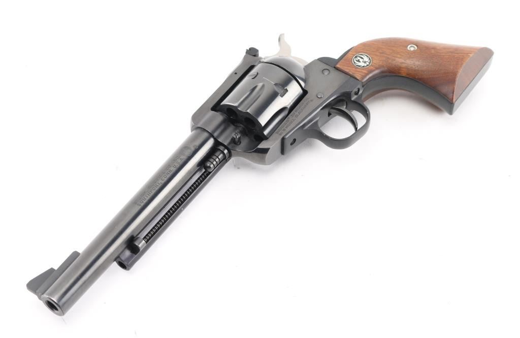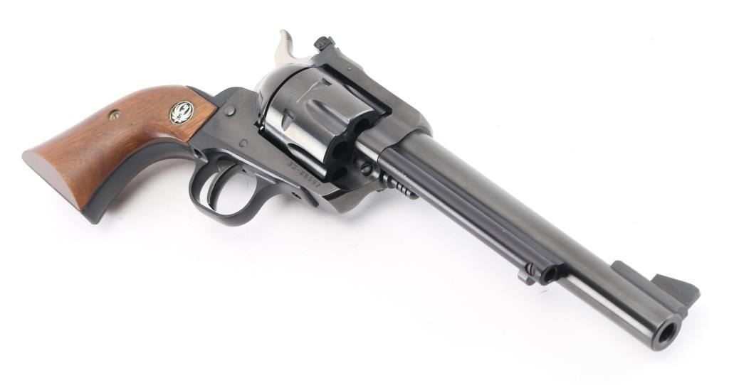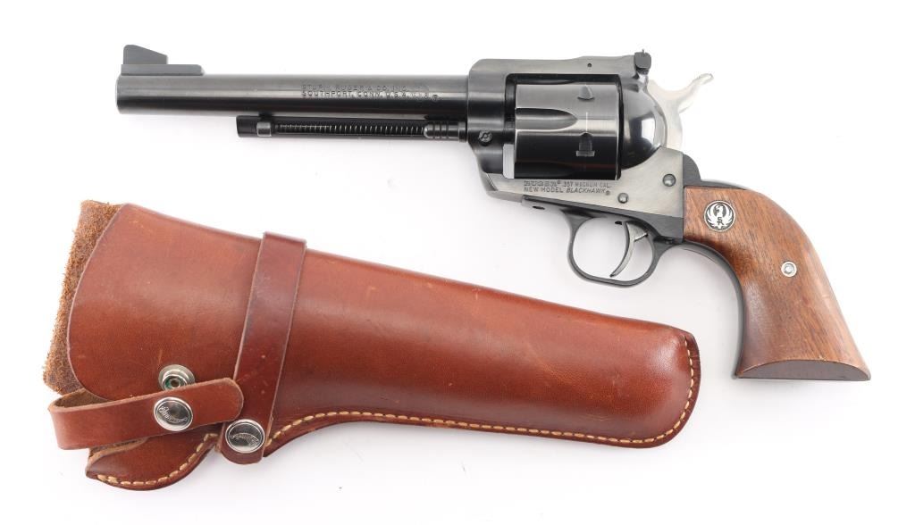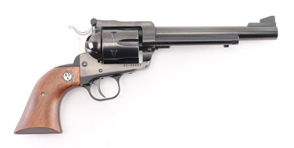 SN: 33-89597 American made revolver, blued alloy steel, approximately 6 1/2" barrel, serrated ramp front sight, adjustable notch rear sight, serrated stainless steel hammer, swing out loading gate, smooth trigger, two-piece wood grips with the Ruger logo, slight rubbing around the crown, scratches on ejector rod housing with bare metal showing, drag marks on cylinder, grips have small dings. Includes a brown leather Hunter #110048 holster. **NRA Very Good** Modern Firearm