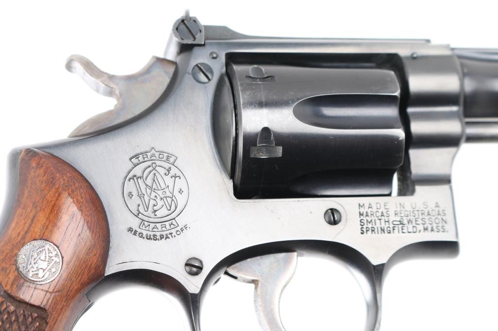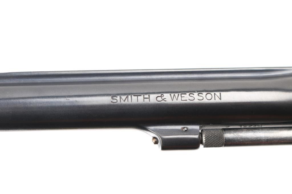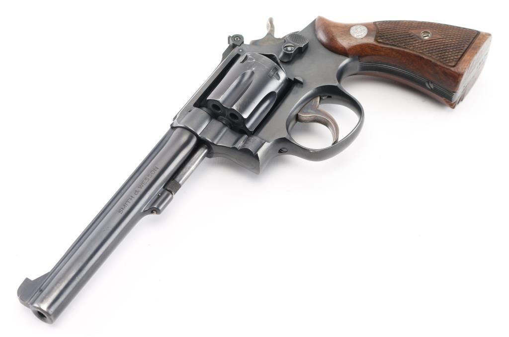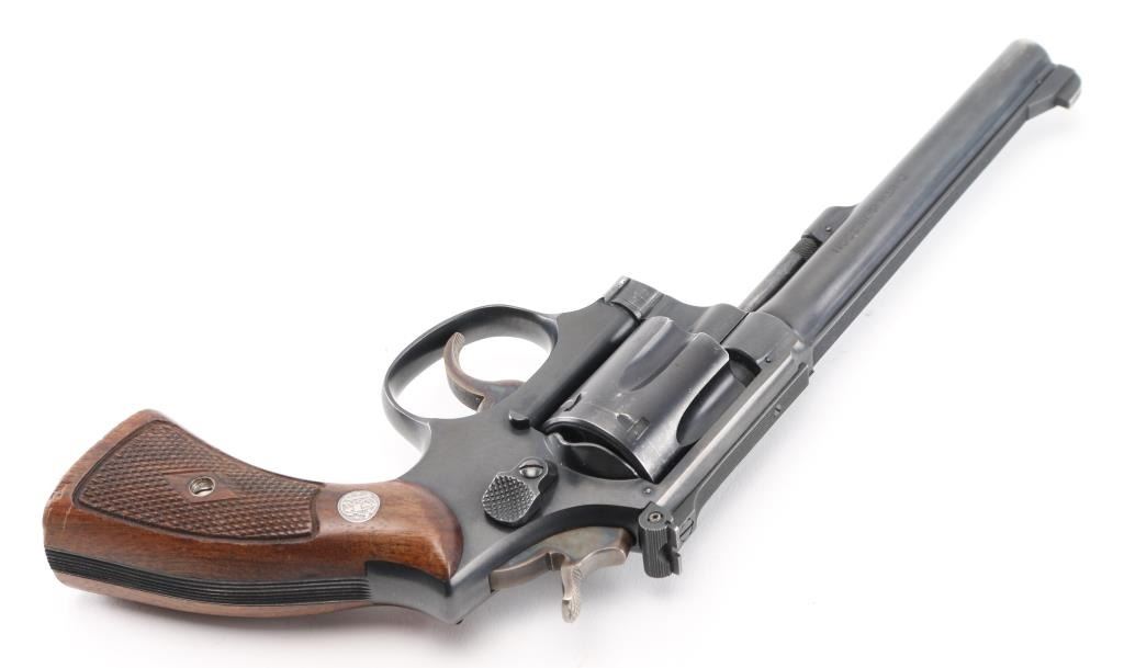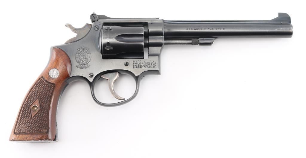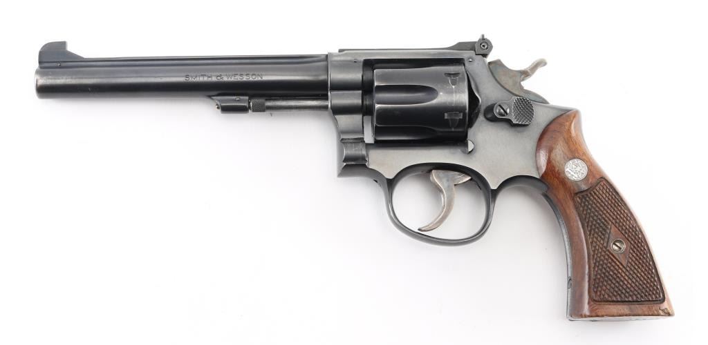 K"-22 Masterpiece, Postwar 3rd Model" Vintage medium frame double action revolver chambered in .22 Long Rifle, manufactured circa 1953. Features a blued finish, pinned 6" barrel with serrated sighting rib, patridge front sight, adjustable micrometer click rear sight, fluted six-shot cylinder with counterbored chambers, non-shrouded ejector rod, serrated trigger, .500" target hammer, five screw square butt K target frame with six groove grip straps, and two-piece diamond checkered walnut Magna grips with silver Smith & Wesson medallions. Serial numbers match on the frame, cylinder and barrel. S&W logo on right side of frame. Blue finish is about 97% with muzzle/edge wear and the cylinder with a slight drag line. The wood grips are good with chip and s couple of gouges at the base on the right. Bore is excellent/bright. NRA Condition-Near Excellent, C&R Firearm.