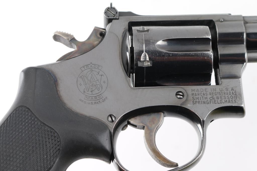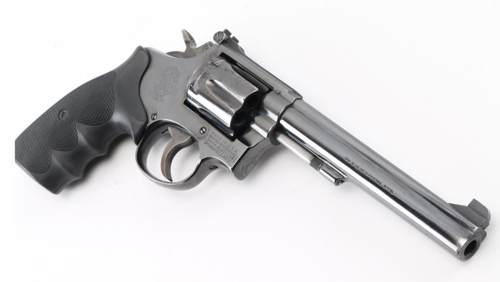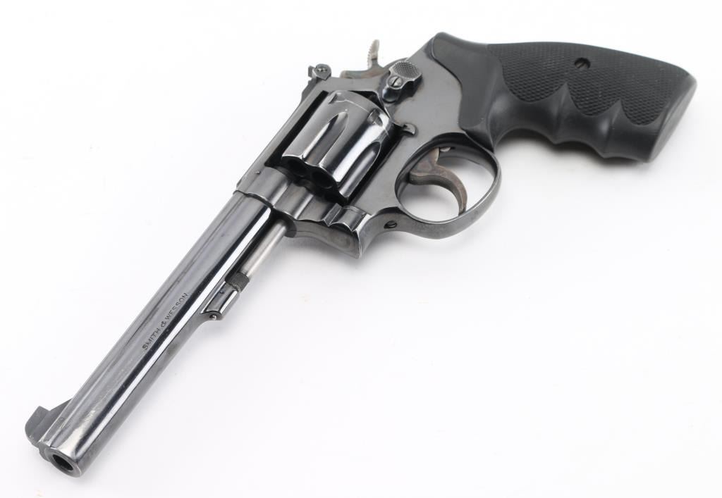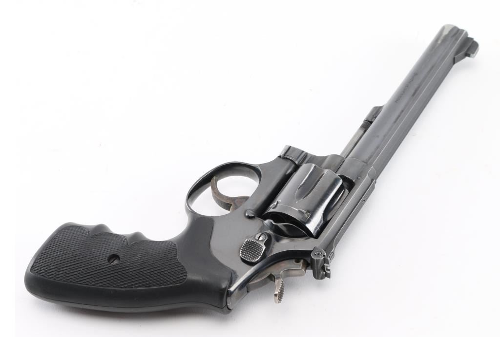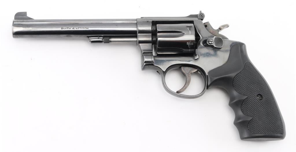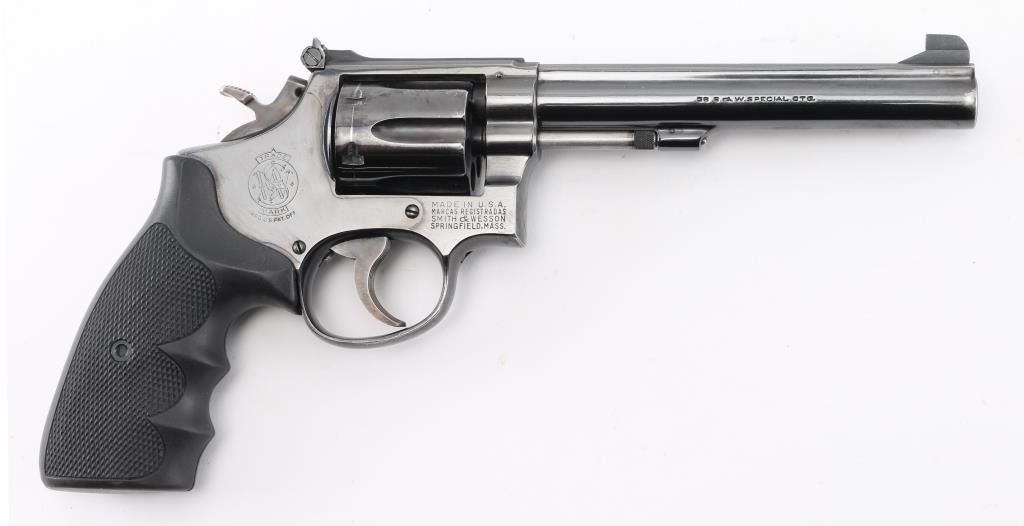 'The K-38 Target Masterpiece' Medium frame double action revolver chambered in .38 Special, manufactured circa 1958. Features a blued finish, pinned 6" barrel with serrated sighting rib, raised patridge front sight, adjustable micrometer click rear sight, fluted six-shot cylinder, non-shrouded ejector rod, .500" grooved trigger show attached over factory trigger, .500" checkered spur target hammer, five screw square butt K target frame, black rubber, finger grooved grips. Bore is excellent/bright. Blue finish is about 90% with edge/muzzle wear. tracking, minor scratches, and handling loss to the cylinder pin .Grips are very good condition. Action is smooth with good lock-up. NRA Condition-Very Good. C&R Firearm.