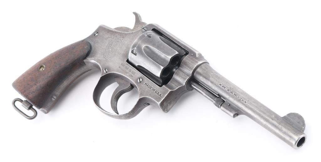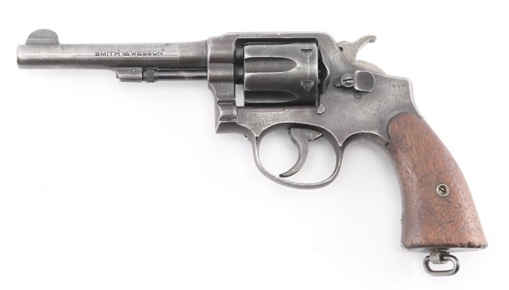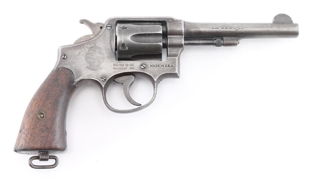 This is a M&P pre-Victory model. WWII era medium frame double action service revolver chambered in .38 S&W, manufactured circa 1940-1945. Import marks " Vam Dist. Co. Wooster OH on right frame These revolvers were provided by the United States government to the British Empire as aid under the Lend Lease program, but this one has no British proofs Features a blued finish, pinned 5" barrel, forged round blade front sight, square notched rear sight, non-shrouded ejector rod, fluted six-shot cylinder, serrated .265" case hardened trigger, case hardened .265" hammer with knurled spur, five screw square butt K service frame with lanyard ring on the butt and two-piece smooth walnut grips. Standard markings with faint "WB" flaming bomb, froward of the lanyard ring. Serial number matched on heel, barrel, and cylinder. 'United States Property' on top strap. Revolver retains approximately 40% of it's blued finish showing some high point edge wear, scattered handling marks/scuffs, tracking on the cylinder, finish loss from handling. Action is crisp with very good lock-up, the bore is near excellent , markings are clear and the wood grips are good with some dings/dents/. NRA Condition-Good. C&R Firearm.