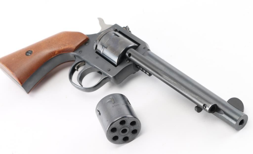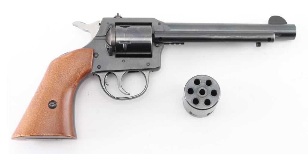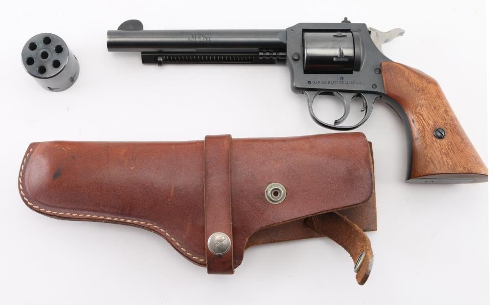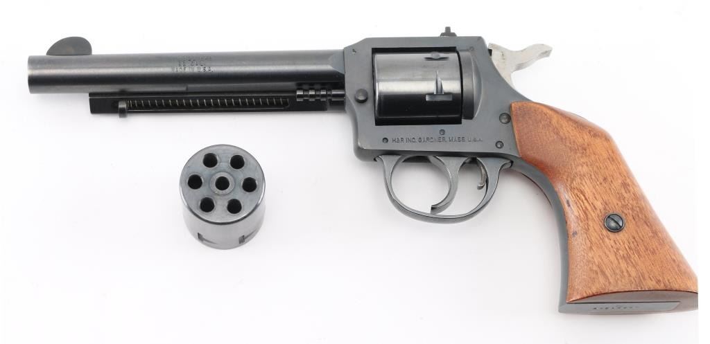 SN: AX213690.Produced 1976-1985. Six-shot double action revolver chambered for .22 Short, Long or Long Rifle, manufactured in Gardner, MA. Features a blued finish, 5.5" round barrel, ejector rod, blade front sight, dovetailed rear sight with square notch,non- fluted cylinders, smooth trigger with beveled edges, serrated hammer spur, and smooth walnut grips. Revolver exhibits approximately 99% of its original finish with feint tracking on the cylinder. Action is smooth with good lock-up, the bore is excellent and wood grips are excellent. Comes with an extra cylinder chambered in .22 Magnum, and a Hunter brown leather snap holster, very good condition. NRA Condition- Excellent. Modern Firearm