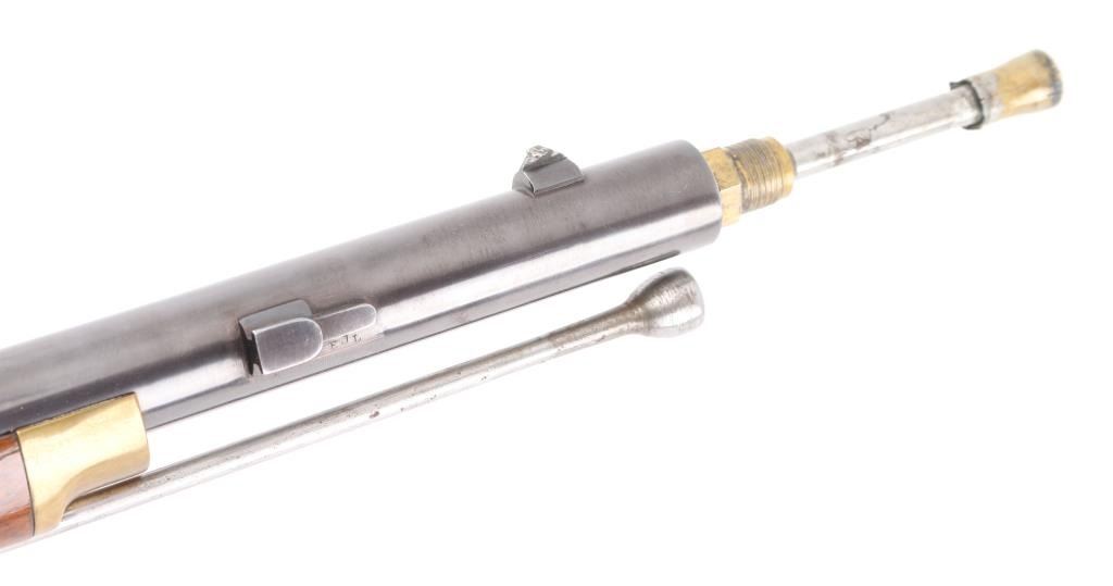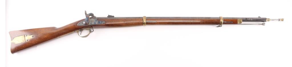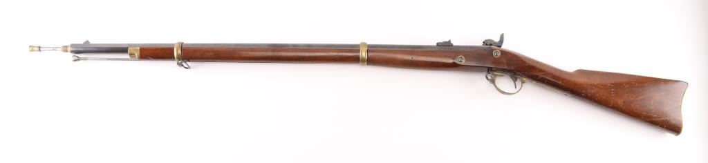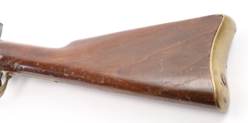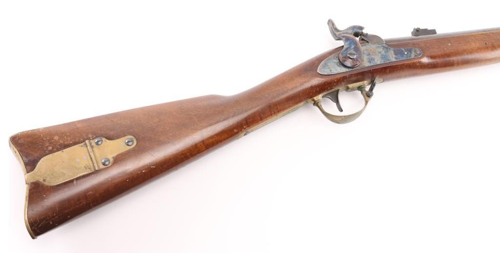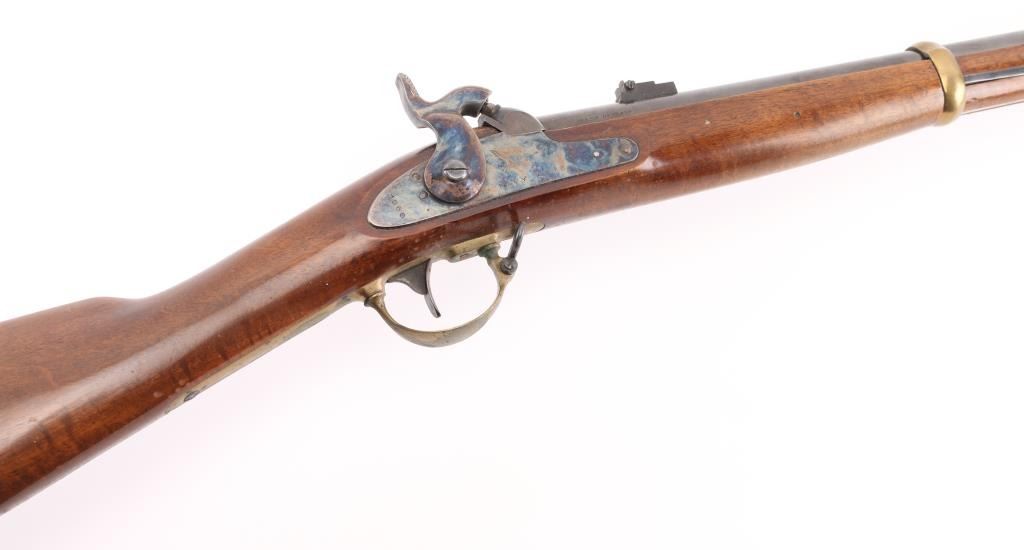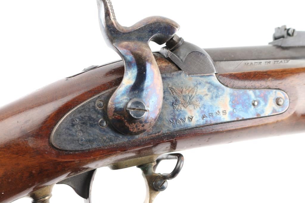SN: 620 Italian made copy of the Springfield Model 1863 Type II Artillery short musket. 2 barrel bands, casehardened hammer & lock, 33" blue barrel with front blade, flip-notch rear sights, steel ramrod, brass plated fittings, patch box with extra nipple. Lock plate with American eagle, 'Navy Arms Co.' and dated 1960. Two-cock action works well, bore is very good with strong rifling, blue has some handling loss but mostly all there, case hardened colors very good, bottom of hammer has some surface rust/pitting, wood is sound with scratches/dings. Comes with extra heavy steel ramrod. NRA Condition-very Good+. Antique Firearm.