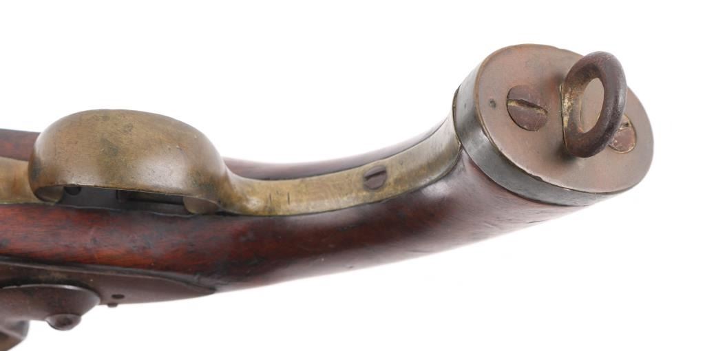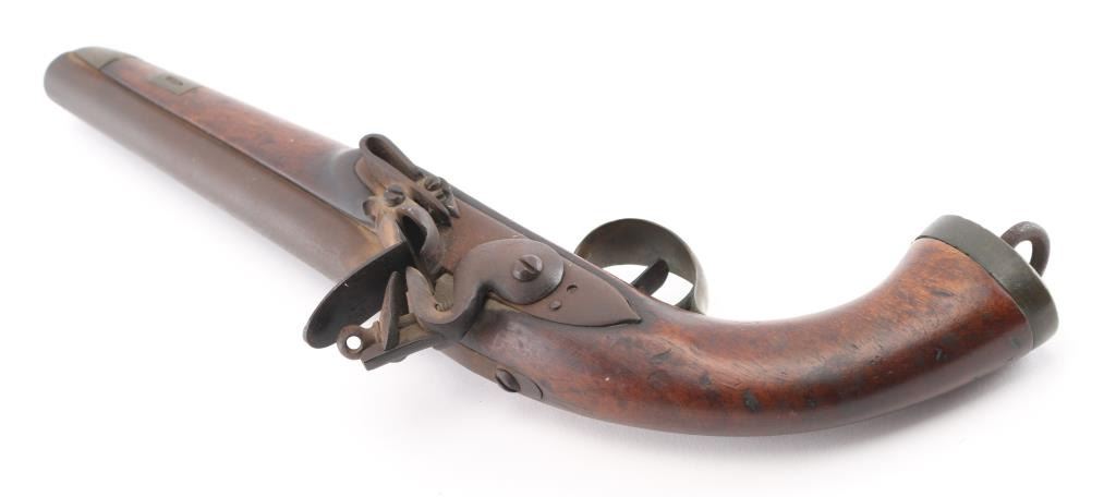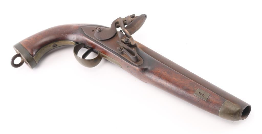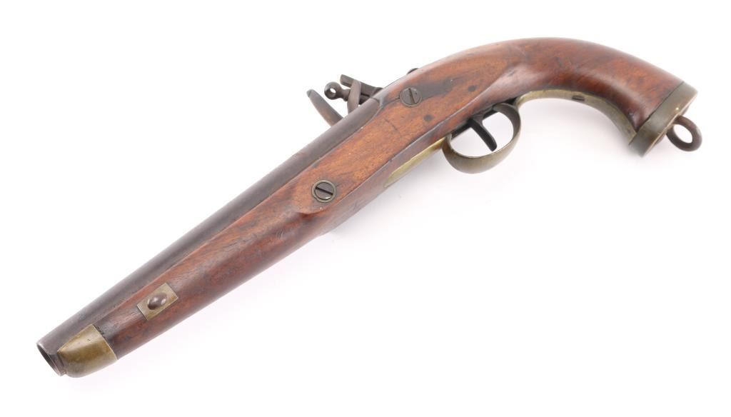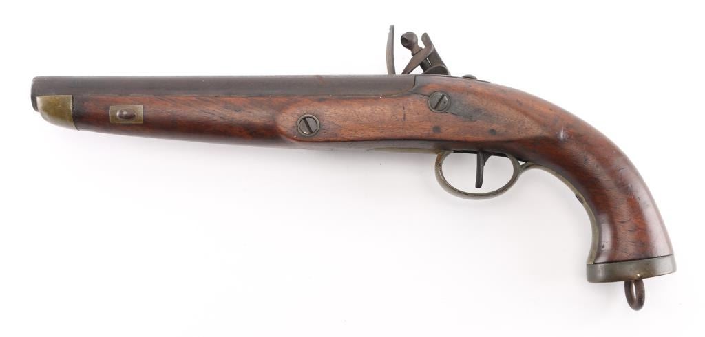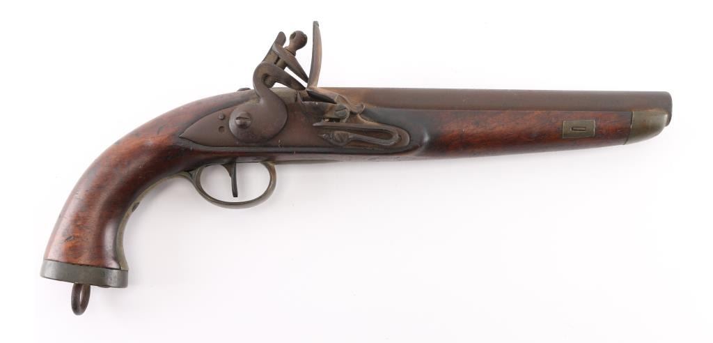 Circa 1775-1830. Having a 9-inch smooth bore barrel, .69 caliber Belgian sea service flintlock pistol, standard issue; brass furniture, "DN" under crown proof mark on the round faced lockplate, lanyard ring. There is a couple of minor cracks to the left of the tang, typical dings and dents, lanyard ring. This model was intentionally made without a ram rod. Finish has turned a brown patina. Fully operational. Original flintlock configuration. Bore is not pitted. Needs a good cleaning. NRA Condition-Good. Antique Firearm.