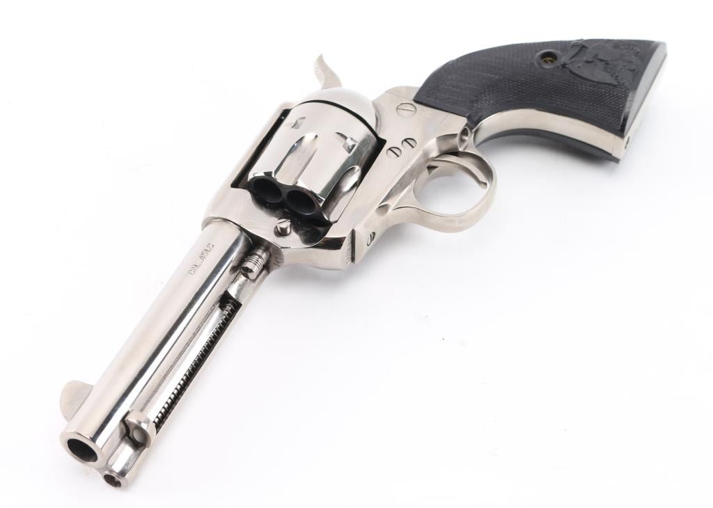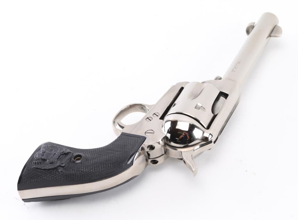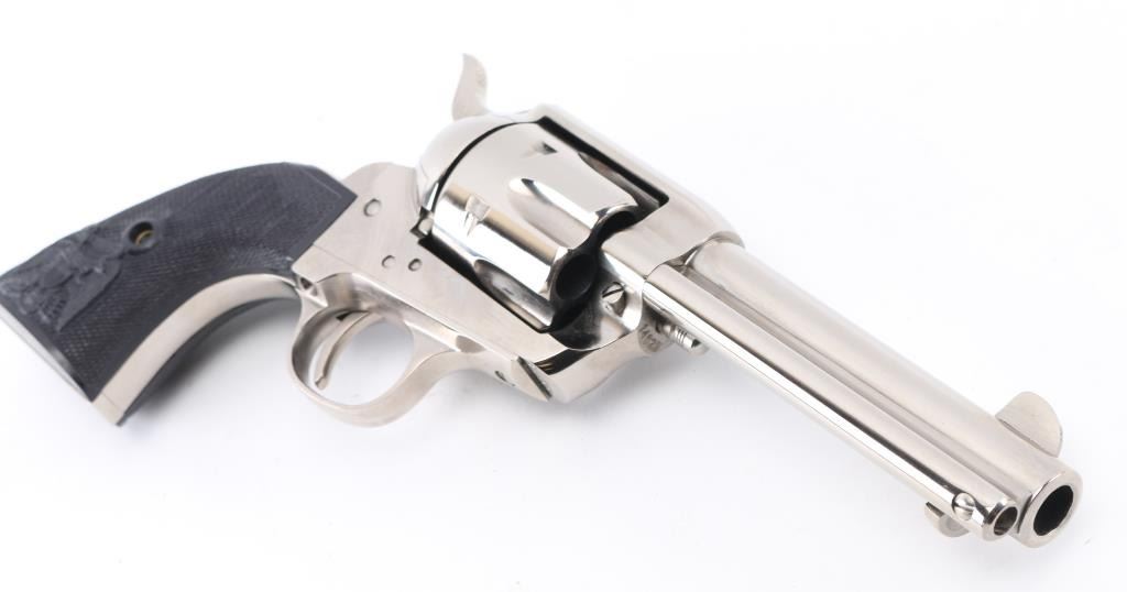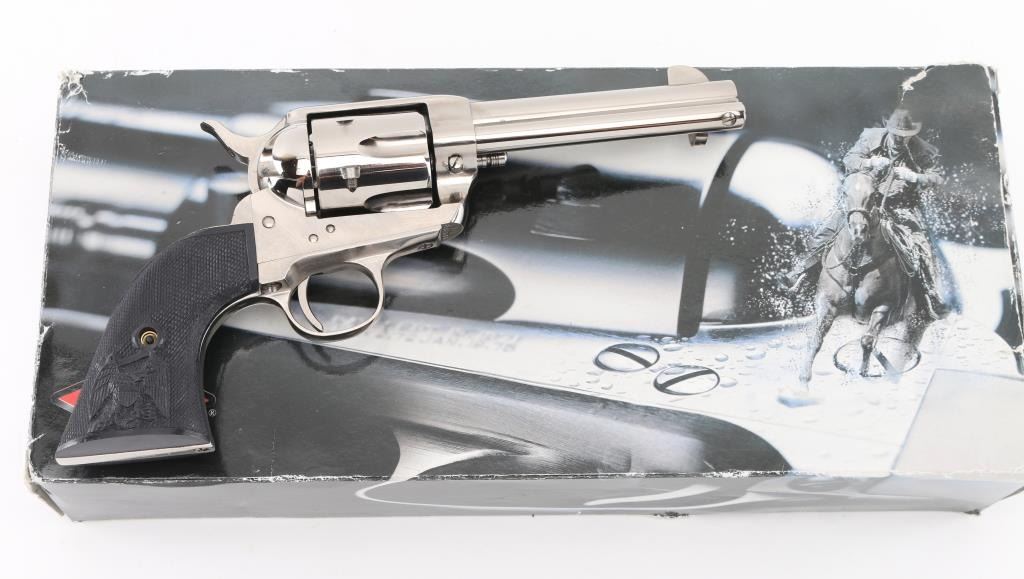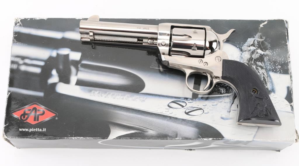Italian-made, nickel-plated single action revolver, Colt SAA three screw clone, 4 3/4" barrel, integral rear sight with blade front sight, cross hatched hammer spur, smooth trigger, spring-loaded ejector rod, two position cylinder rod and black PVC grips with eagle. Small scratches on barrel, cylinder and side of hammer. Comes with box. NRA Very Good **Modern Firearm**