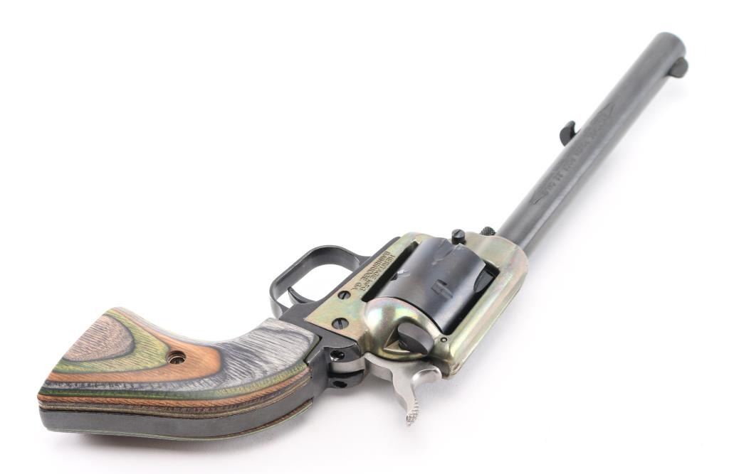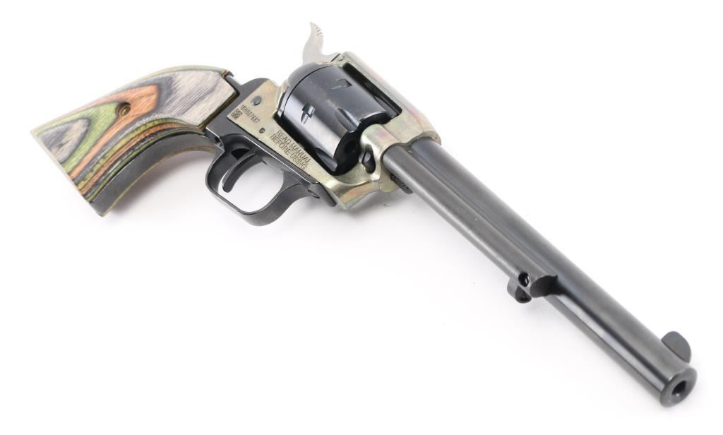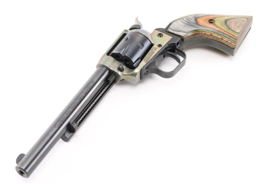 American made Single Action 6-Shot Revolver chambered for .22 caliber ammuntion and comes with fluted .22LR cylinder. It features a 6.5" blue barrel & cylinder, matte gray frame, black grip frame and trigger. It sports a blade front sight, integral rear sight, safety on the left side of the hammer with knurled spur and two piece camo green laminate grips. Metal finish is excellent, bore & grips are excellent, action is smooth. Comes with original factory cardboard box with lock & manual. NRA Condition-Excellent. Modern Firearm.