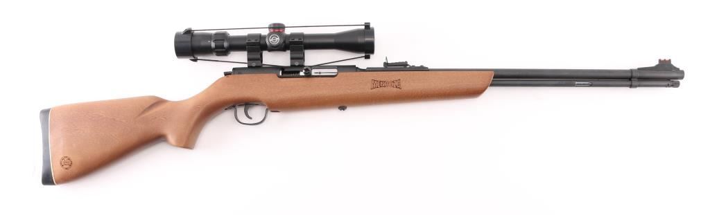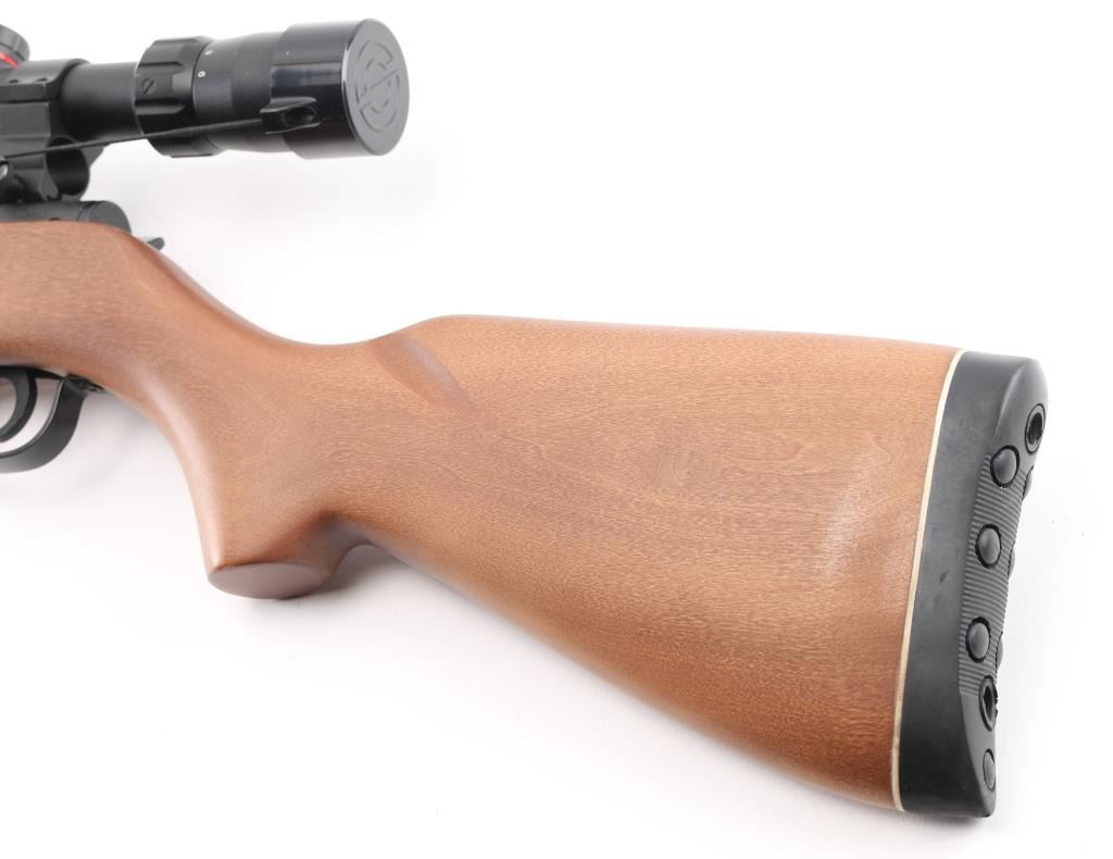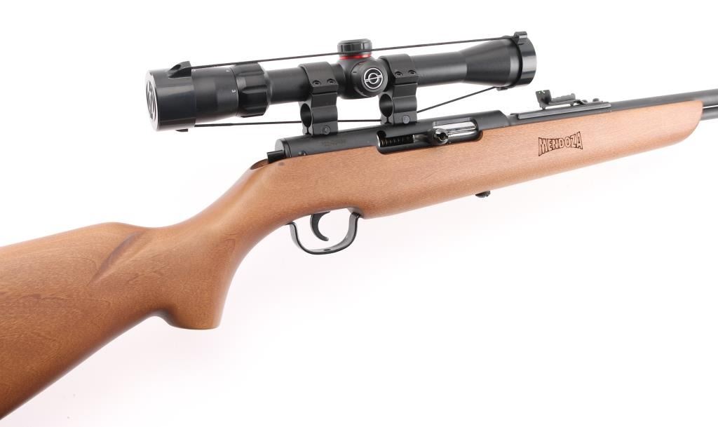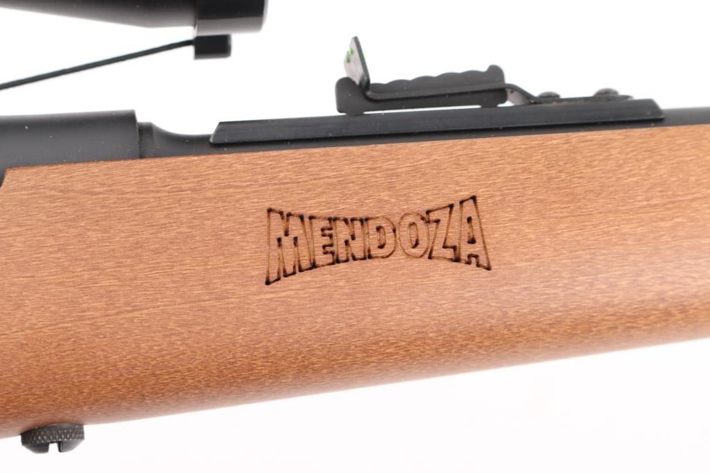 Lightweight, easy to carry semi-automatic rifle chambered in .22 Long Rifle. 16+1 round capacity, the Mendoza is ideal for plinking and varmint control. A fiber optic front sight post makes shooting in low light much easier and the dovetail scope mount provides further sighting options. Smooth hardwood stock. Has a Simmons 3-9x32 scope mounted to the receiver. Scope is in excellent condition. Barrel is excellent. Metal has a black finish. NRA Excellent **Modern Firearm**