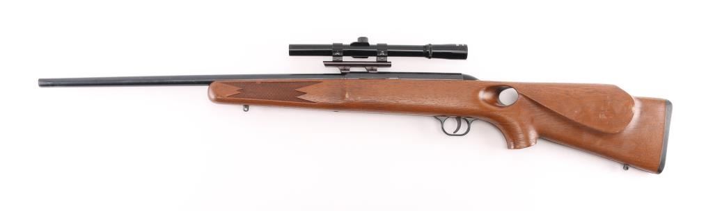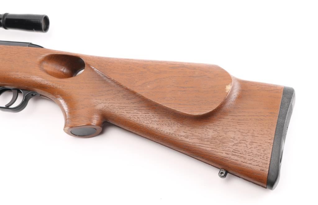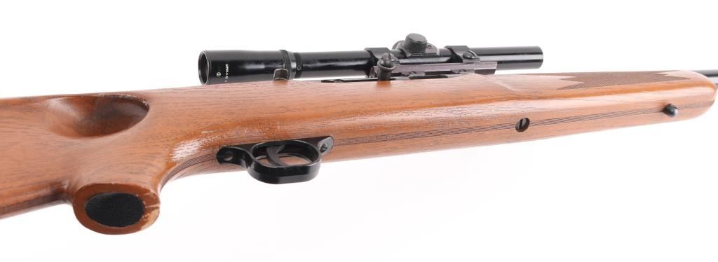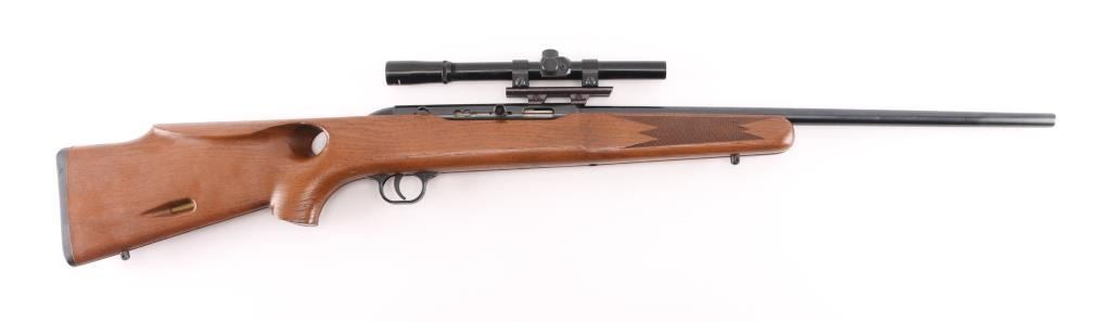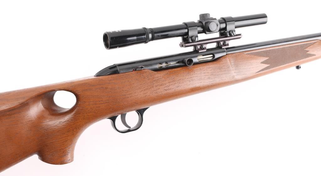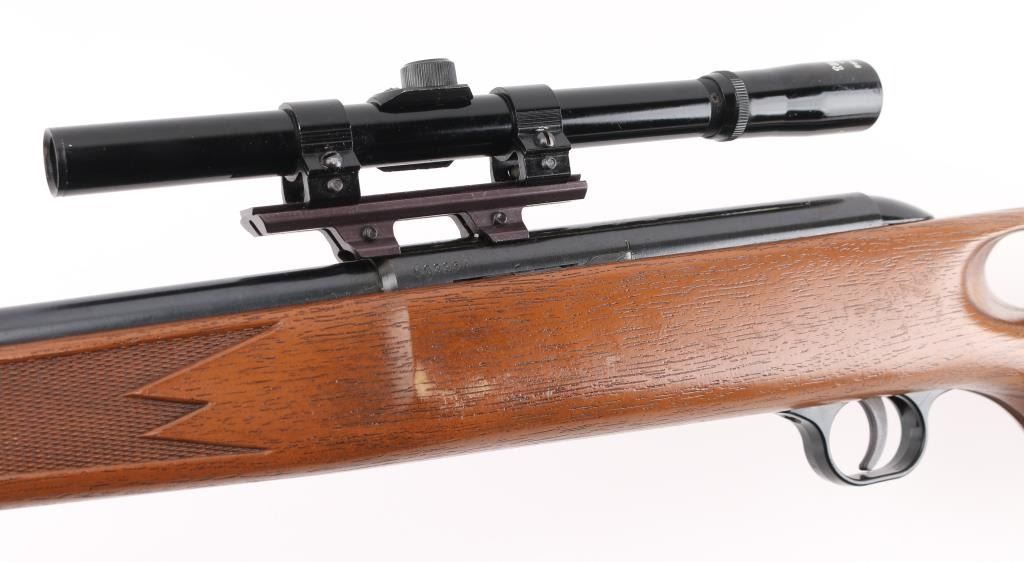 The 'Plinkster'. Mossberg fun gun that was made 1977 to 1979. It has a synthetic stock with a thumb hole and cheek piece, sling swivel studs. It has a 15 round tube magazine in the stock and a 20" sightless barrel. Equiped with a Tasco 4X15 scope, clear optics, the barrel has AC-KRO Grove rifling and an excellent bore. Stock is very good with s couple of scuffs, blue is excellent. NRA Condition-Near Excellent. Modern Firearm.