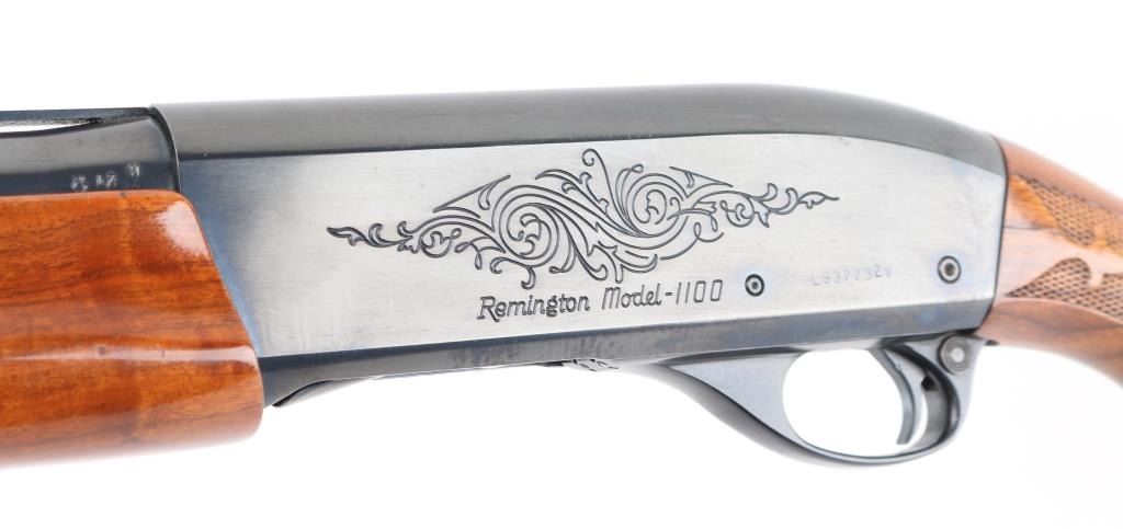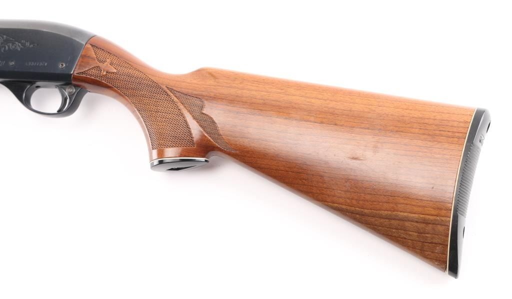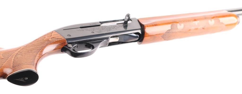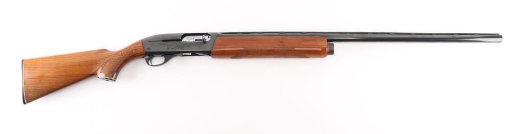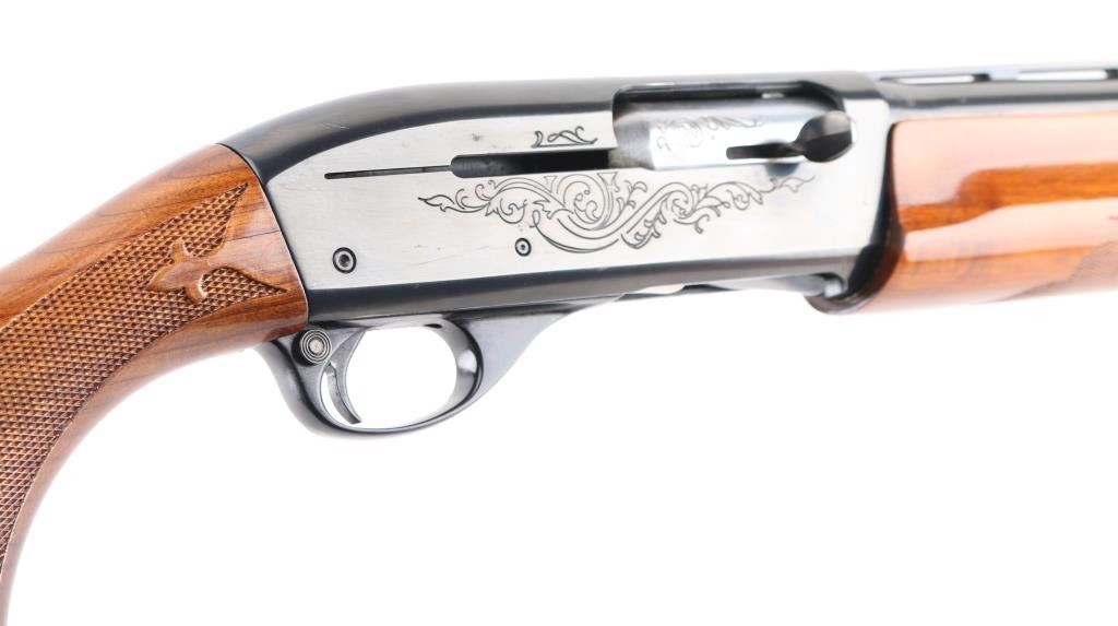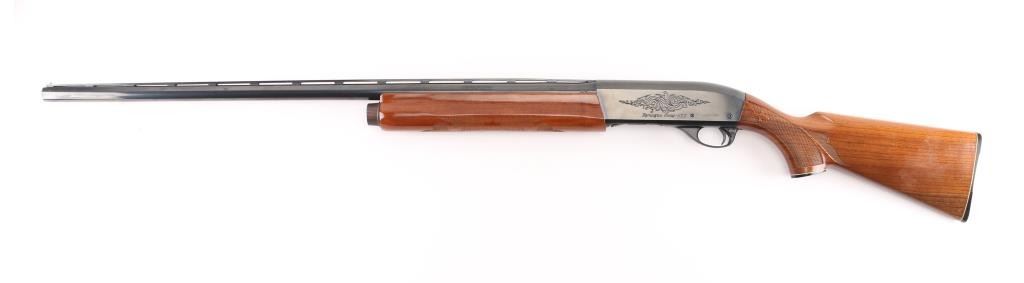 SN: L937732V. Shotgun. Semi-Automatic. Gas-Operated. Produced 1963-Present. 30" vent rib barrel with metal sighting bead. 3" chamber. Full choke. 4-rd tube magazine. Push safety. Bottom loading, side ejecting. Floral scroll designs on receiver. Bore appears excellent. Action is crisp/tight. Blued finish is about 98% with minor scratches. Checkered walnut stock and forearm are excellent. Black Remington butt plate. Manufactured 2005. LOP is 14". NRA Condition-Excellent. Modern Firearm.
