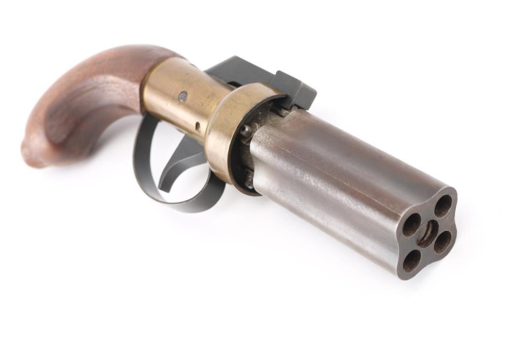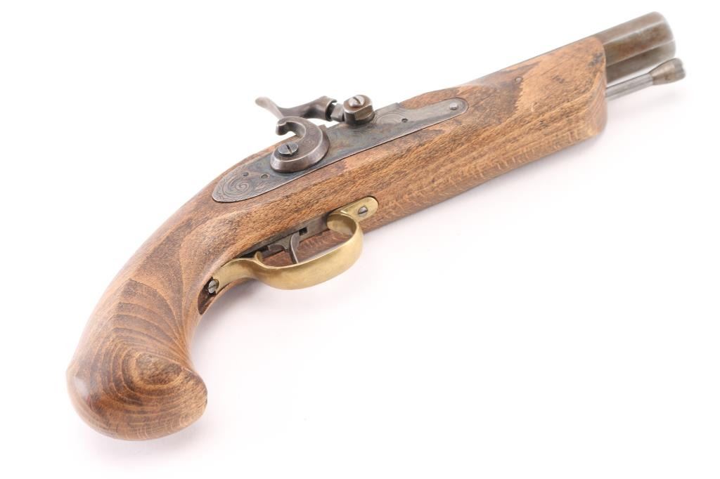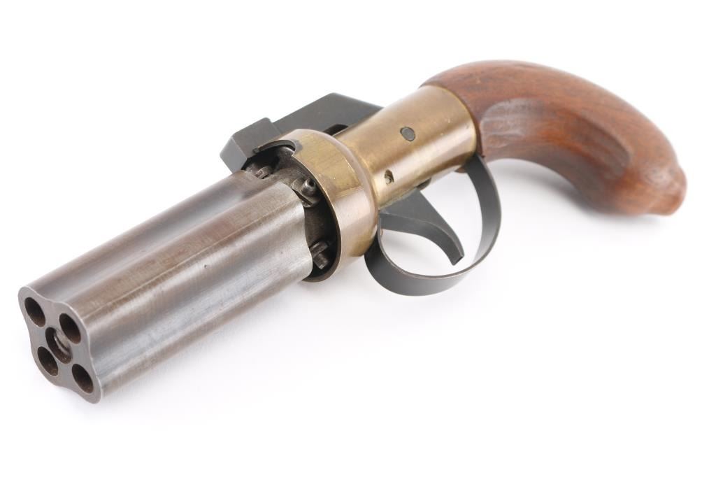 1) SN: 131843. Spanish made percussion pistol chambered in .45. Features a blued finish, 6" octagonal barrel, blade front sight, missing rear sight, steel ram rod, engraved case color lock, smooth trigger, brass furniture and one-piece wood stock with bird's head grip. barrel exhibits an aged patina with some light scattered surface rust. Action performs well, rifled bore appears very good, dirty and wood stock is very good. NRA Condition-Good-Missing Sight, Antique Firearm 2) NVSN, CMC black powder replica pepper box pistol 4 barrel, 36 Cal, modern made. Functions great, you have to charge the bar hammer by lifting it slightly after firing, and turn the barrels manually. 3 1/4" barrel , bores look very good, dirty, the blued barrels are turning a brown patina from handling. NRA Condition-Very Good. Antique Firearm.