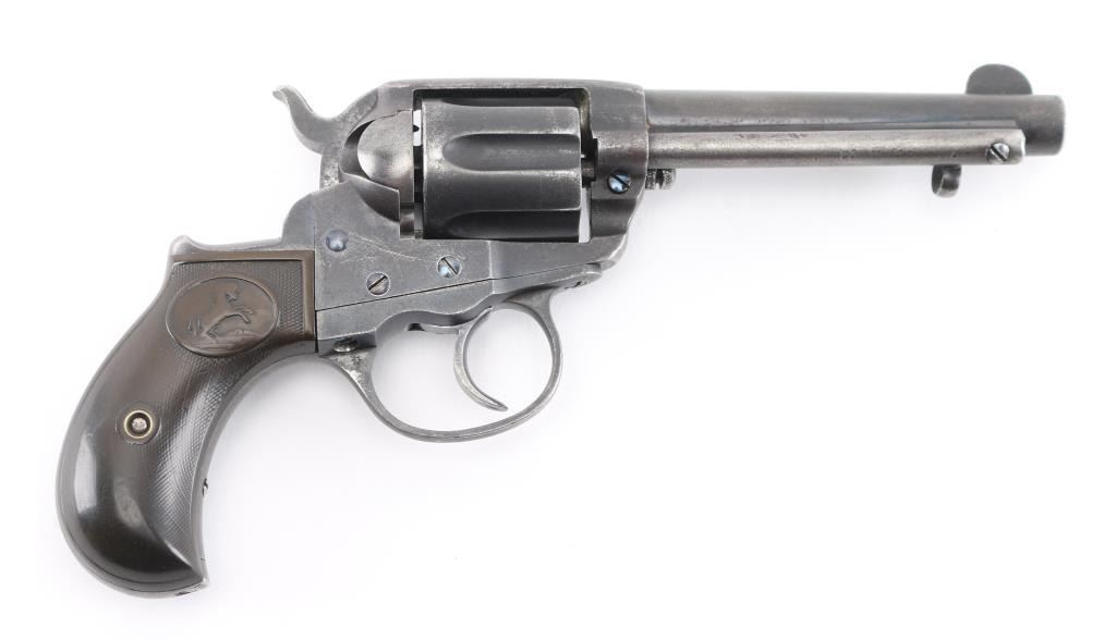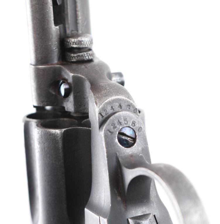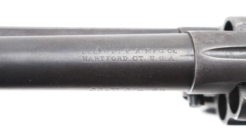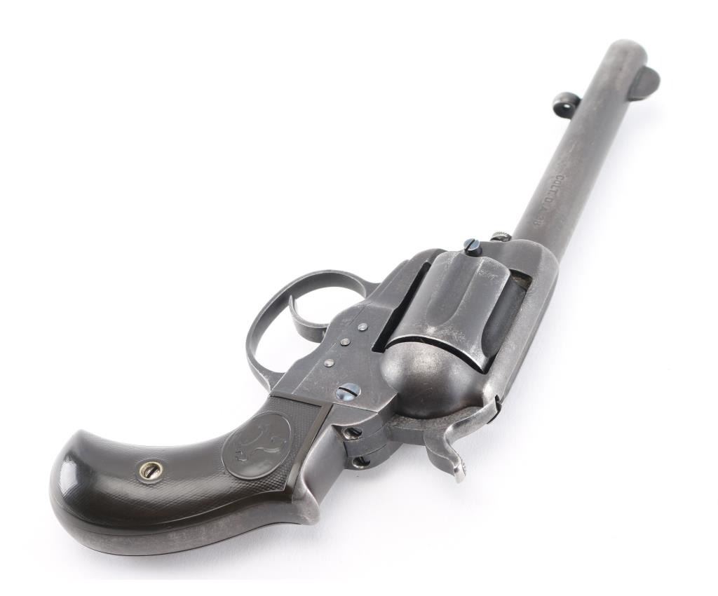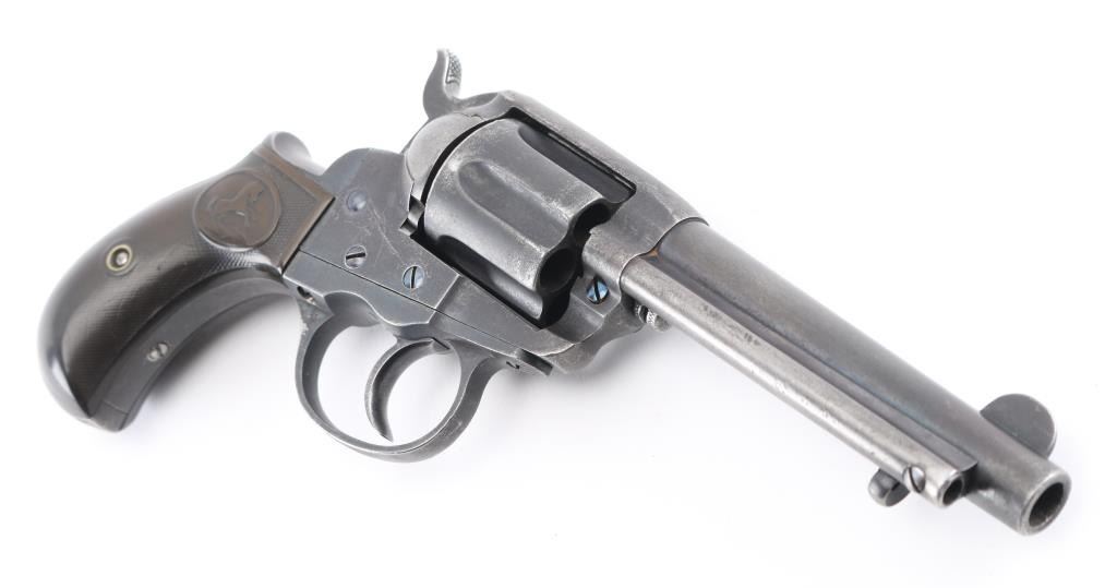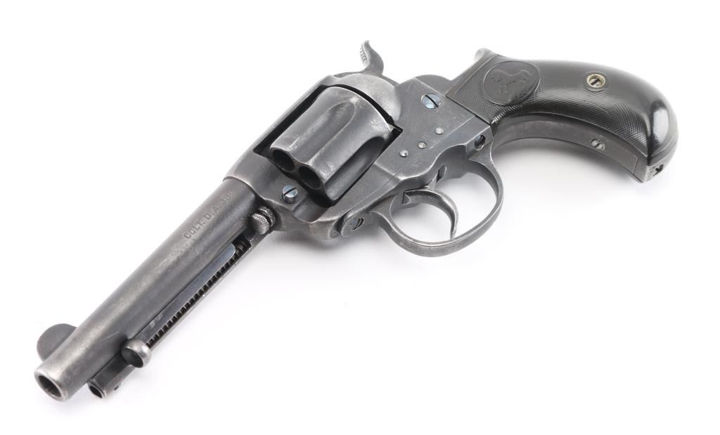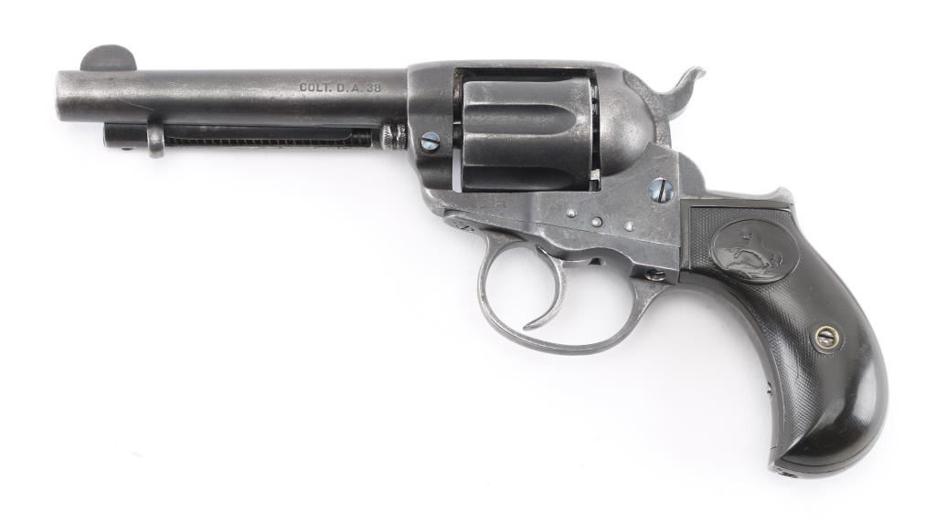 Single and double action blued steel revolver, approximately 4 3/8" barrel, left side of barrel is marked "Colt D.A. 38", semi-circular blade front sight, rear sight is an integral notch in the top strap, flip open loading gate, side plates have two screws on the right and one screw on the left, checkered hammer spur, smooth trigger, hard plastic two-piece grip with Colt logo, retains approximately 80% of an old reblued finish, small dings in ejector rod housing, The trigger guard and bottom of the grip are marked "124580". Manufactured circa 1901. This model was Colt's first double action revolver and it was initially cataloged, “Colt’s Double Action, Self-Cocking Central Fire Revolving Pistol.” **NRA Good** Modern Firearm C&R Eligible