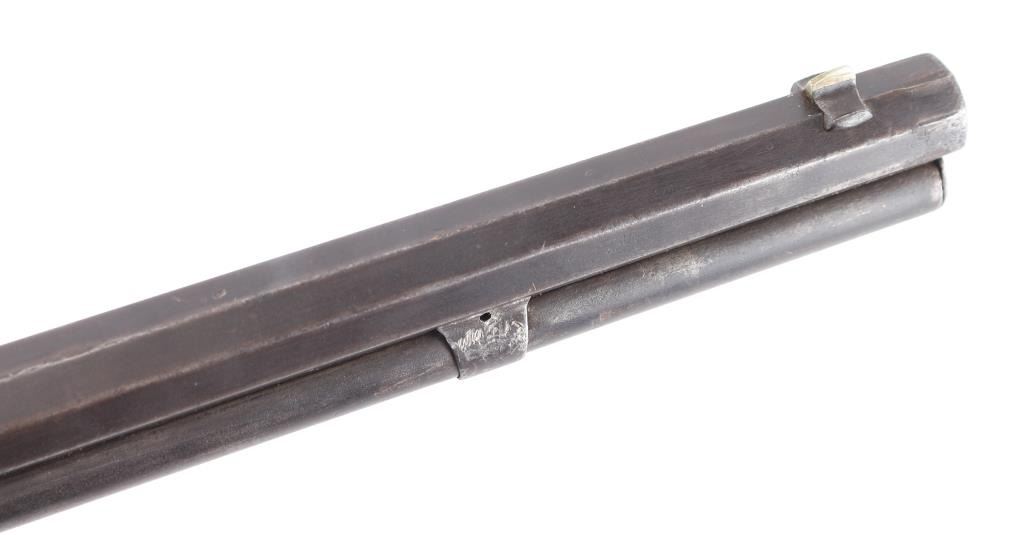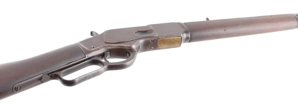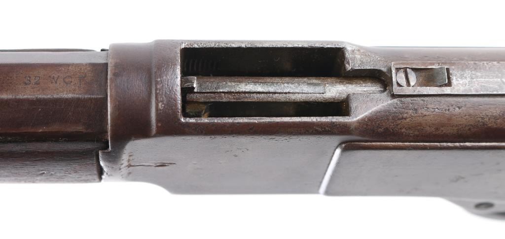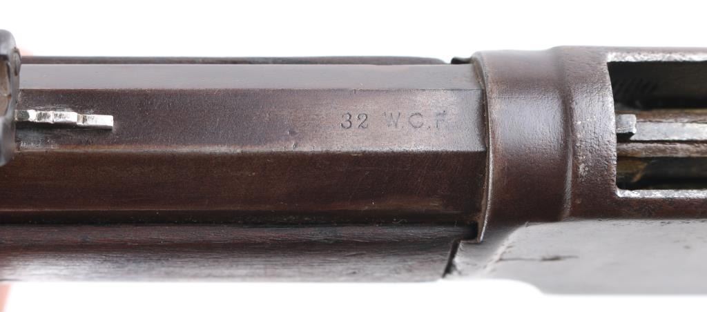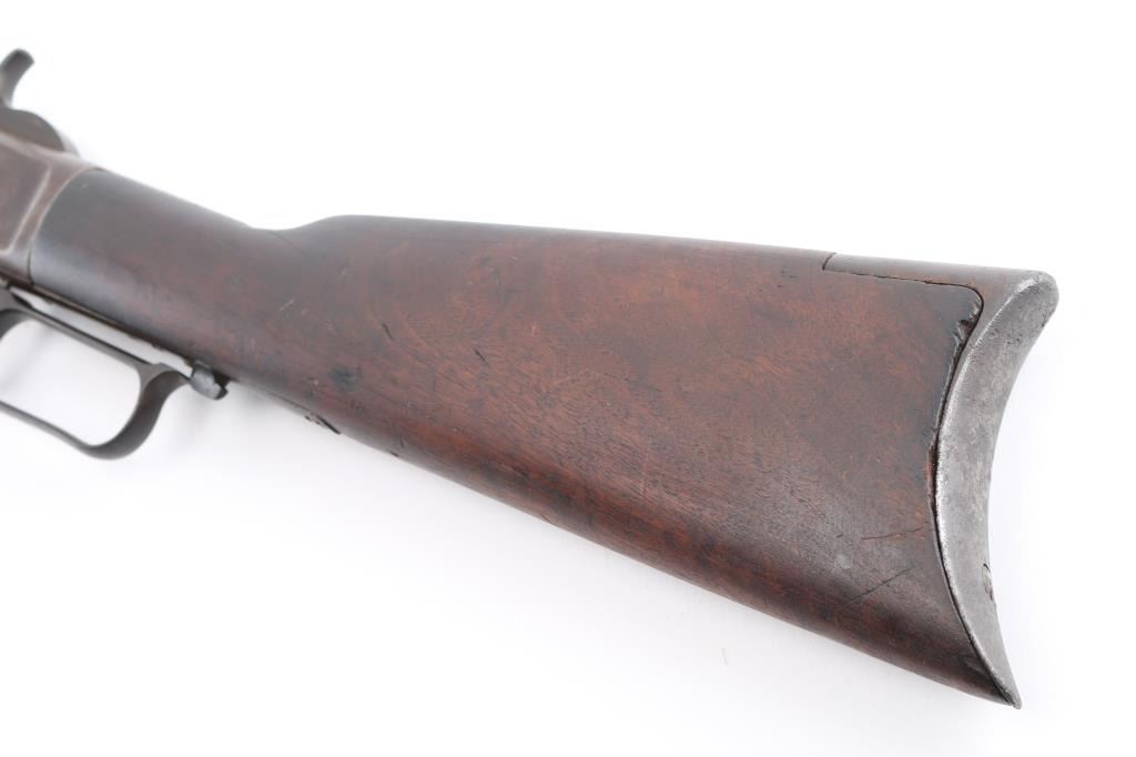 Third Model' manufactured circa 1890. Features 24" octagon barrel with front blade, adjustable rear sporting sights the elevator looks like a newer replacement, full length magazine tube, buckhorn sights, straight wrist, finger lever latch, sliding dust cover is missing, steel crescent buttplate. Bore is fair , light pitting with rifling. Finish is gone, turned a brown patina with scattered areas of pin prick pitting .Action is smooth. Dust cover is tight. Model marking on top tang, two line barrel address is crisp, serial number on bottom tang and model markings on the upper tang., "32 Cal" brass lifter markings are feint from handling, but readable. Wood is good/sound with minor scratches/dings .Barrel band has tool marks, missing pin. The small dust cover spring is broken. NRA Condition-Fair-Missing Dust cover. Antique Firearm.