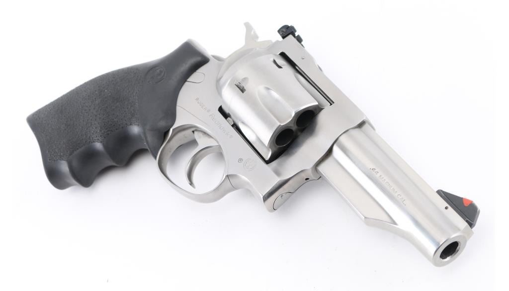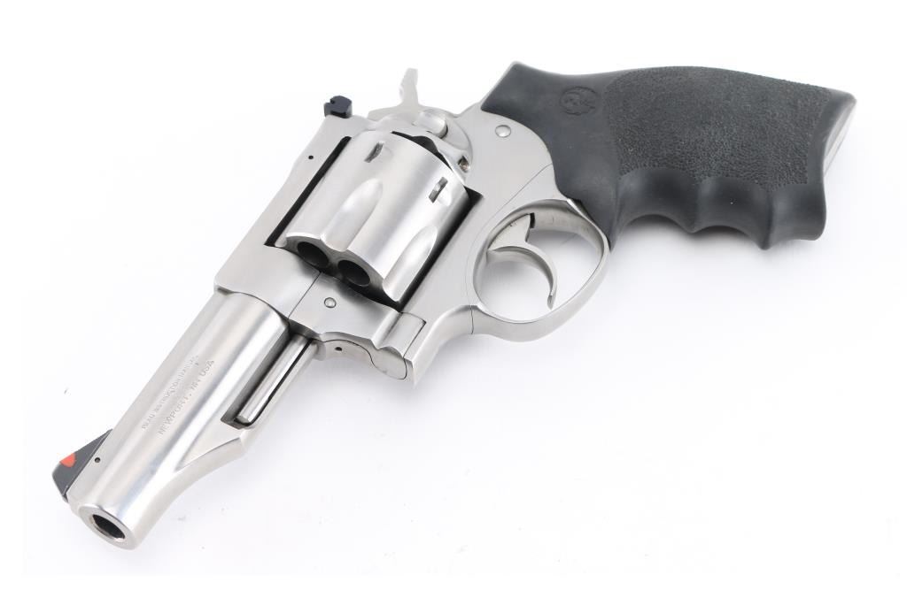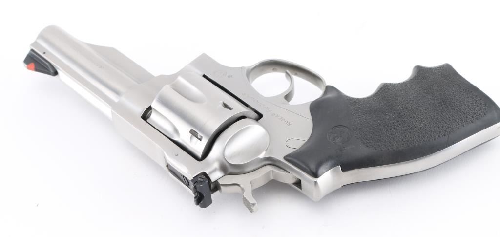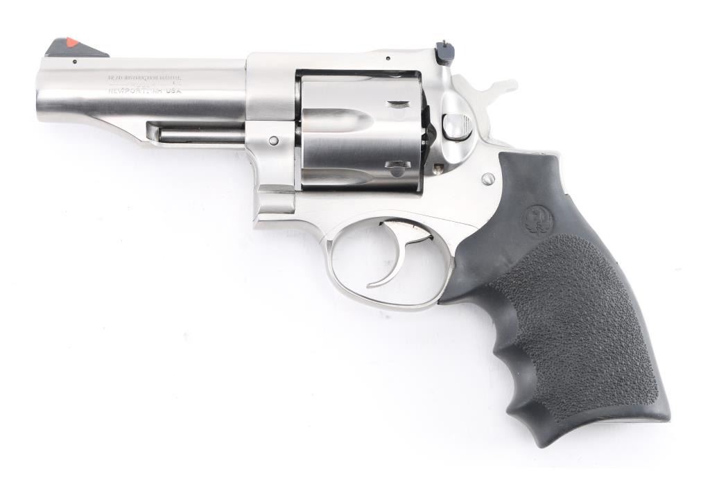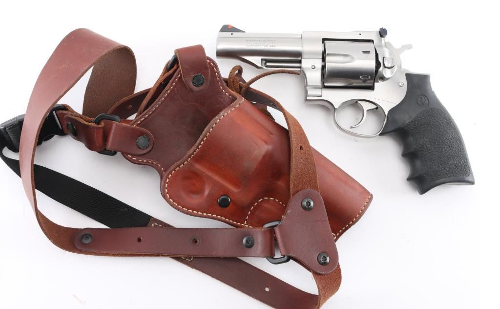 American made, stainless steel six-shot revolver, approximately 4" barrel, bore and cylinders are bright, rear of barrel has soot, front and back of cylinder have soot, red insert on a serrated ramp front sight, micro-adjustable notch rear sight, checkered hammer spur, serrated cylinder release, smooth trigger, one-piece Hogue rubber grip, light rub marks on frame. Rugged stainless steel construction with no side plates, is designed specifically to handle powerful magnum loads through extra metal in top strap, sidewalls and barrel mounting areas. Triple-locking cylinder is locked into the frame at the front, rear and bottom for more positive alignment. Includes a brown leather chest holster made by D. Johnston of Alaska. **NRA Very Good** Modern Firearm