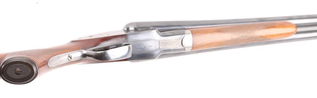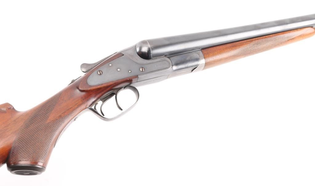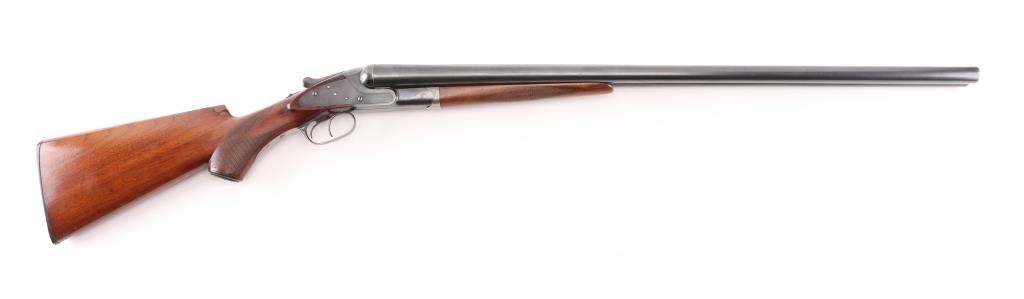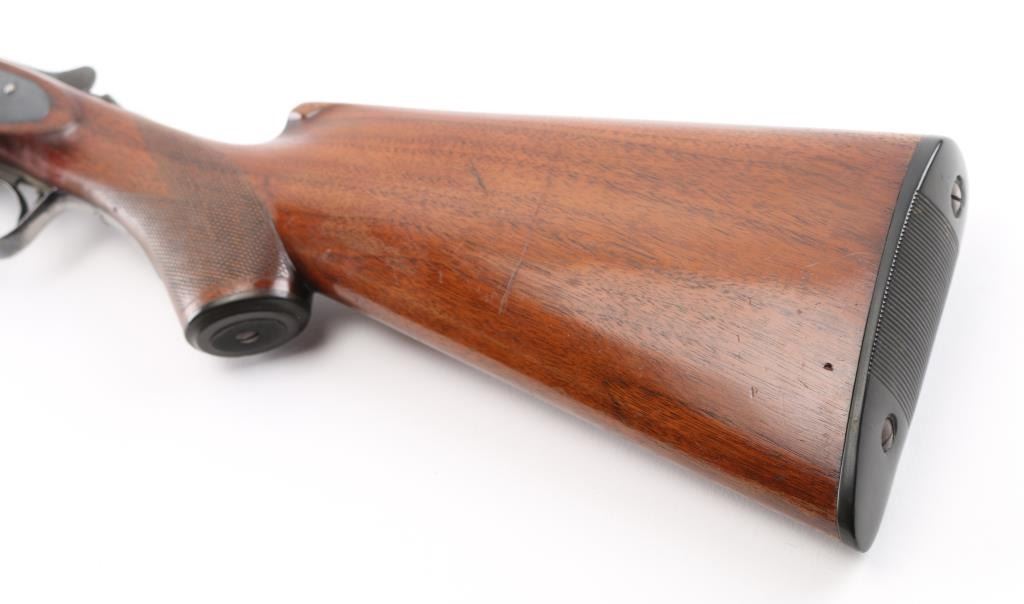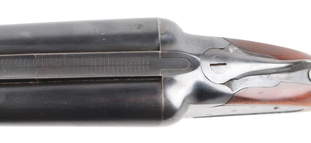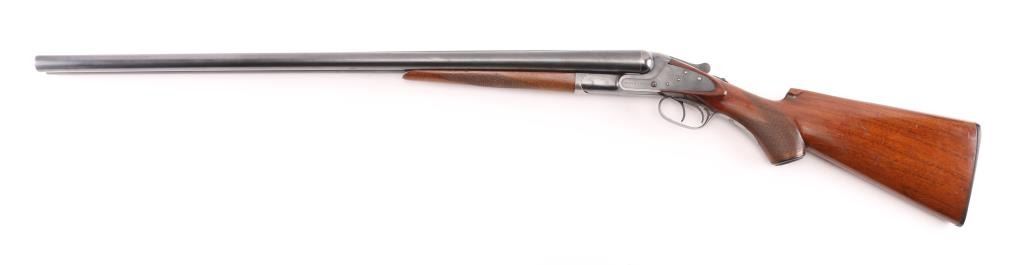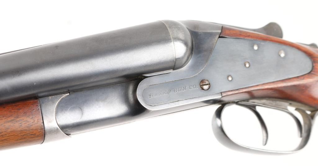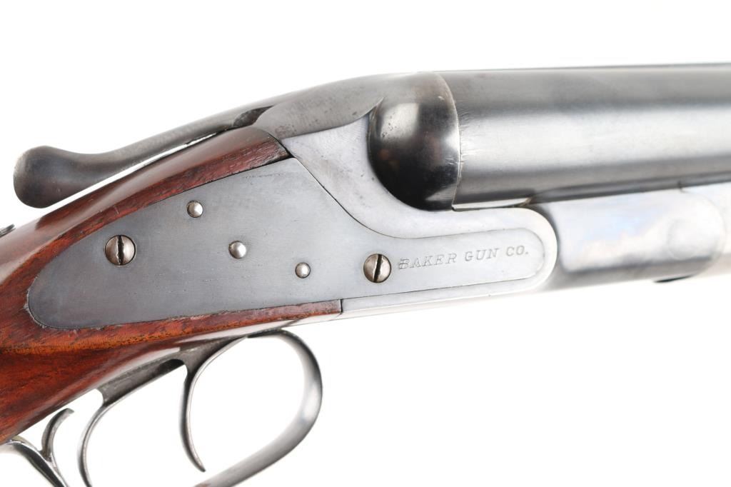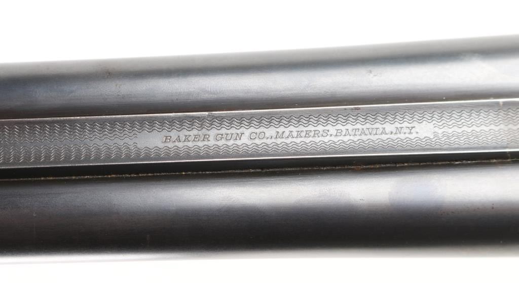Vintage American made shotgun. Side by Side. Made by Baker Gun & Forging Co., Batavia, N.Y. (1887-1919) Considered to be one of Americas classic shotguns. 28" barrels, steel sighting bead, double triggers, tang safety. Hammerless. Barrels lock up tight. 2 3/4 chambers, full & IM chokes, LOP is 14". Bores appear very good, need cleaning. Blued metal finish is about 75% with handling/muzzle wear, some finish loss on the lower tang & triggerguard. Checkered walnut, pistol-grip stock/forearm are very good, black composite butt plate & grip cap, some minor scratches/dings. NRA Condition-Good+. C&R Firearm.