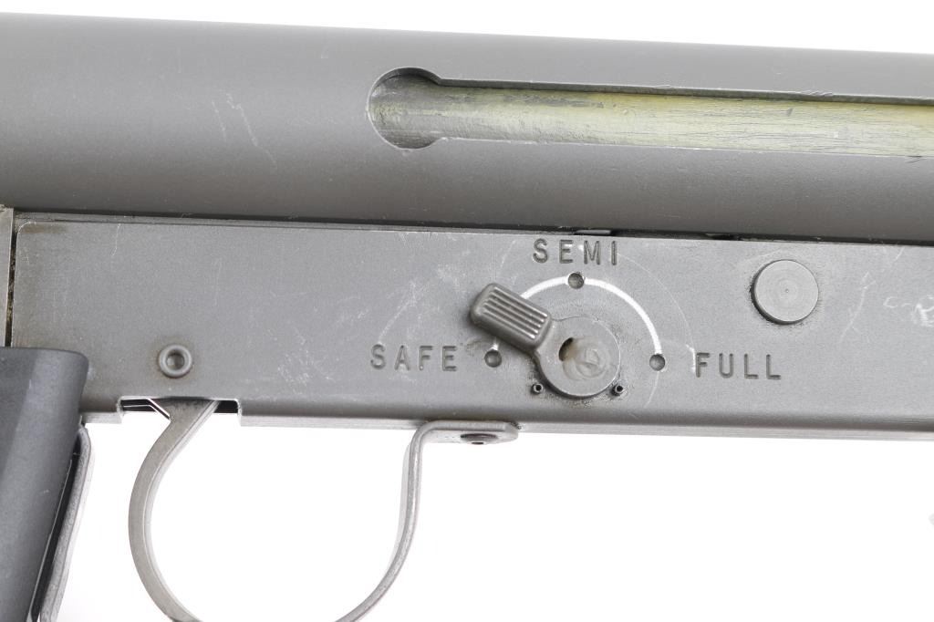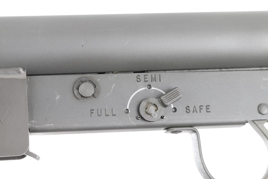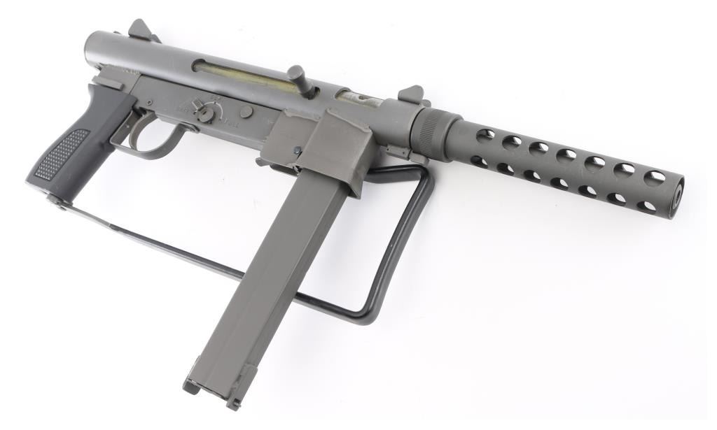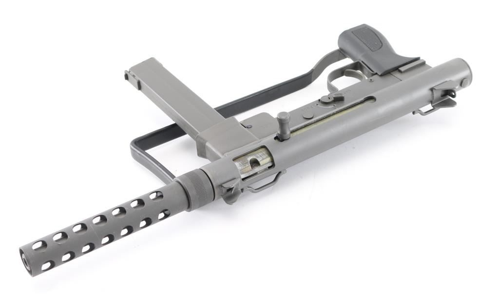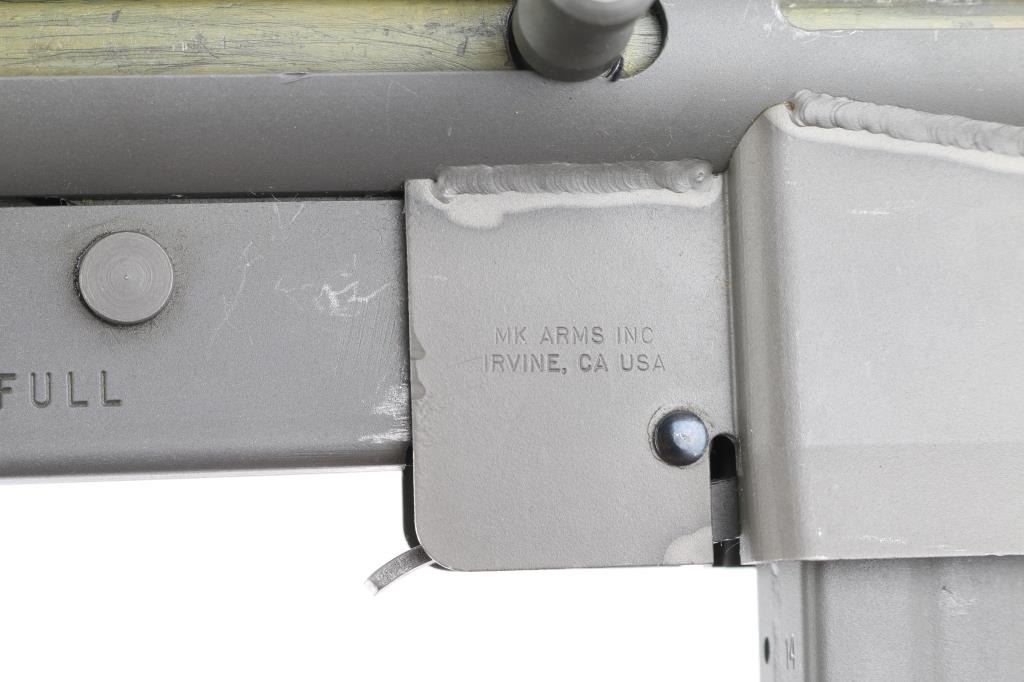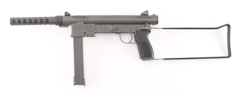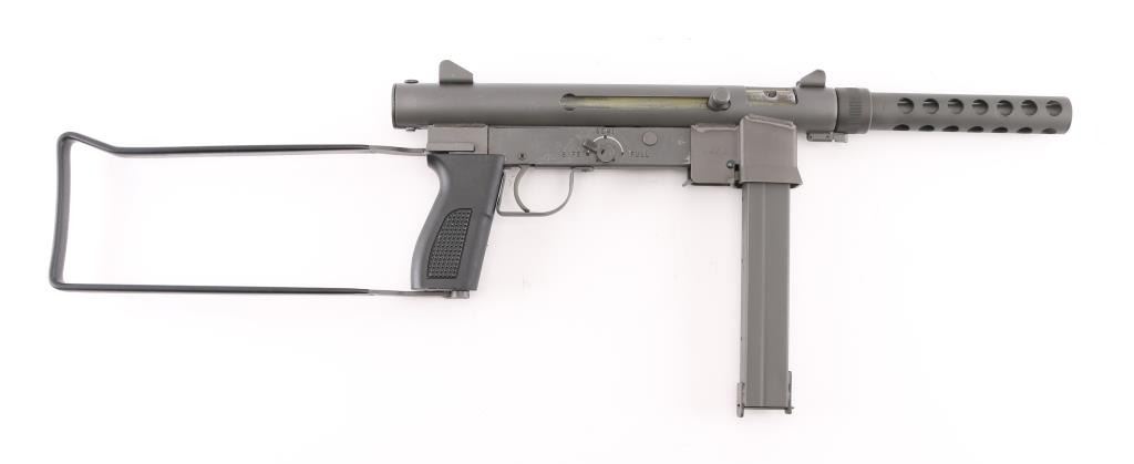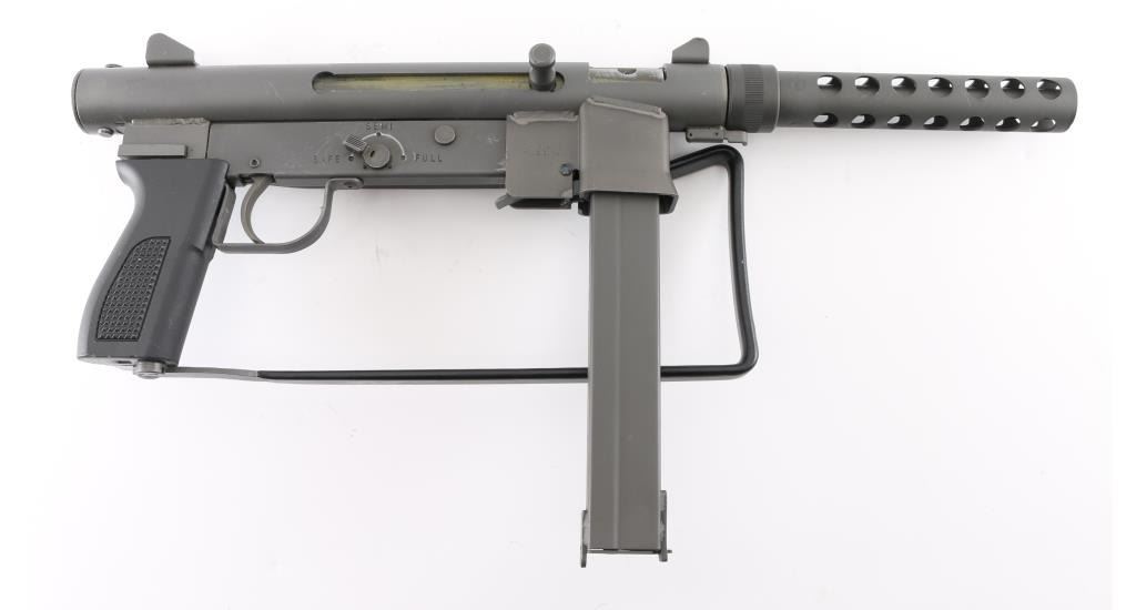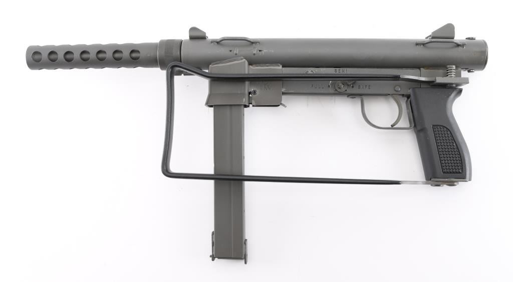 Fully-transferable select-fire open bolt submachine gun chambered in 9x19mm. Manufactured in Irvine, CA circa 1980’s. The MK760 is a clone of the Smith & Wesson 76, which was a copy of the Swedish K (M/45.) MK Arms started out making spare parts for the S&W 76 as production had ceased in 1974, and the police & military units that were using them had no source for them. After the need for parts became non-existent, MK Arms decided to put their inventory to good use and produce their own M-76 clone. They made approximately 1,500 select-fire MK-760s before May 19, 1986, accounting for some of the last fully-transferable machine guns allowed on the civilian market. Features a parkerized finish, 8" barrel with ventilated metal shroud, shrouded post front sight, fixed aperture rear sight, smooth trigger, ambidextrous three-position fire selector (safe, semi-auto & full-auto), unmarked 36 round stick magazine, cylindrical charging handle, tubular receiver, sling points, checkered aluminum pistol grip, and left-side-folding metal skeleton stock with rubber overmold. Machine gun retains approximately 94% of its original grey phosphate finish showing contact wear on the bolt & stock locking mechanism, scattered scuffs, and a bright drag line on the receiver from the fire selector. Action is mechanically sound in all three fire modes, the bore is excellent and the stocks are fine with some minor wear on the pistol grip & slight side-to-side play in the shoulder stock. Condition is NRA Very Good++ ***NFA Firearm*** ***Fully Transferable***