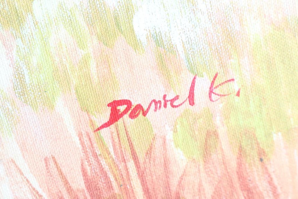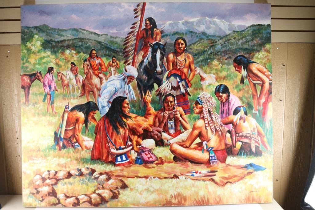 By artist "Daniel K" depicting indian gathering, unframed, "Stretched Canvas" measuring 5x4ft, very large NOTE TO BUYER "Must Arrange Shipping"