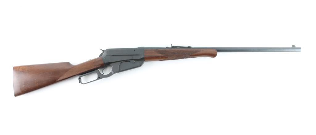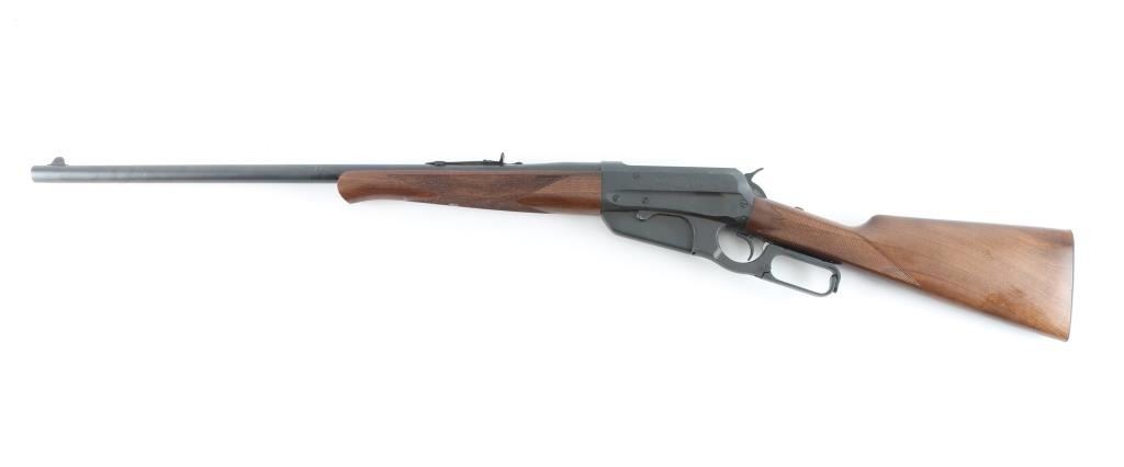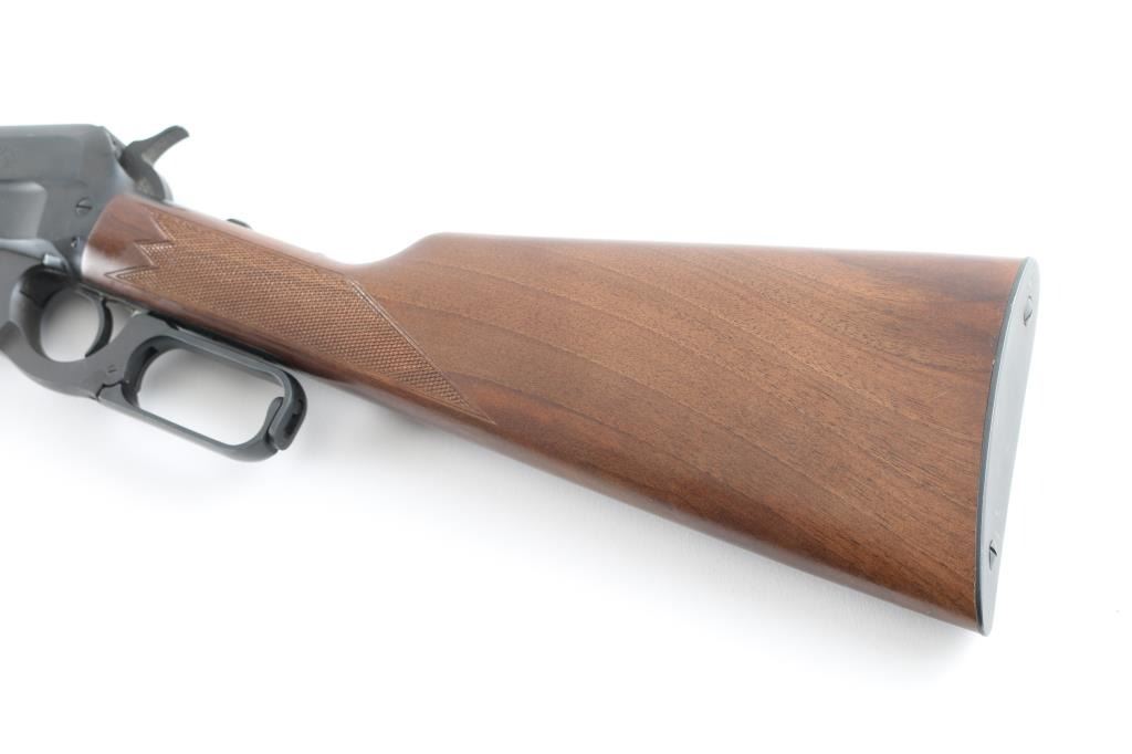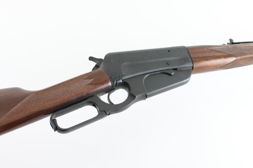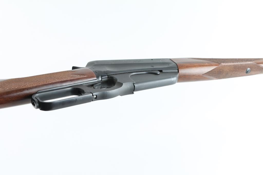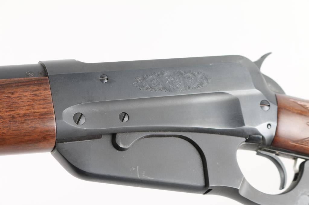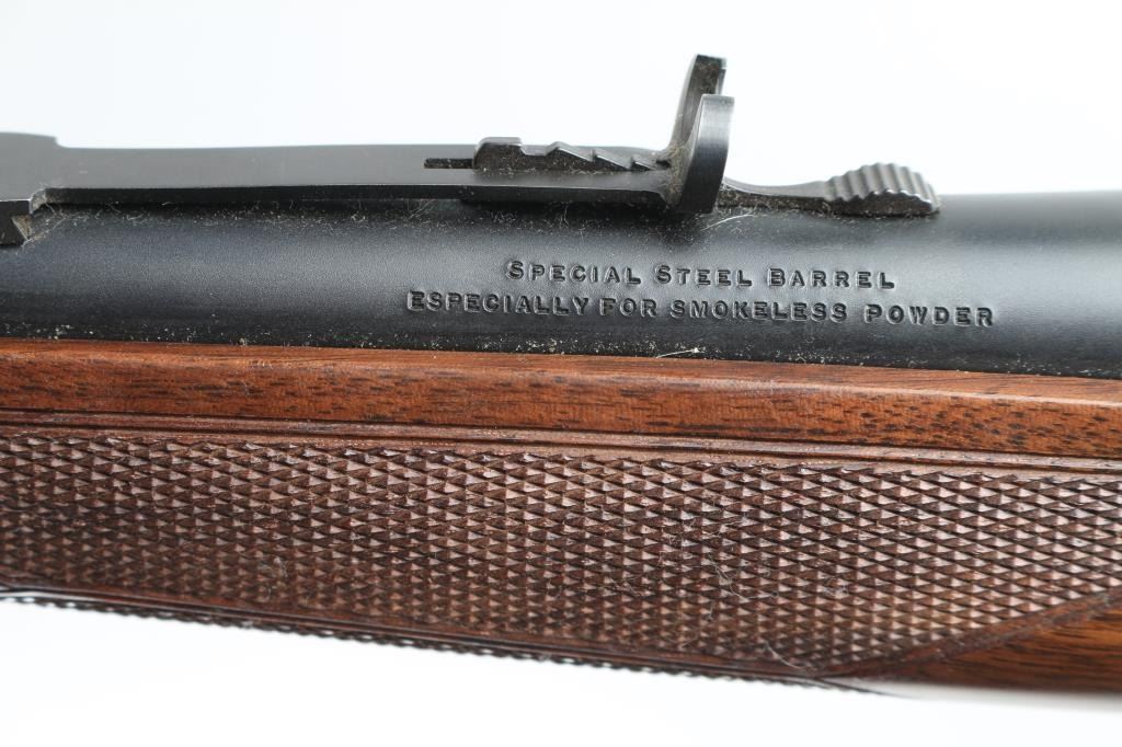 Lever action rifle made in Japan, imported by US Repeating Arms Co, New Haven CT. Features a matte blued finish, 24" tapered barrel, pinned blade front sight with brass bead, elevation adjustable semi-buckhorn rear sporting sight, sliding tang safety, fixed vertical box magazine, smooth trigger, knurled hammer spur, two-piece finger lever, checkered walnut stocks with low sheen oil finish, schnabel forend and straight grip shoulder stock with smooth metal buttplate. Sides of receiver bear limited area floral scroll engraving. Bore is pristine. Overall condition is excellent, with few handling marks, several scratches. Condition is NRA Excellent *** Modern Firearm ***