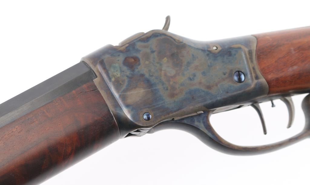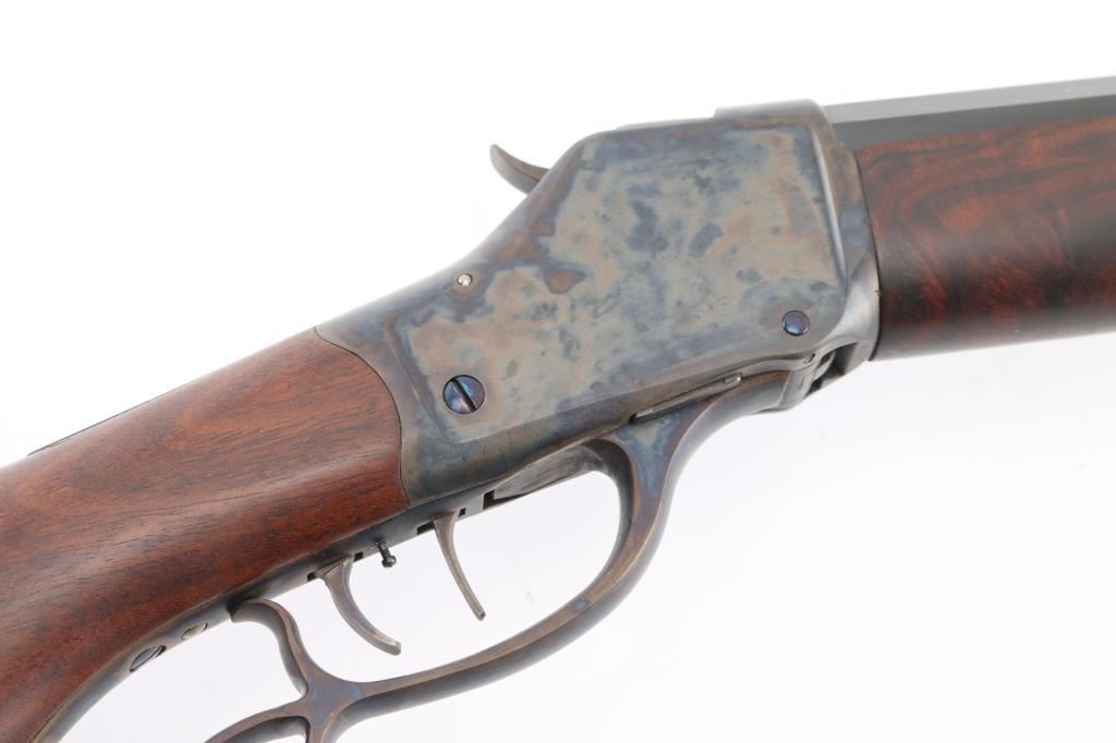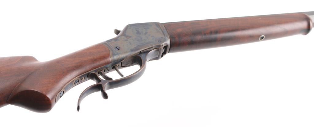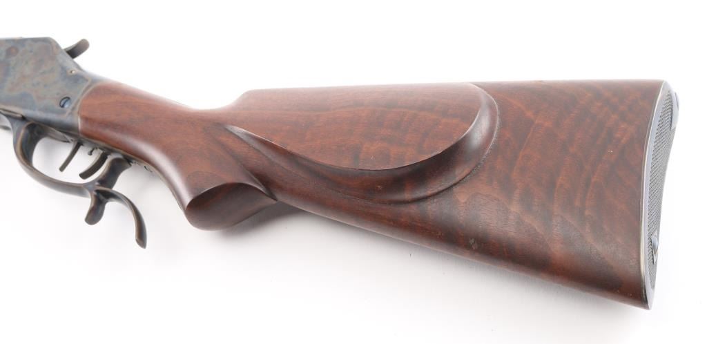This is a professionally restored 1885 High Wall Single shot lever action falling block . Features 30" heavy octagon barrel, missing front sight (Empty dovetail) no rear sight, smooth wood forend with slight schnabel tip, highly figured pistol gripped smooth wood buttstock with steel checkered buttplate, shadow line cheek rest, double set triggers, finger rest lever/triggerguard. Bore is excellent/bright strong rifling. Barrel retains 98% blue with slight muzzle wear. Case Colored action & lever are excellent. Wood is excellent. All markings were scrubbed during restoration, including the serial number, except the Winchester tang markings. Missing upper tang screw. Would be excellent as restored if not for the missing sight & screw. NRA Condition-Good. Modern Firearm