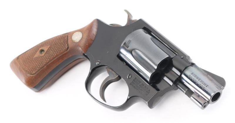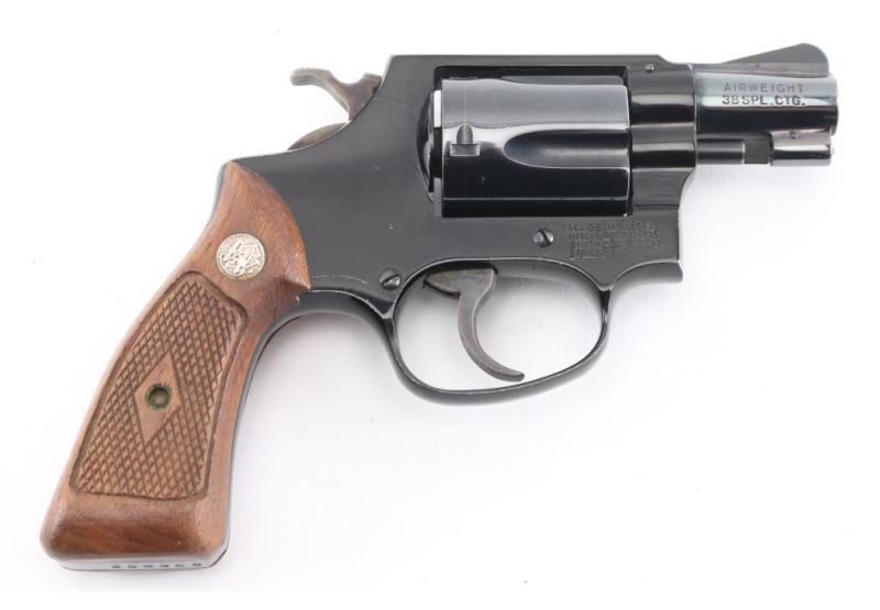 The .38 Chiefs Special Airweight' No Dash, Pinned Barrel, older all machined construction. Small frame double action snub nose revolver. Features a blued finish, light weight allow frame, 1-7/8" barrel with serrated ramp front sight, square notched rear sight, non-shrouded ejector rod, fluted five-shot cylinder, serrated trigger, service hammer with knurled spur, three screw square butt J frame and two-piece checkered walnut Magna grips with silver S&W medallions. Bore and charge holes are excellent. Retains 97% blue with slight showing of bare metal at muzzle and on the cylinder.. Grips are very good with few scratches. Action is smooth with tight lock-up. Comes with a black leather slip-on holster/ Condition is NRA Excellent. Modern Firearm.
