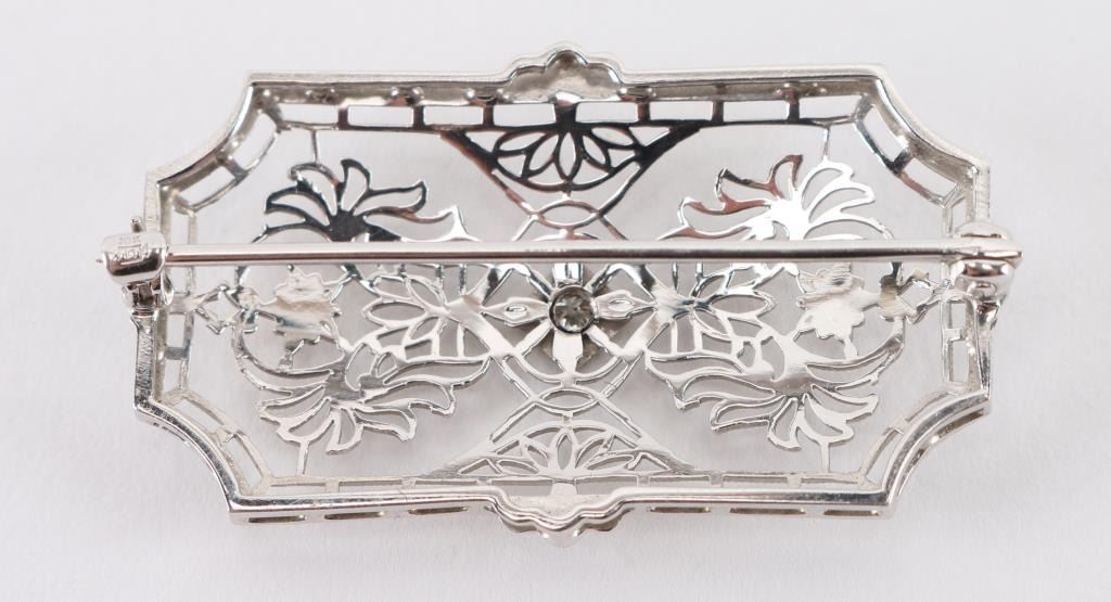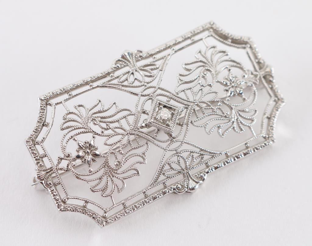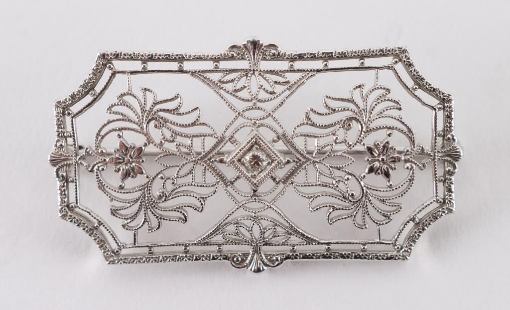 10KT white gold filigree design, set with small round cut diamond 3.85mm total weight 2.6grams.