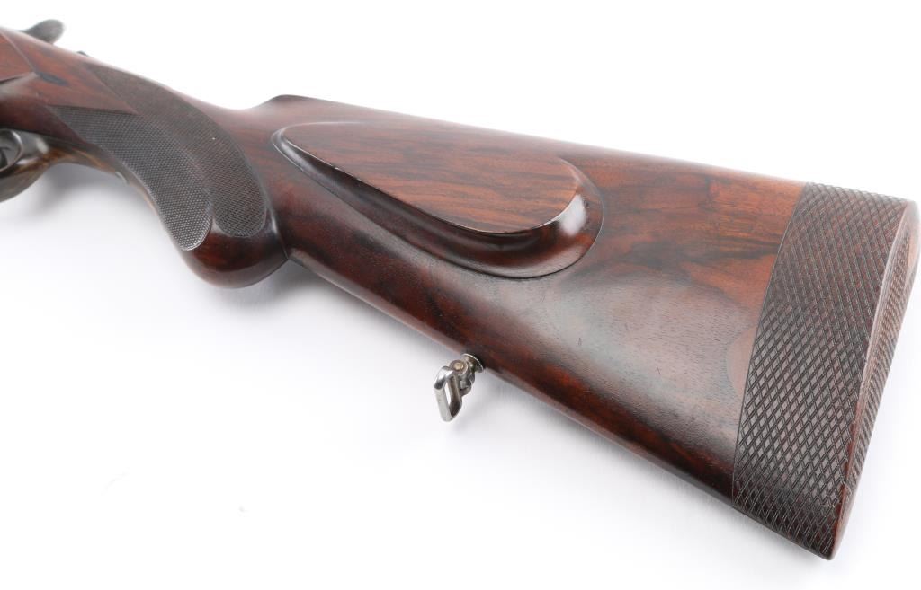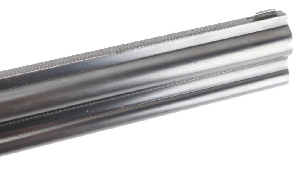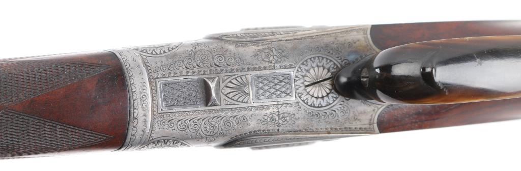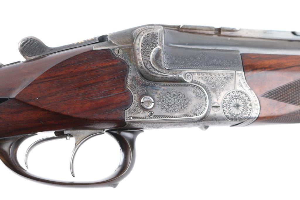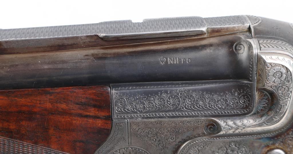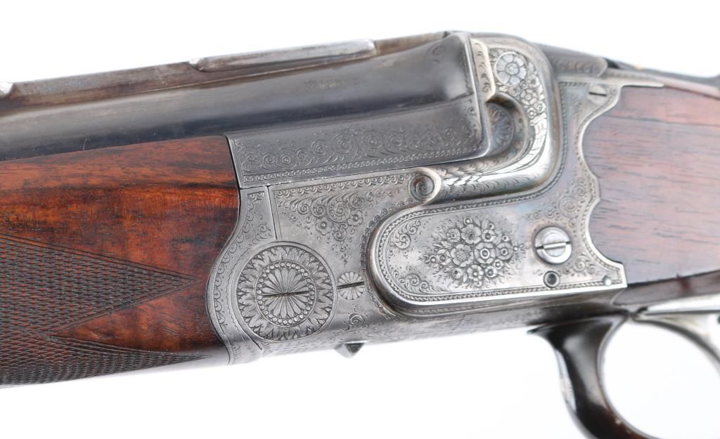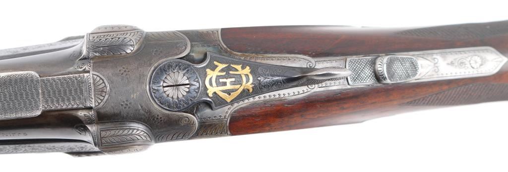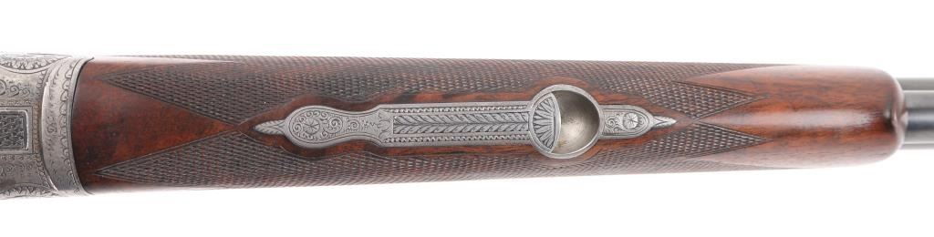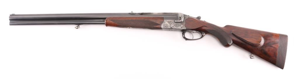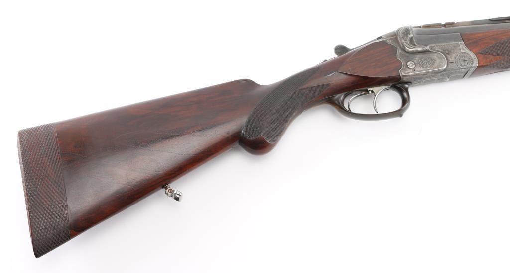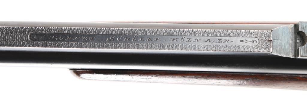 Blued Boehler/Antinit steel barrels with beaded blade front and fixed u-notch rear sights, integral scope base at the breech end of the rib, chamber marked at 2 3/4 inches with single extractor, Kersten cross bolt third fastener, CYL choke, and standard pre-World War II proofs dated 1/1928. Case hardened finished coin receiver and locks with full coverage fine scroll and floral bouquet engraving, dual triggers, manual sliding tang safety, sling swivels and horn trigger guard. Highly figured checkered walnut 'bag' pistol grip stock and forearm with engraved fittings, raised shadow line cheekpiece, fine point checkered panels on forearm & grip, 1.5" rear of the butt stock is checkered. Top lever is gold inletted with the initials "CF" Bores appear excellent, action is crisp with tight lock-Up. Wood is excellent. Blued barrels have some handling loss around the integral scope base, and the receiver has handling loss, mostly on the bottom. All engraving and markings are crisp. LOP is 14" NRA Condition-Very Good. C&R Firearm.