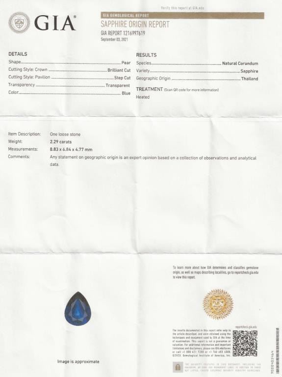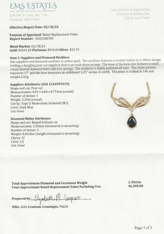 featuring a pear shaped G.I.A. Certified Blue Sapphire weighing 2.29 carats with round Diamond accent set in a graceful vintage setting Made in Italy in 14 karat yellow gold. Full Retail Appraisal - $6,300.00