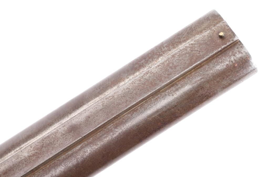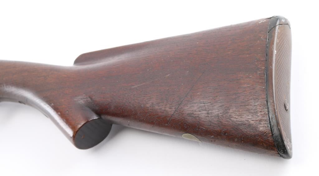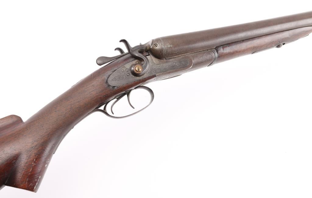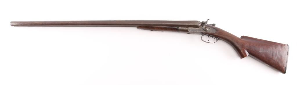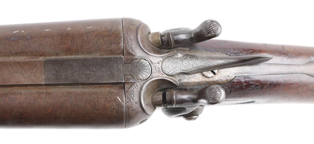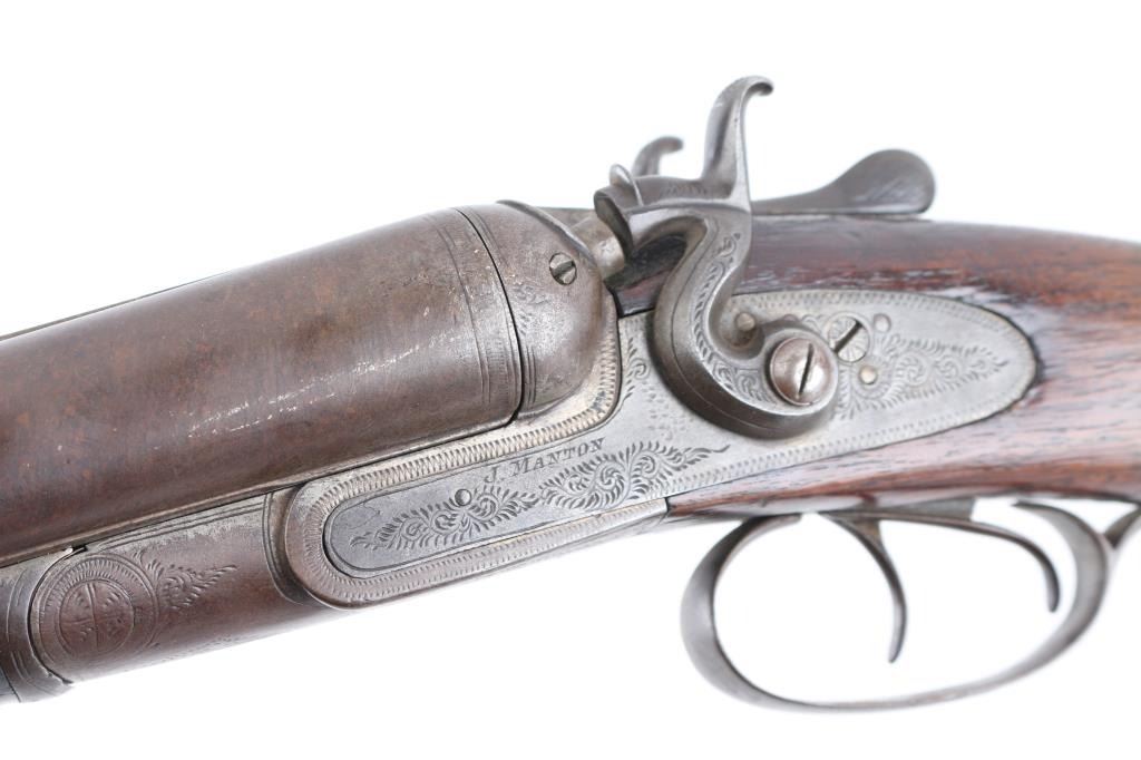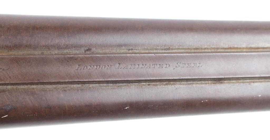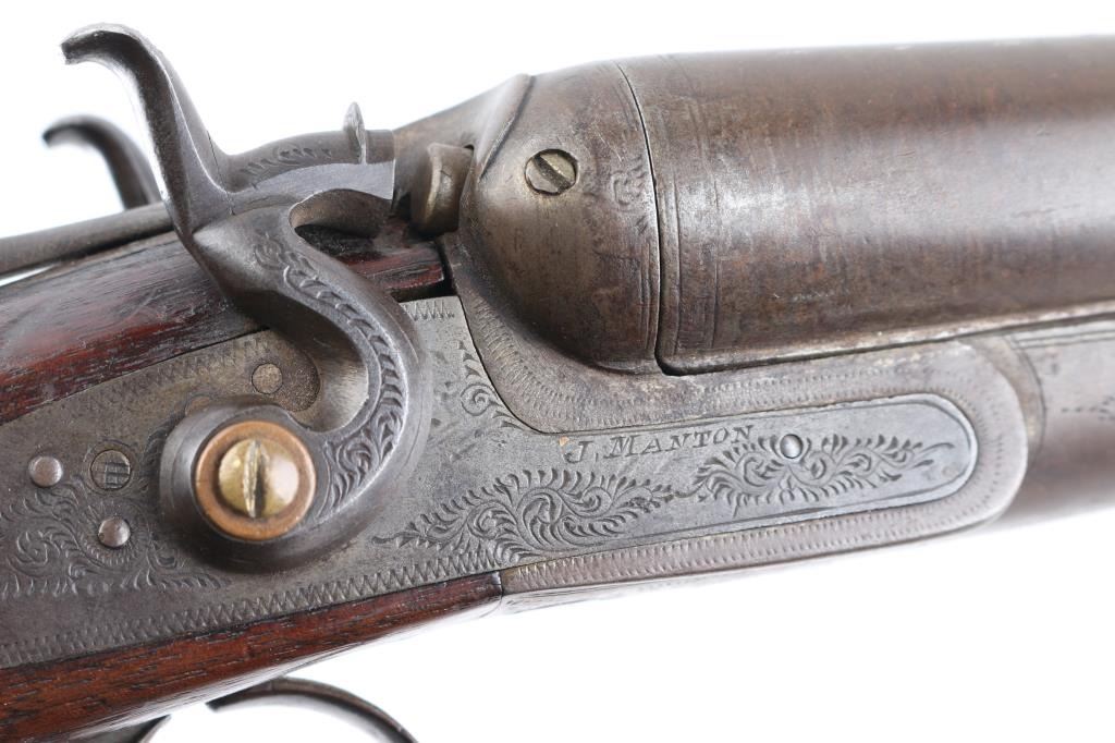 British make double barrel shotgun. Features exposed hammers, back locks, double triggers, 32" Laminate Steel barrels with low smooth rib, chokes measures as CYL, brass bead front sight, top lever opening, smooth wood splinter forend (missing the metal insert tip), grip wristed wood butt stock with shallow checkered wrist, smooth metal buttplate, 14-1/4" LOP. Bores are fair condition, mostly smooth and fairly bright, many small areas of light pitting throughout. Barrels are brown color, mottled shades, light patina in several places. Other metal is grayish color with darker spots from cleaned patina. Right hammer is slightly loose with the screw replaced, action operates properly, lock-up of barrels is tight. Wood is sound with minor scratches/dings, top of buttplate is cracked. "J MANTON" on lock Condition is NRA Good. Antique Firearm.