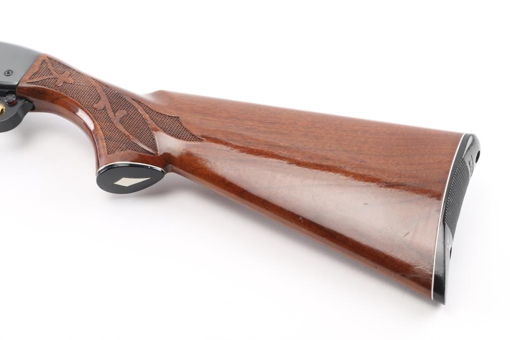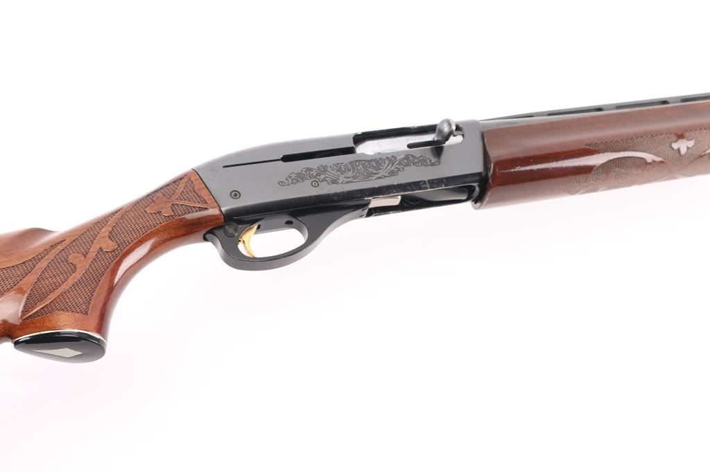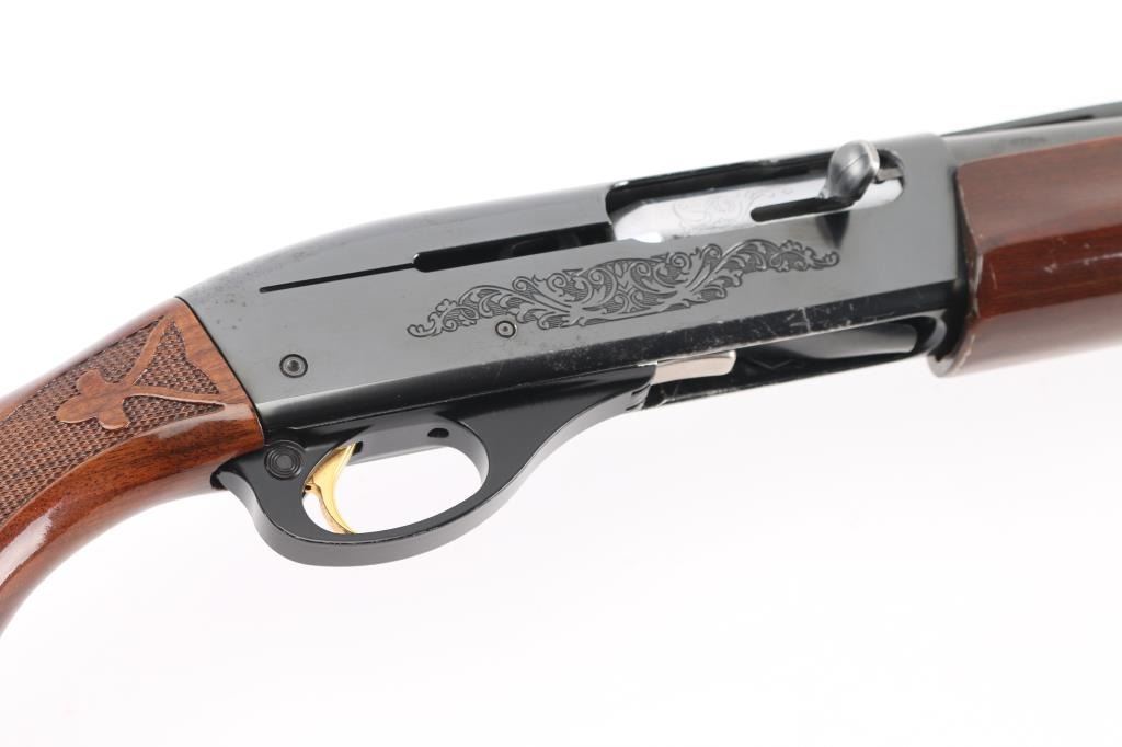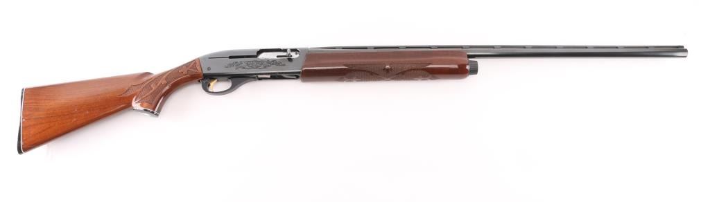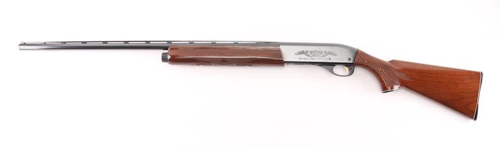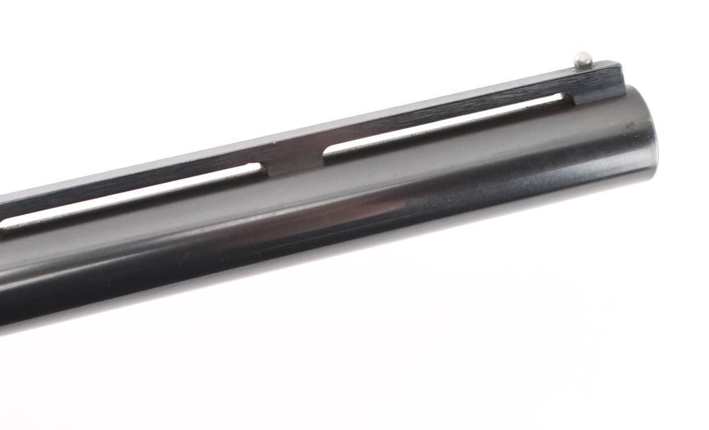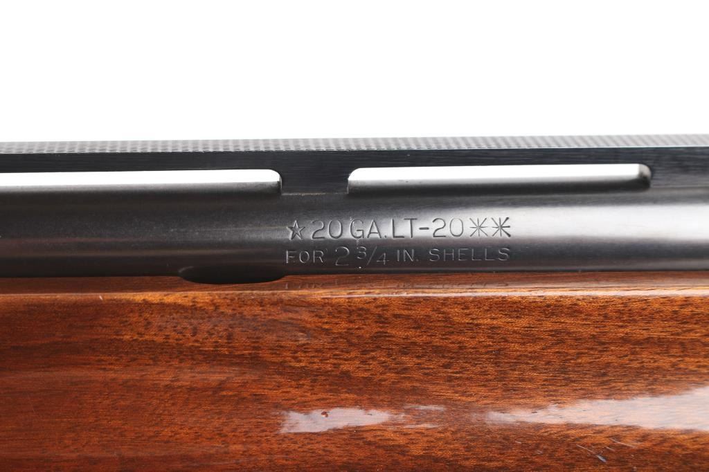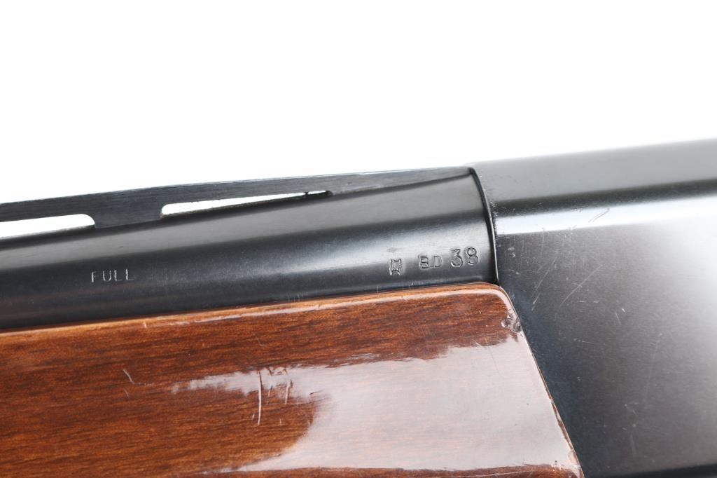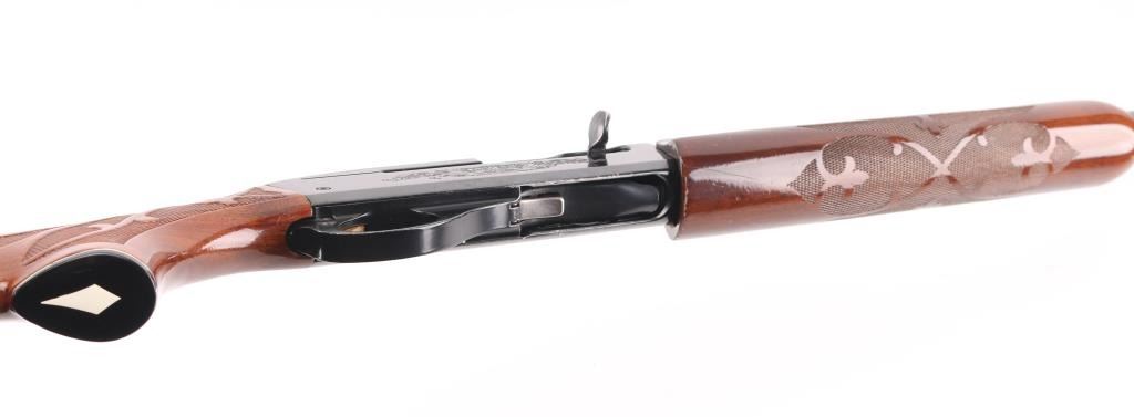 'Light Weight' American made gas operated semi-automatic shotgun chambered for 2 3/4" 20 gauge shells. Two barrel set, includes an installed 28" vent rib barrel with steel bead & Full choke, as well as a 25.5" vent rib barrel with IMP Cyl choke, steel bead front sight. Features blued finish, half-length tube magazine, simple roll-stamp engraved floral scroll on the receiver & bolt, smooth trigger with beveled edges, alloy triggerguard, serrated charging handle, push button safety, steel receiver, fancy checkered walnut forend and pistol grip shoulder stock with grip cap & factory butt plate. Bores are very good. Retains 90% or better finish with handling marks, scratches on receiver sides, minor edge losses. Wood is very good with some shallow dents, blemishes to urethane finish at toe of shoulder stock. Condition is NRA Very Good++ *** Modern Firearm ***