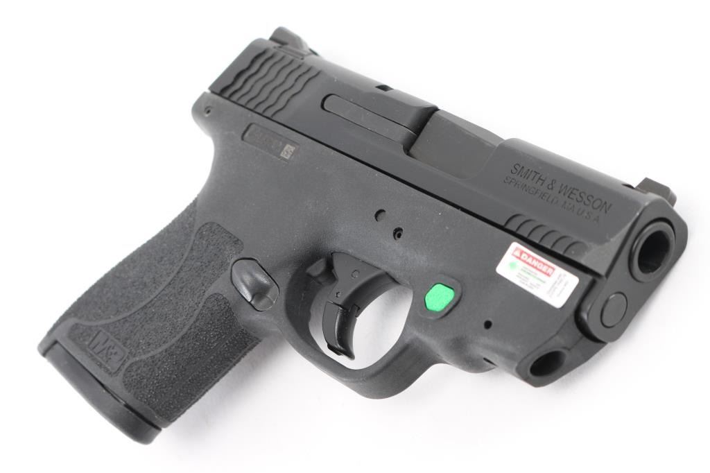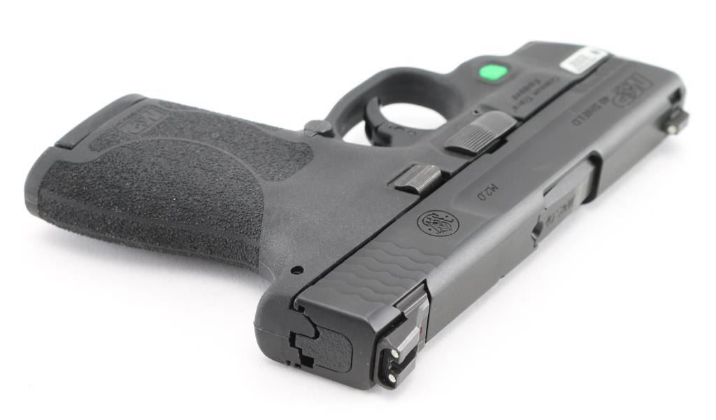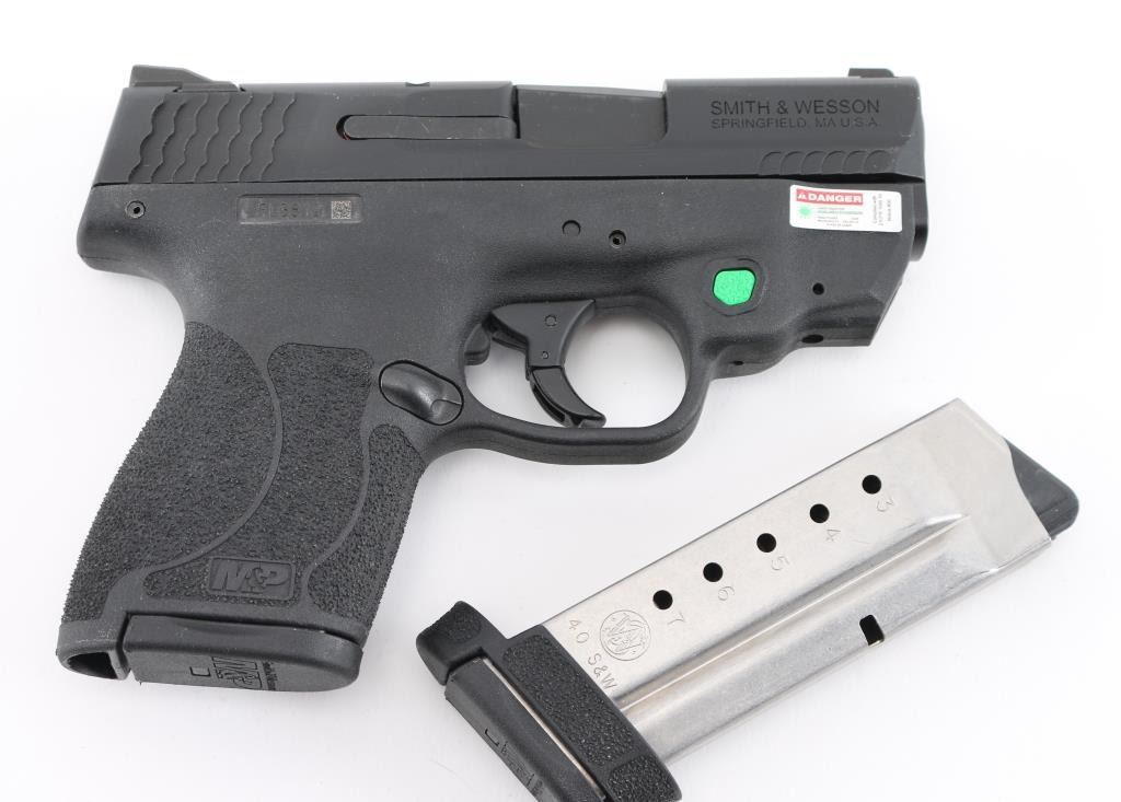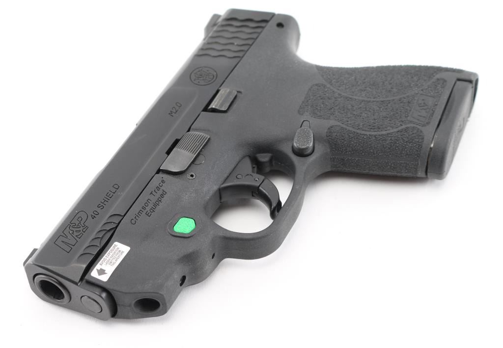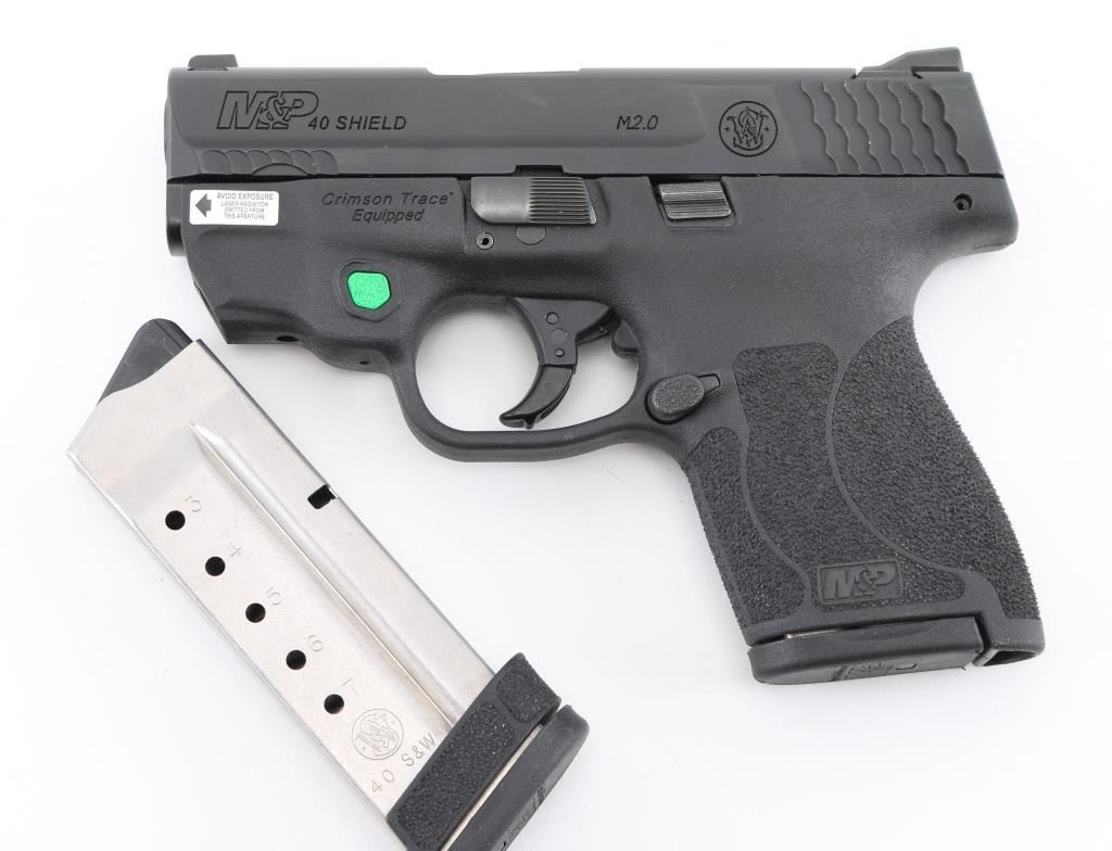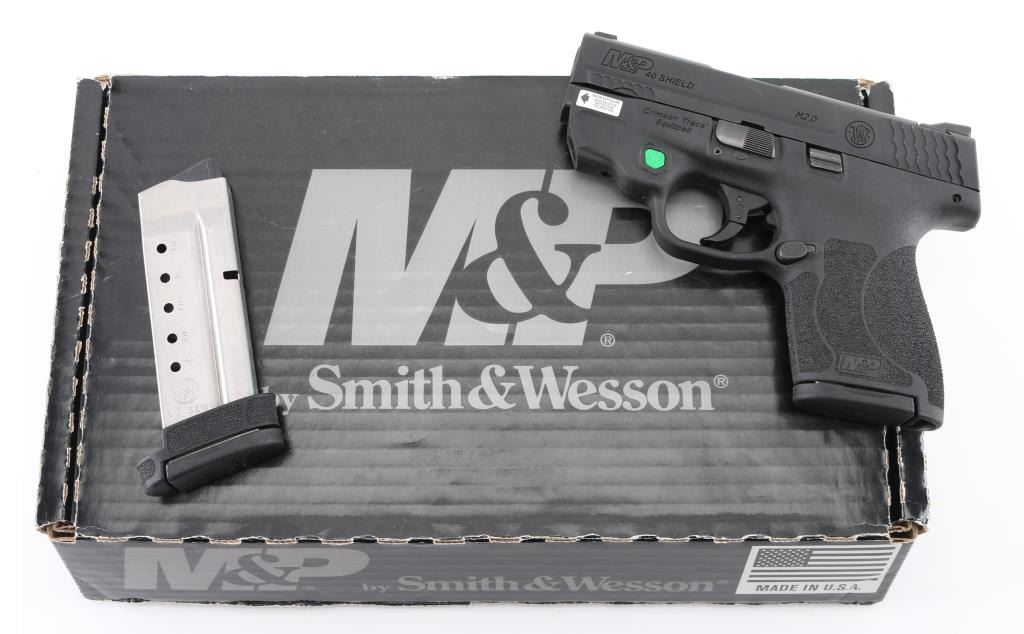 Optimized for concealed carry, the Smith & Wesson M&P 40 Shield M2.0 is a Striker-Fired Pistol chambered for .40 S&W ammunition. It features an Armornite® finish and steel three-dot white sights. Dovetailed front and adjustable rear. A Crimson Trace® green laser is built into the frame, as is an M&P M2.0 trigger. The polymer grips feature aggressive texturing and are set at an 18-degree angle. Bore looks very good, dusty. Slide looks great. Frame looks great. Gun shows little to no signs of handling. Green laser works. Comes with original box, owners manual, lock and two seven round magazines. Condition is NRA Excellent. *Modern Firearm*