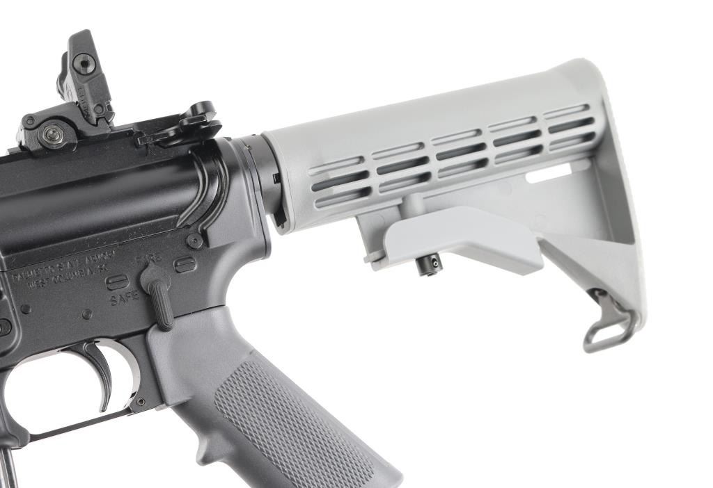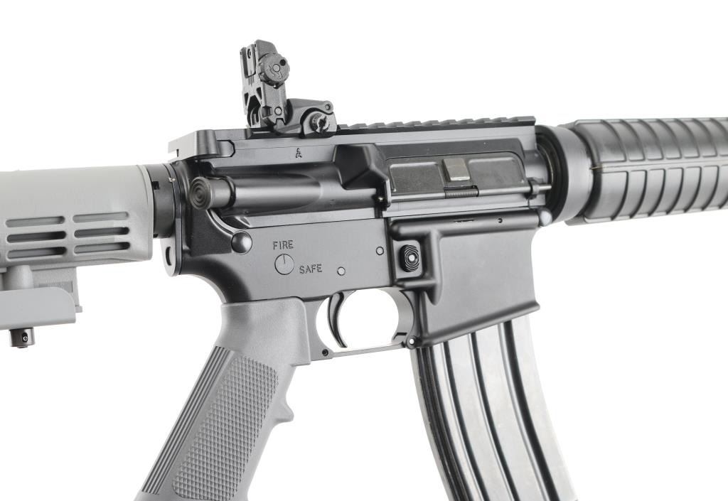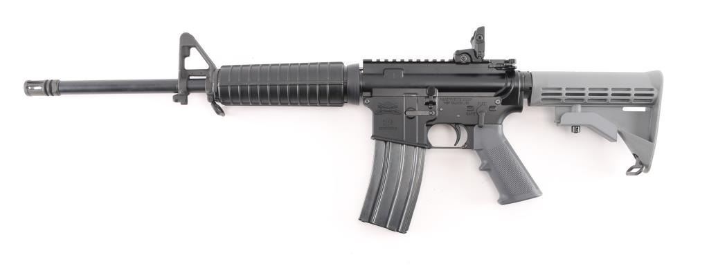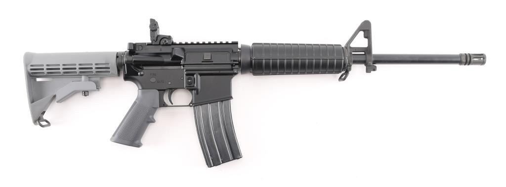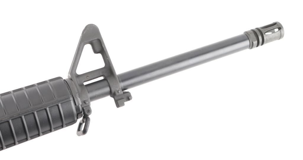 American made rifle, semi-automatic, black Nitride finish, approximately 16" barrel with birdcage flash suppressor, M4 barrel profile, bore is dark, adjustable post front sight, adjustable and folding peep rear sight, M4 receiver type with charging handle and forward assist, dust cover, A2-style handguards approximately 6" long, forged lowers are made using 7075-T6 aluminum and are marked "MULTI" for caliber, lower finish is hardcoat anodize, carbine length buffer tube with six adjustment positions, gray shoulder stock, magazine. Rifle exhibits nearly all of its original finish showing very little wear. Includes original box, black shoulder stock, MBUS front and rear sights and hex key wrench. Condition is near NRA Perfect Modern Firearm