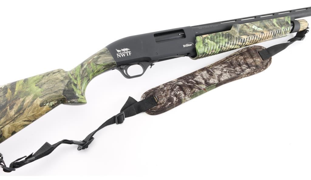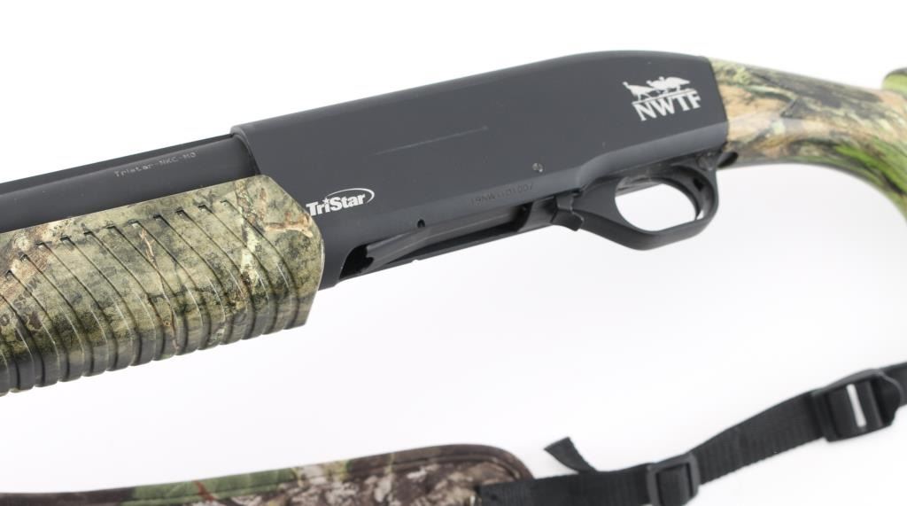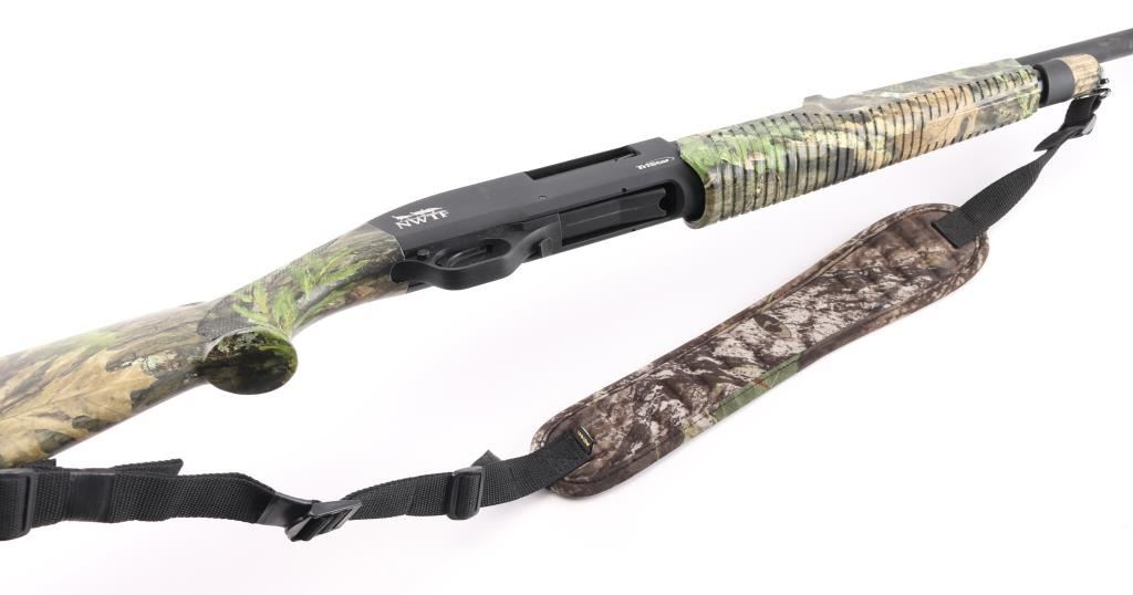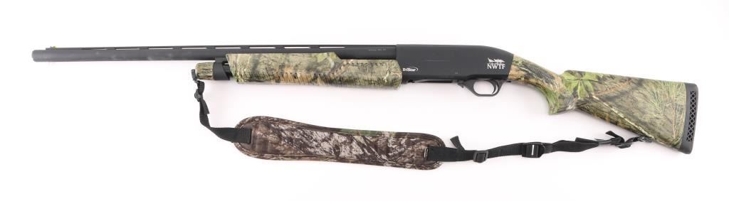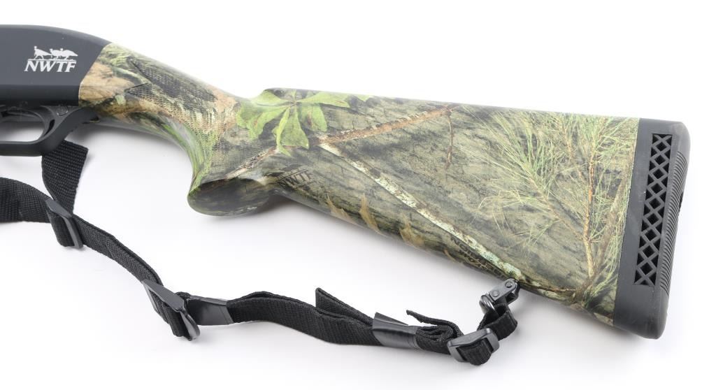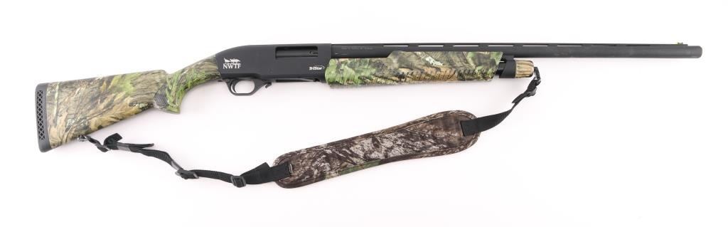 "NWTF Special Edition" Turkish made slide action shotgun chambered for 3" or shorter 12 Gauge shells. Features a matte black finish, 26" barrel with ventilated sighting rib, 5 round tubular magazine, screw-in extended Tky choke, green fiber-optic front sight, integral scope rail cuts on the receiver, smooth trigger, cross-bolt safety, camouflage Allen padded slling, synthetic slide handle with camouflage finish and pistol grip shoulder stock with rubber recoil pad & 14 1/4" LOP. Shotgun exhibits approximately 98% of its original finish showing minor scuffs and handling marks. The action is mechanically sound, the bore is bright and the synthetic stocks are excellent with a few minor losses. Condition is NRA Excellent Modern Firearm
