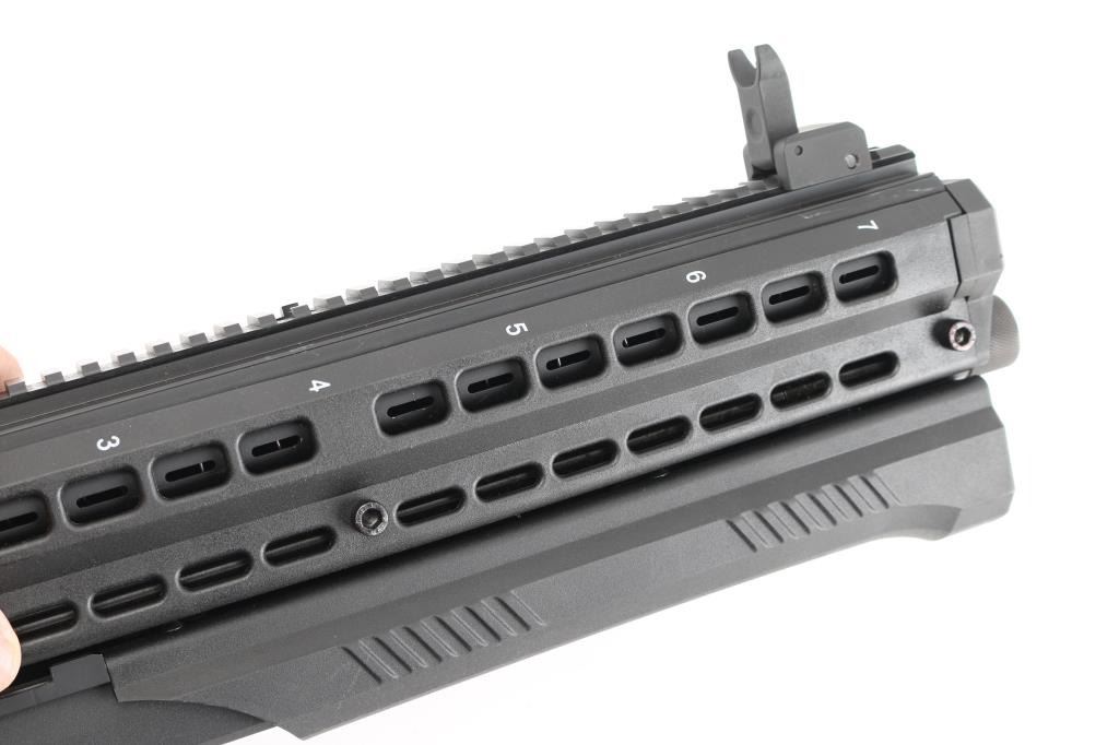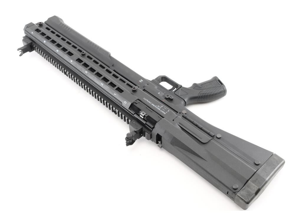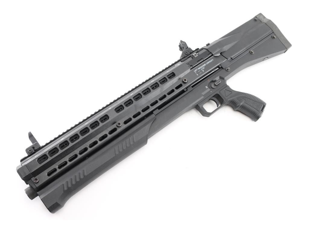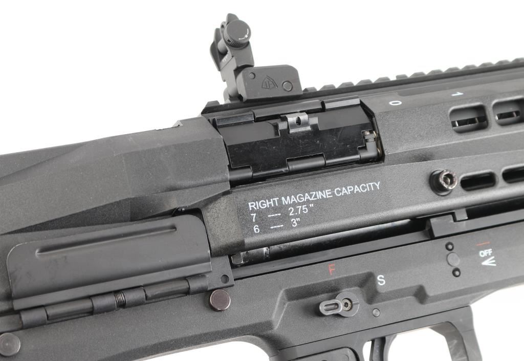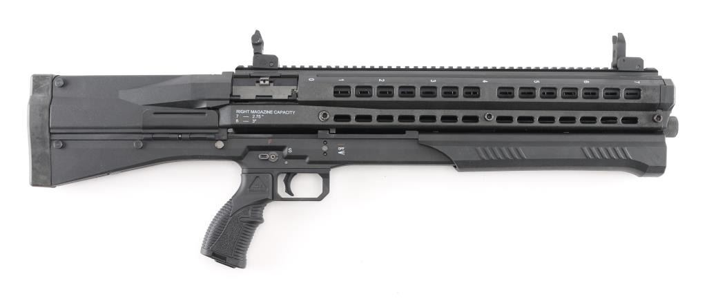 High capacity bullpup designed pump action shogun chambered for 2 3/4" or 3" 12 gauge shells. Features a matte black finish, 18.5" barrel, tactical extended cylinder choke, (2) 7 round tube magazines with snap open loading ports, flip-up ghost ring sights, ambidextrous safety, scope rail and fiber reinforced injection molded polymer body with rubber recoil pad. Includes original factory cardboard box with manual. Condition is NRA Excellent. Modern Firearm.