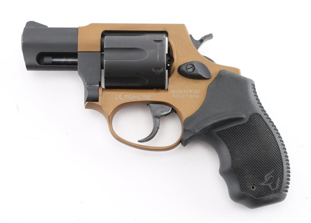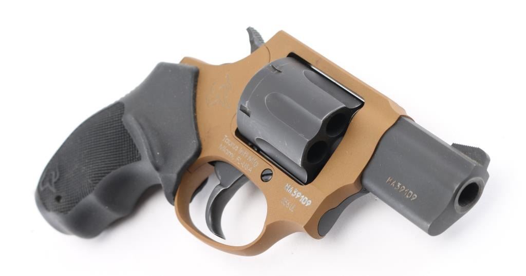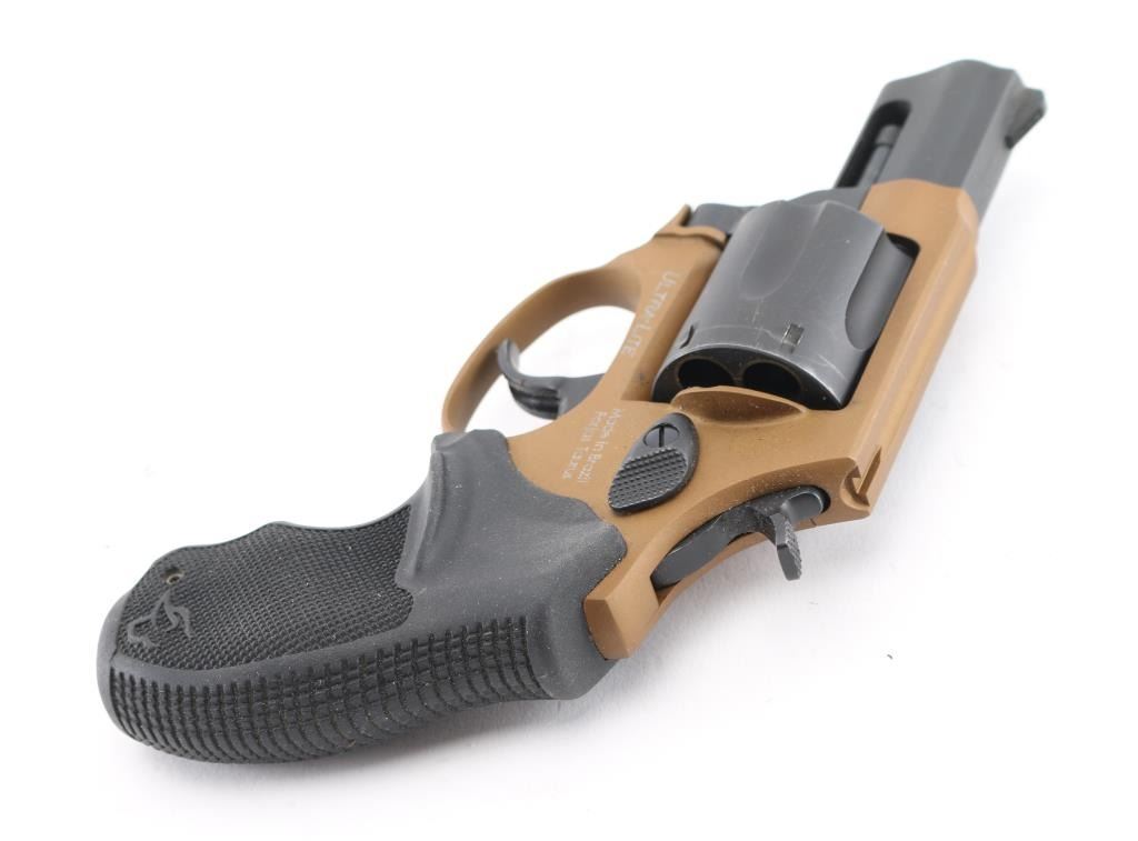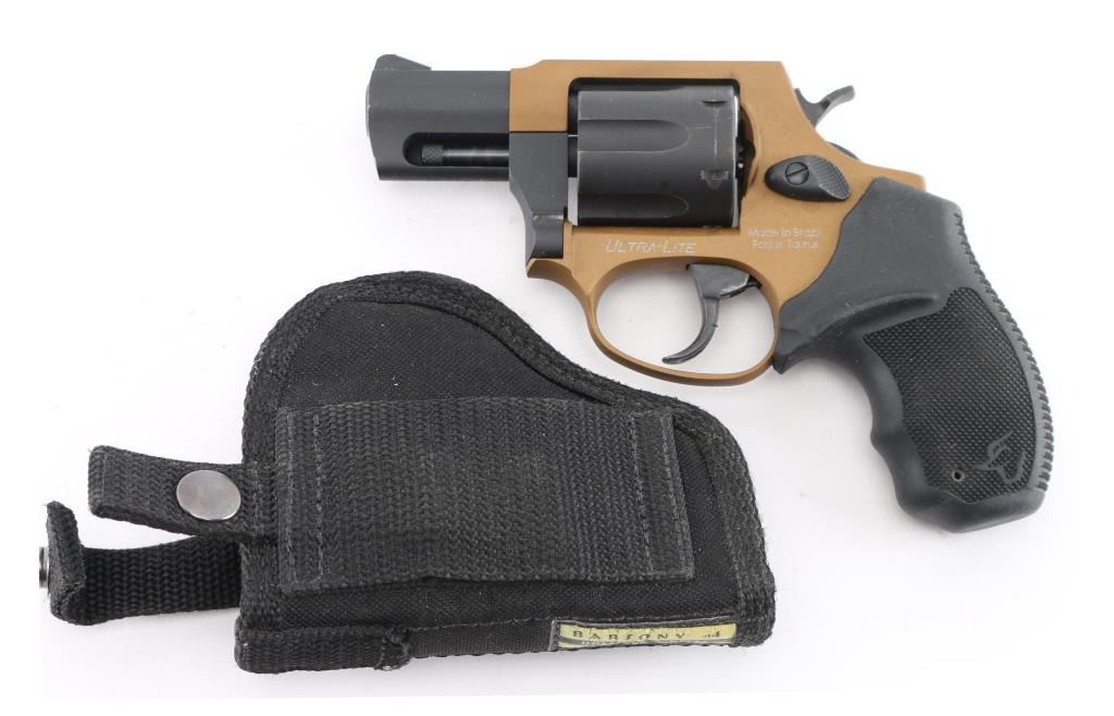 Brazilian made, single/double action, six-shot ultra-light revolver, aluminum alloy frame, steel barrel and cylinder, barrel is approximately 2", bore and cylinders are bright, serrated ramp front sight, notch rear sight integral with the top strap, checkered hammer spur and cylinder release, smooth trigger, textured rubber one-piece grip, scratches and rub marks on cylinder, small scratches on barrel. The frame has been painted gold while the barrel and cylinder are painted black. Includes a Bartony black nylon holster. **NRA Very Good** Modern Firearm