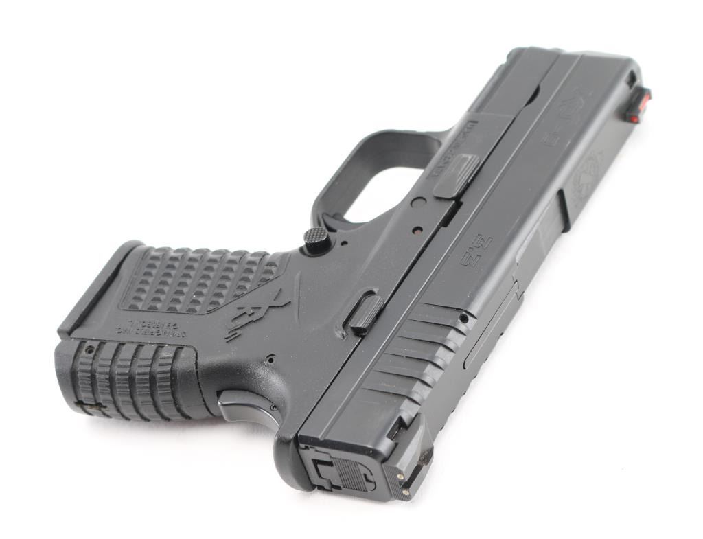 Croatian made pistol, semi-automatic, black polymer frame and steel slide with a Melonite finish, Springfield Armory - Croatia crest is crisp on top of the slide, approximately 3" barrel, bore is bright, snag-free dovetailed sights, red fiber optic front sight, notch rear sight with two white dots, integral Picatinny rail system, no hammer spur, loaded chamber indicator, safety is in the trigger, grip safety, textured grip, interchangeable backstrap, ambidextrous magazine release, seven-round magazine. Pistol exhibits nearly all of its original finish showing very little wear. Includes case, instruction manual, black nylon holster, extra backstrap, spacer for an extended magazine, two extra extended magazines - one by Springfield and one by ProMag. cleaning rod, padlock with two keys. Condition is near NRA Perfect Modern Firearm