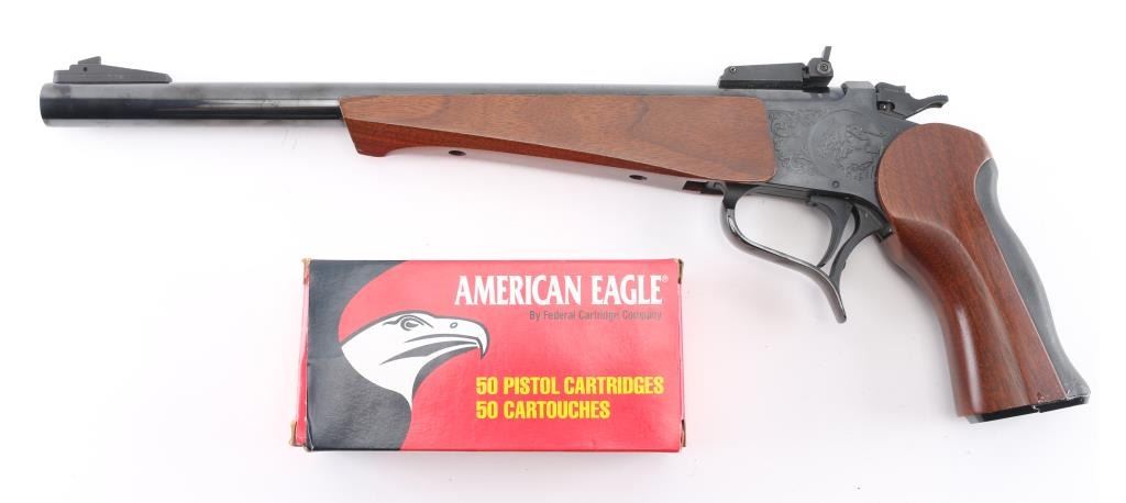 This Thompson Center "Contender" has super 14" blued round break action barrel, raised ramp front sight, fully adjustable rear and serrated hammer spur. Centerfire, rimfire selector on the spur. It has the engraved Puma on both sides of the receiver and walnut grips and forearm. Metal finish looks great with little sign of handling. Wood looks great. Bore looks great, bright. The plastic grip cap is cracked & repaired with glue. Comes with a 50-rd box of American eagle 240 Grain jacketed hollow point bullets. NRA Condition-Very Good. Modern Firearm.
