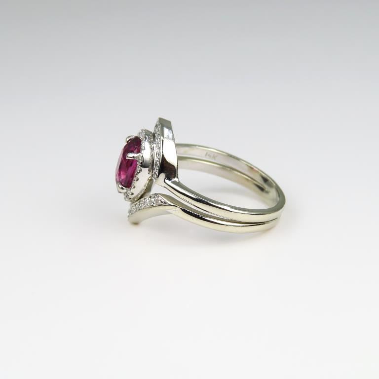 Ring featuring an oval cut Raspberry Red Tourmaline weighing approx. 1.80 carats accented with 46 round ‘IDEAL’ cut Diamonds weighing approx. 0.50 carats with G-H colors and VS clarity set in a beautiful 14 karat white gold setting. Size 6 1/4.