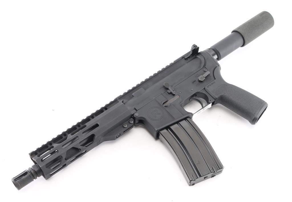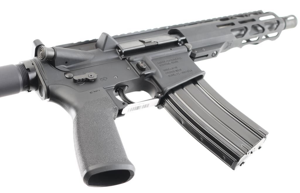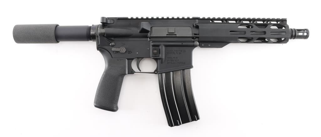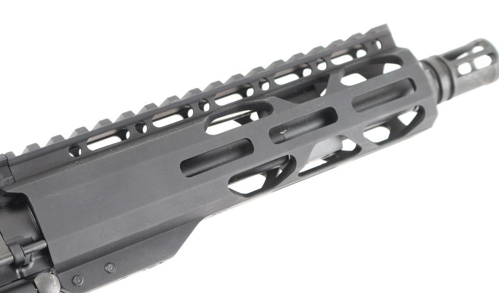 SN: 21-007846. American made handgun, 8" barrel with A2 flash hider, matte black finish, MFT pistol grip, M-Lok RPR handguard, black foam on buffer tube, forward assist, shell deflector, Comes with (1) 30-rd metal magazine, in a factory cardboard box w/foam lining, manual and lock. NRA Condition is Excellent. Modern Firearm.
