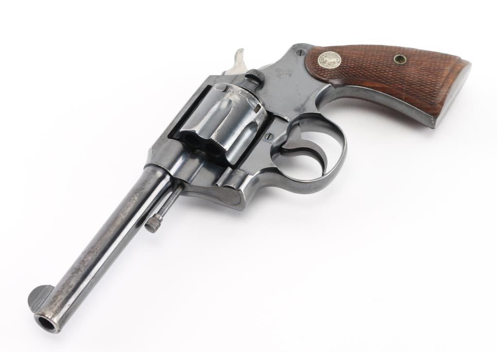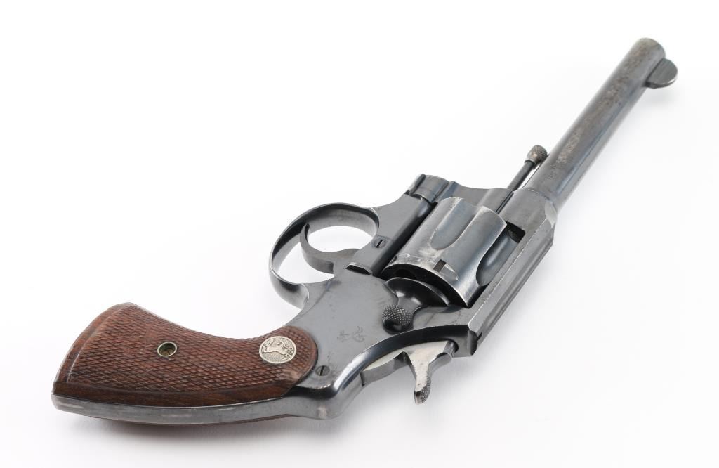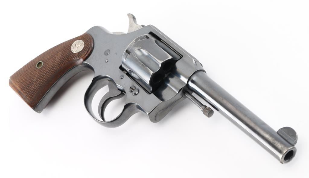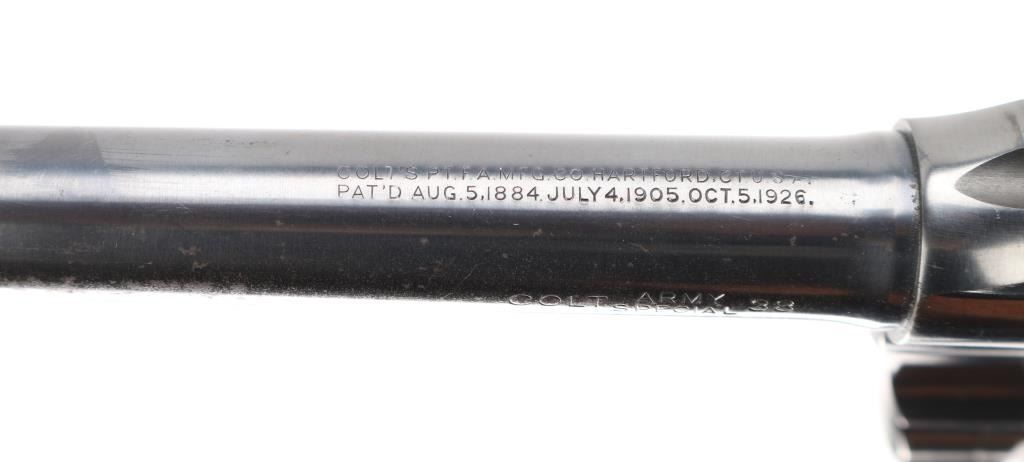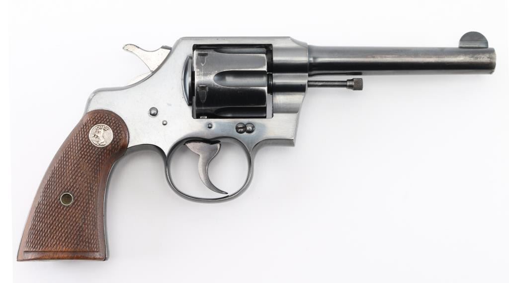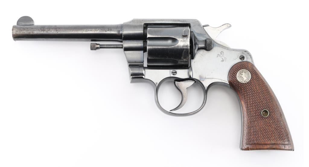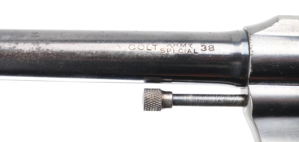 Revolver, double-action. 6-rd capacity. Built on the E frame. 5" round barrel. Round front sight blade, with notch cut rear sight. Exposed extractor rod. High-polish blued metal finish. 2-line Colt address, and patent dates on top of the Barrel. "Colt Army Special" on left side of barrel. Checkered, diamond, hardwood grips. This revolver was manufactured in 1926. Metal finish shows a little age with some loss of finish on the barrel, frame and cylinder. There is also a ding on the bottom of the barrel at the muzzle. Bore looks good, a little dirty but in good shape. Grips are fine for there age, no chips or cracks but checkering is fairly smooth. It is 97 years old and seems to function just fine. Condition is NRA Good. *C&R Firearm*
