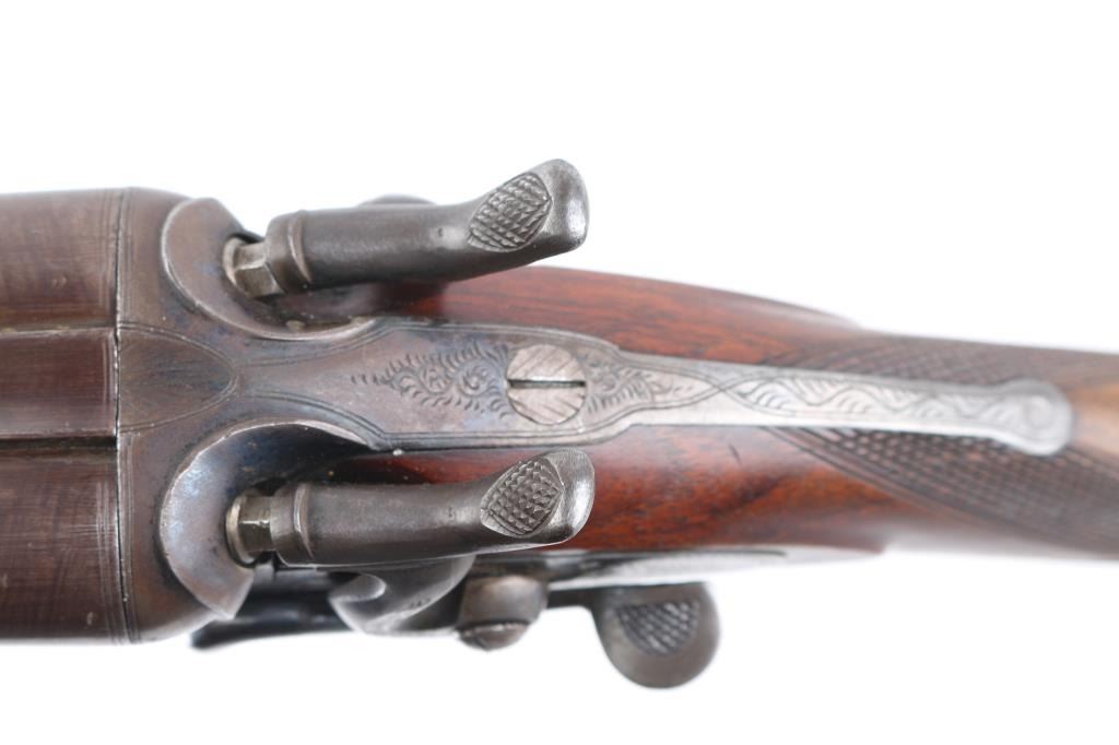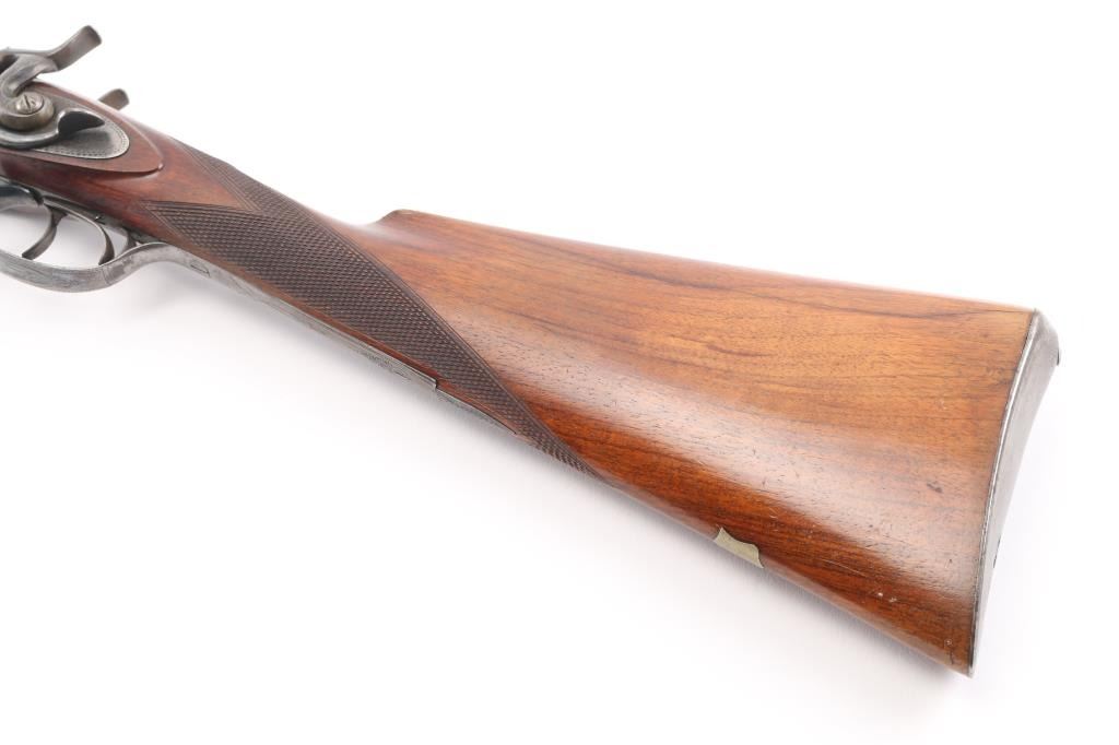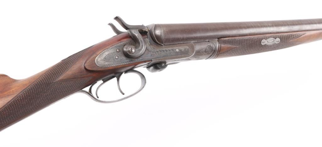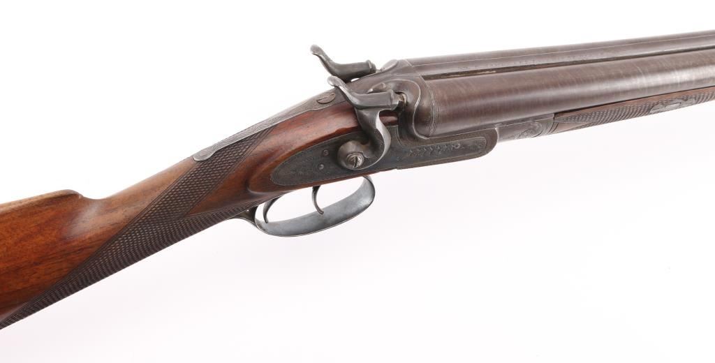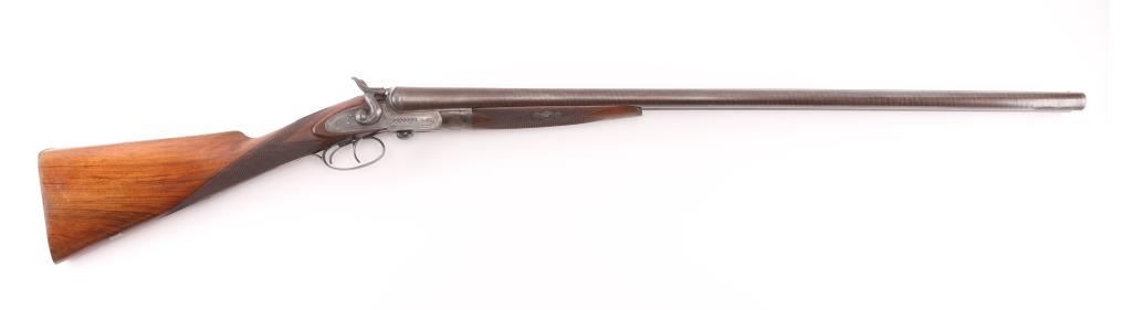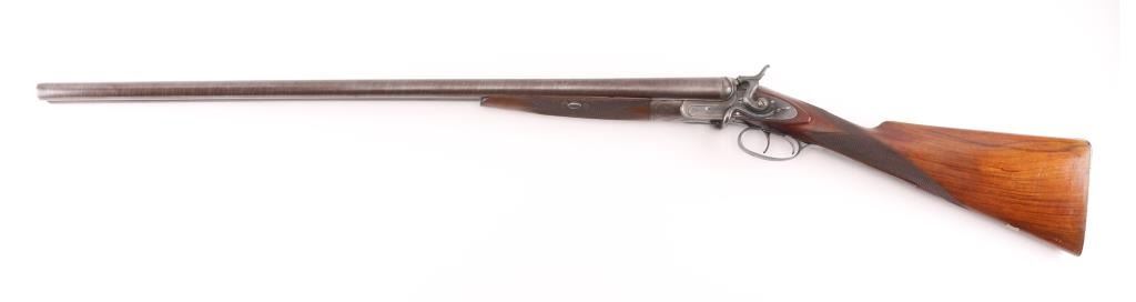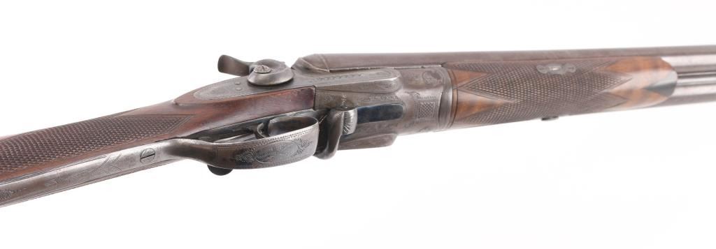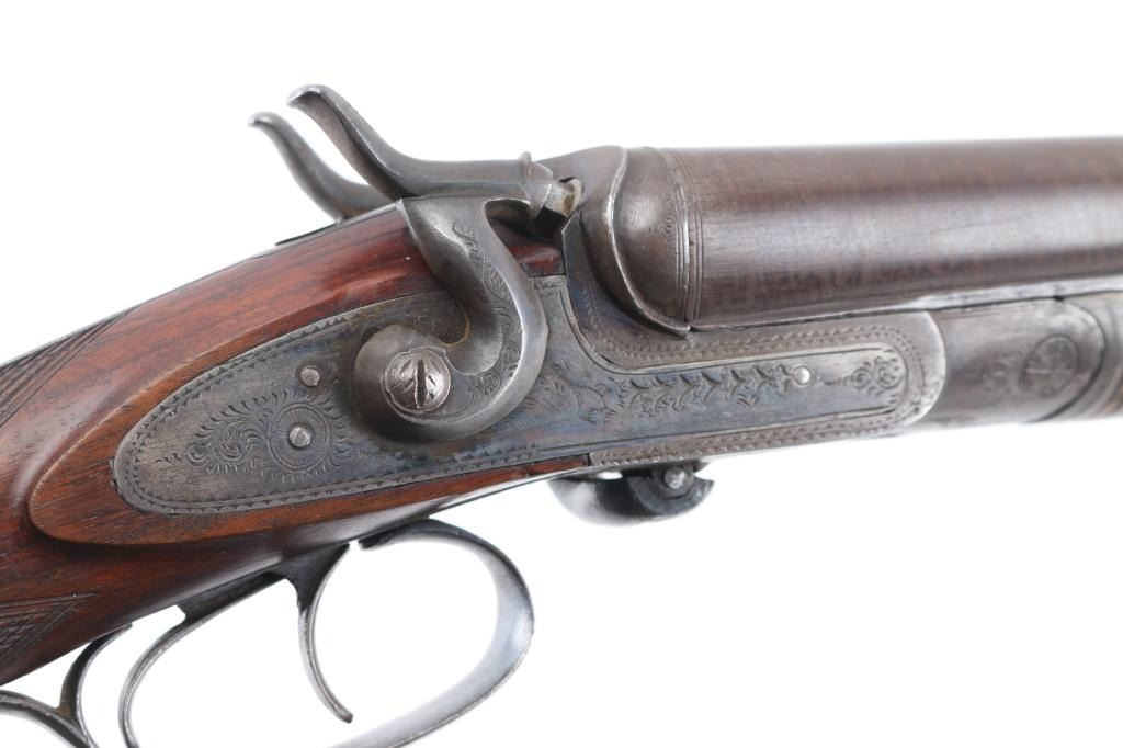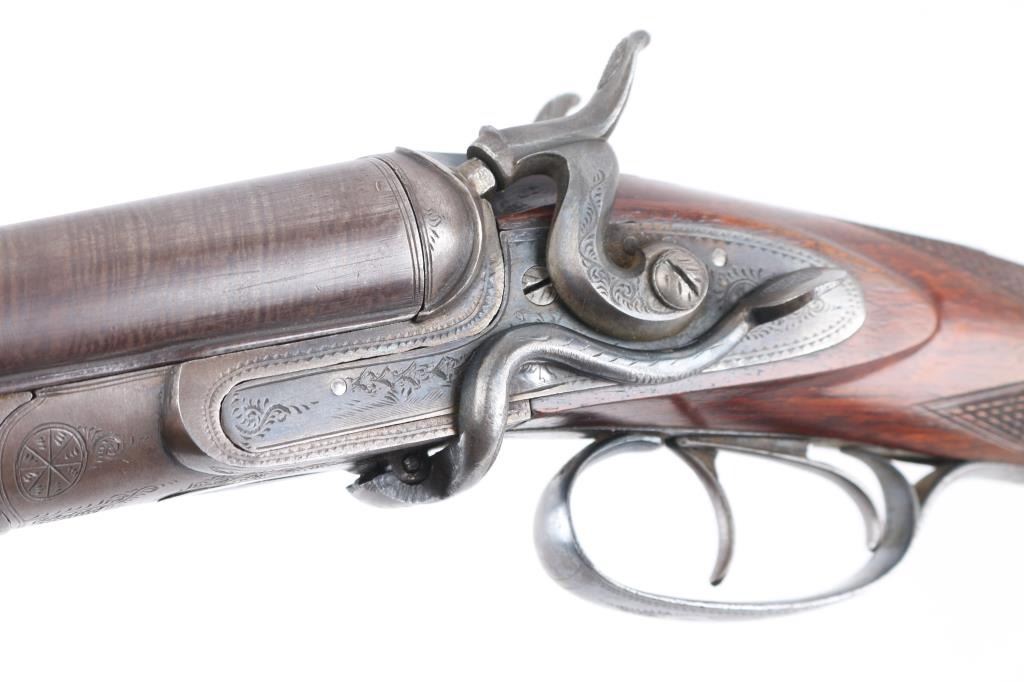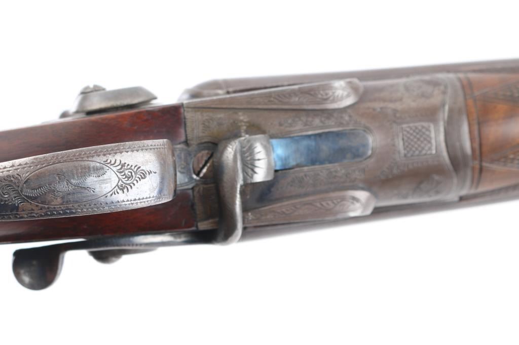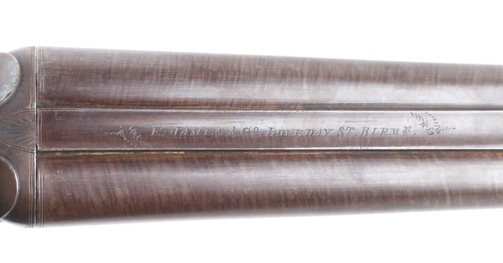 SN: 8006. Enos James was a gun maker located in Birmingham, England circa 1880-1889. James made good quality muzzle loading and breech loading shotguns. A large number of James shotguns were imported to the USA by several American distributors including Lamberson, Furman & Co. in 1887 and H & D Folsom in 1889. This is a quality breech loading shotgun, 30" Damascus barrels, rib marked "E. James & Co. Loveday St. Birm.". Exposed hammers, double triggers. left mount\ed side lever, engraved with fowls on right lock, and triggerguard, steel butt plate. Horn forearm tip. Bores are very good/bright. , traces of blue present, action is crisp/tight, checkered wood stock, & forearm are excellent. markings are crisp clear. Birmingham proofed. Chokes measure Modified, LOP is 14" NRA Condition-Very Good+ as Antique Firearm.