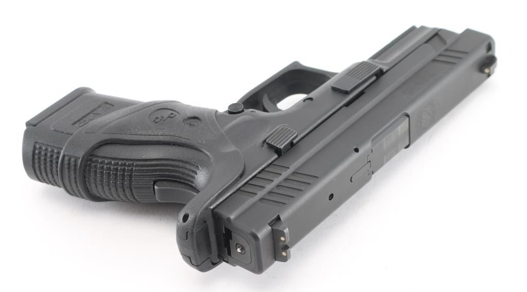 Semi-auto, striker fired, pistol chambered for 9x19mm ammunition. It has a stainless slide, synthetic frame, safety trigger, grip safety, dovetailed three dot sights, and an accessory rail. It comes with the original hard case, holster, mag holder, speed loader, owners manual, and lock. It also comes with a Crimson Trace grip laser, (it works) and the owners manual. Metal finish looks great. Frame is great. Bore looks new. Condition is NRA Excellent+ *Modern Firearm*